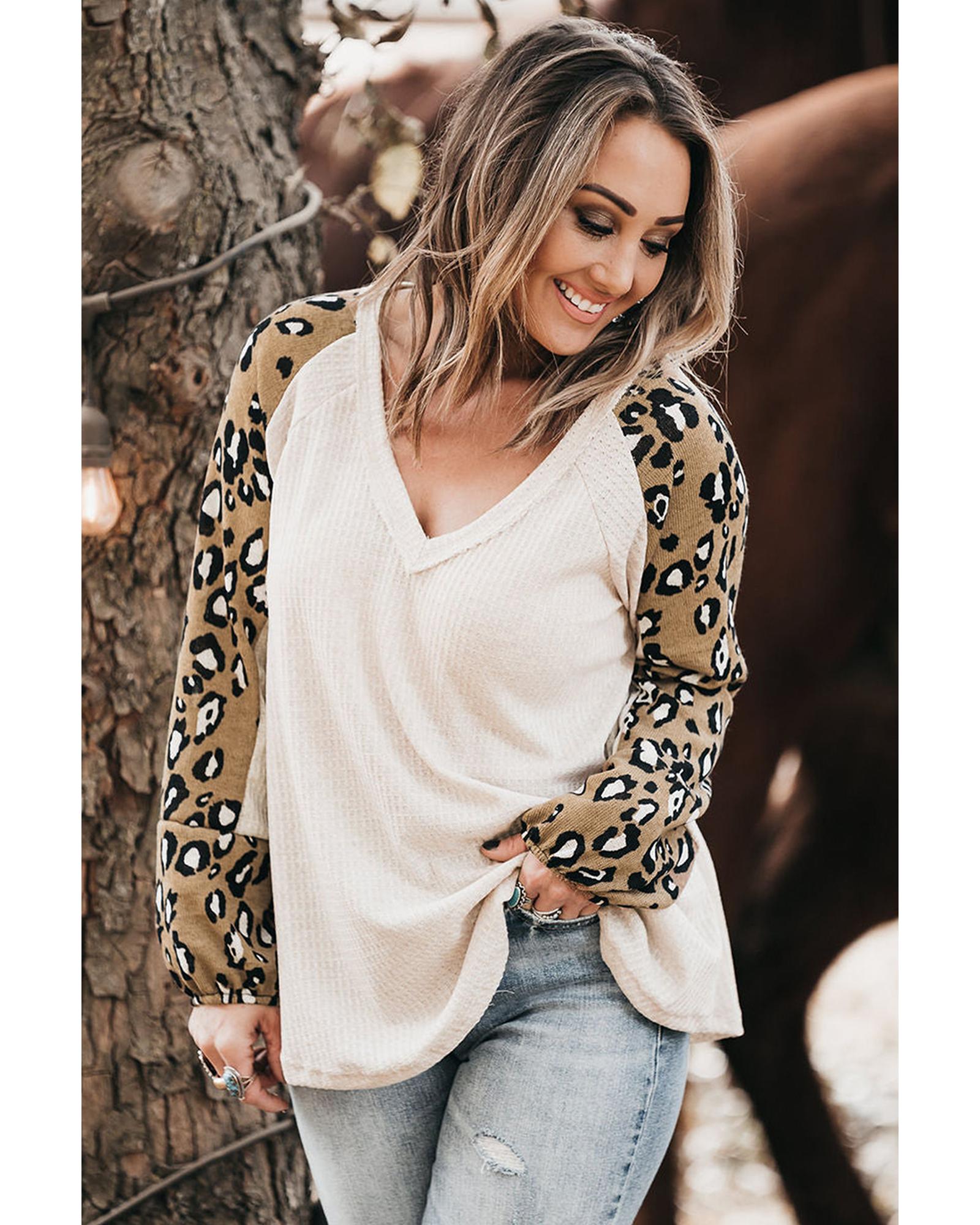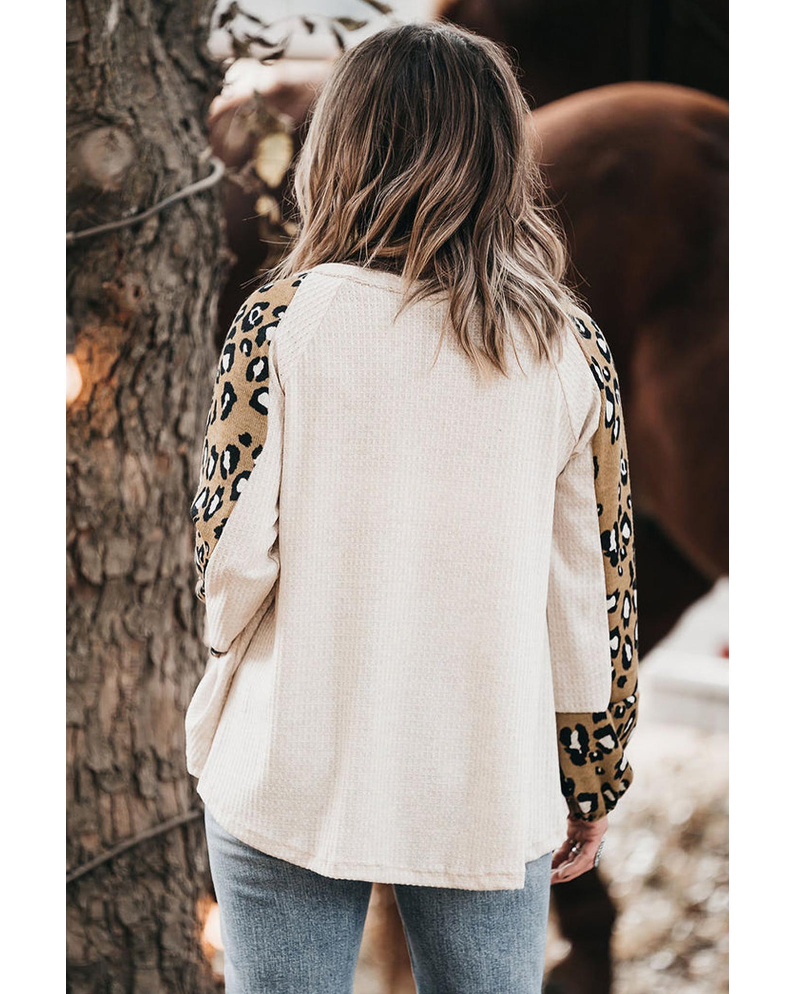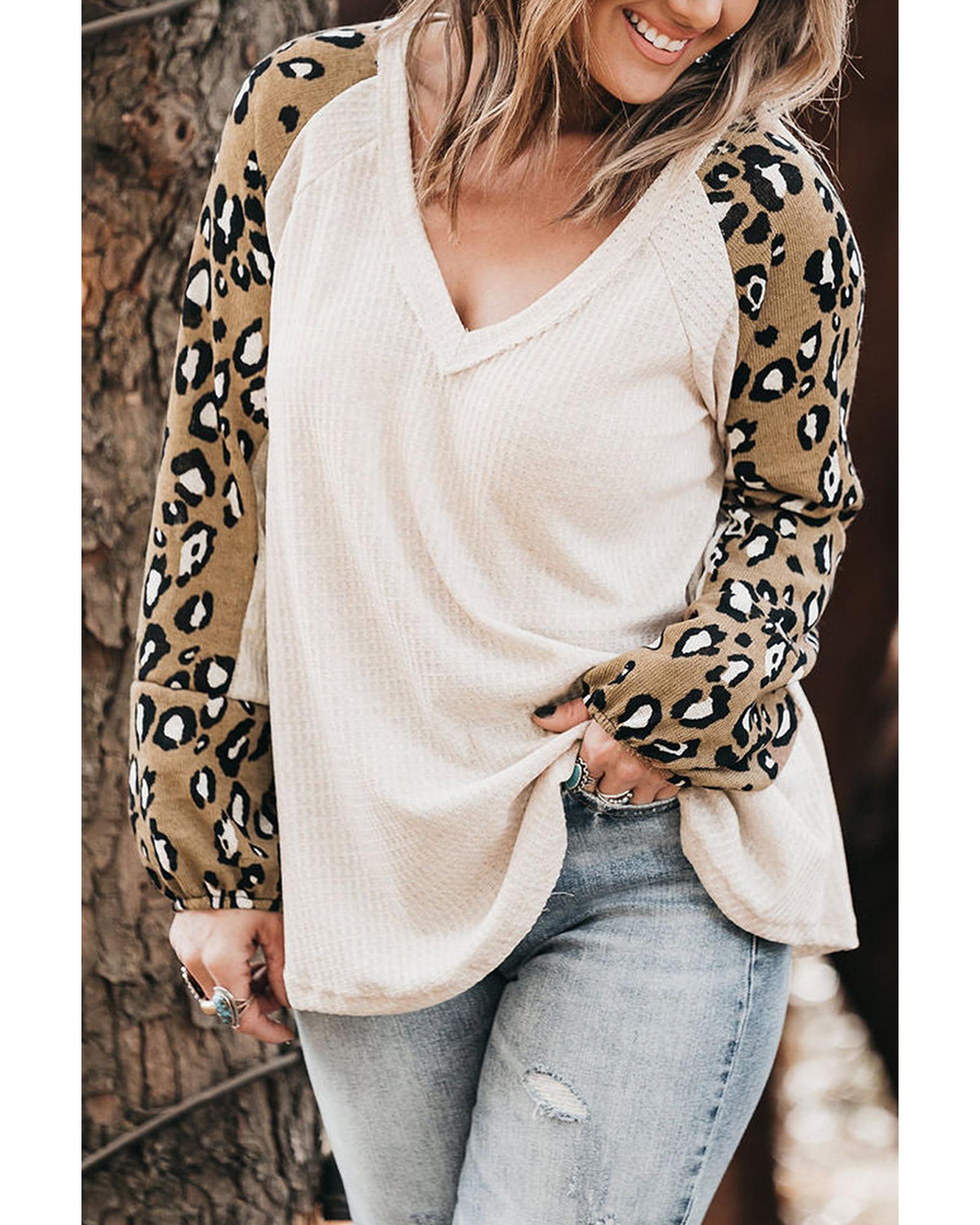 Beige Printed Plus Size Waffle Knit Contrast Leopard Long Sleeve Top – 3X