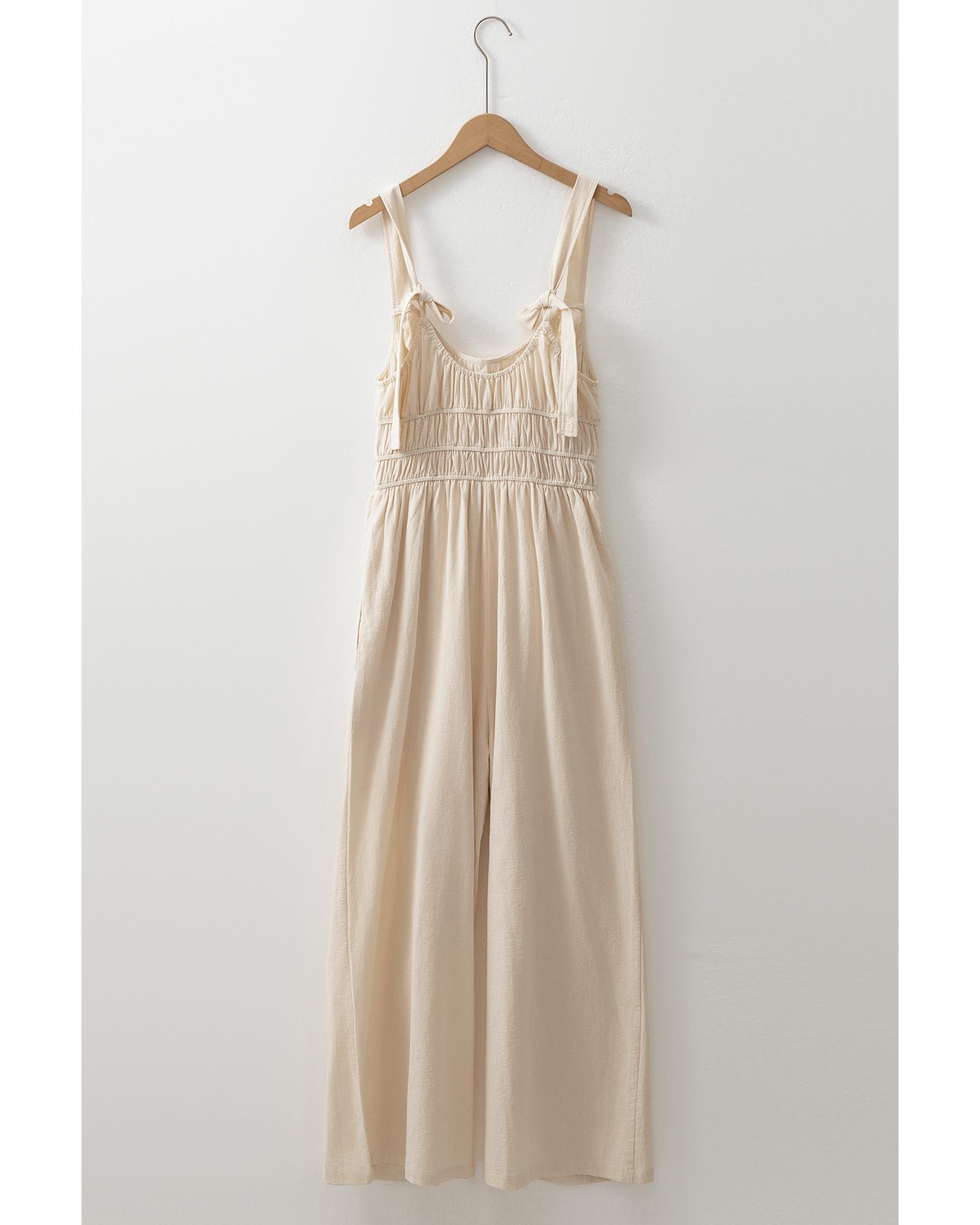 - Beige ruched high waist sleeveless wide leg jumpsuit