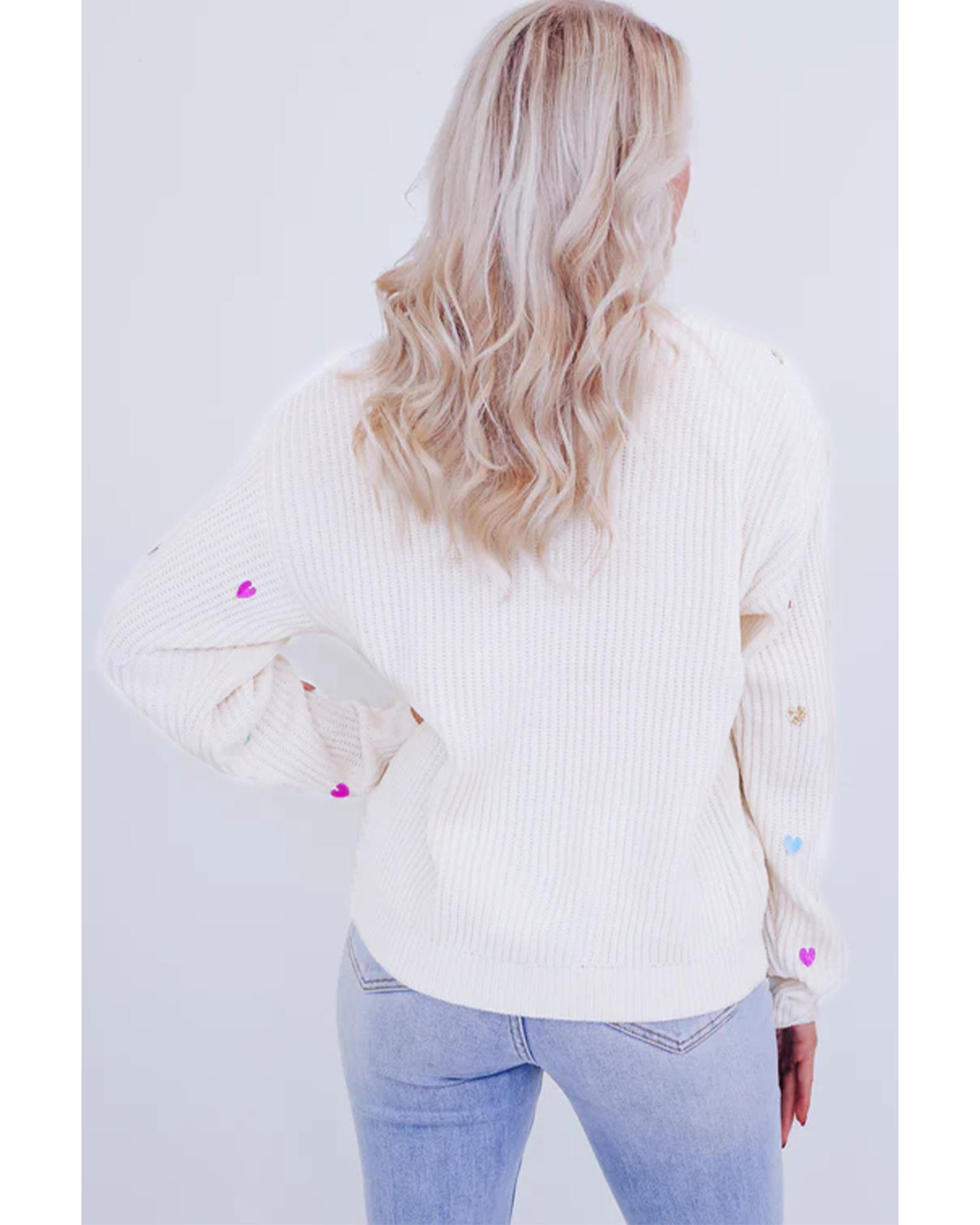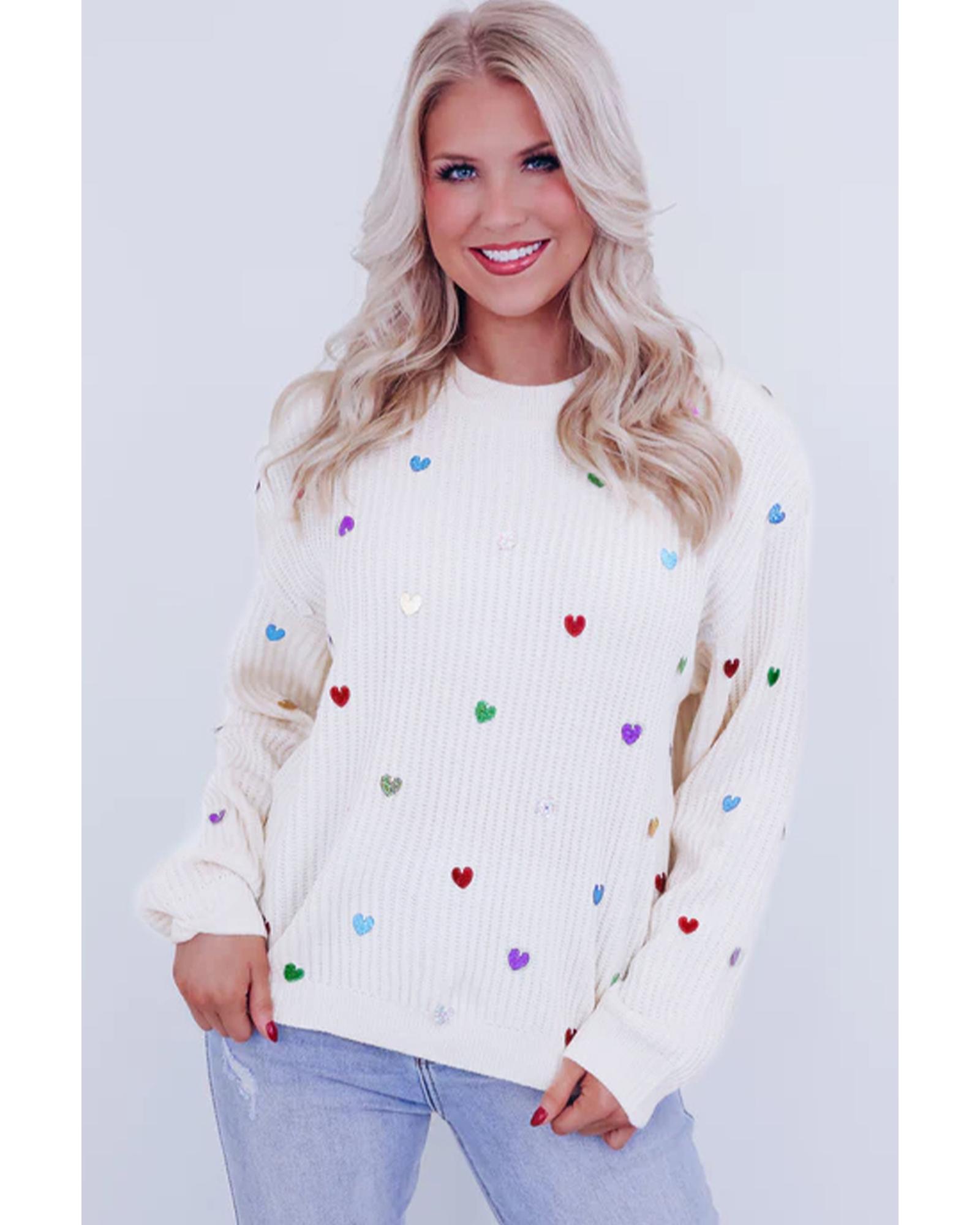 Beige Sequin Heart Shape Waffle Knit Round Neck Sweater – L
