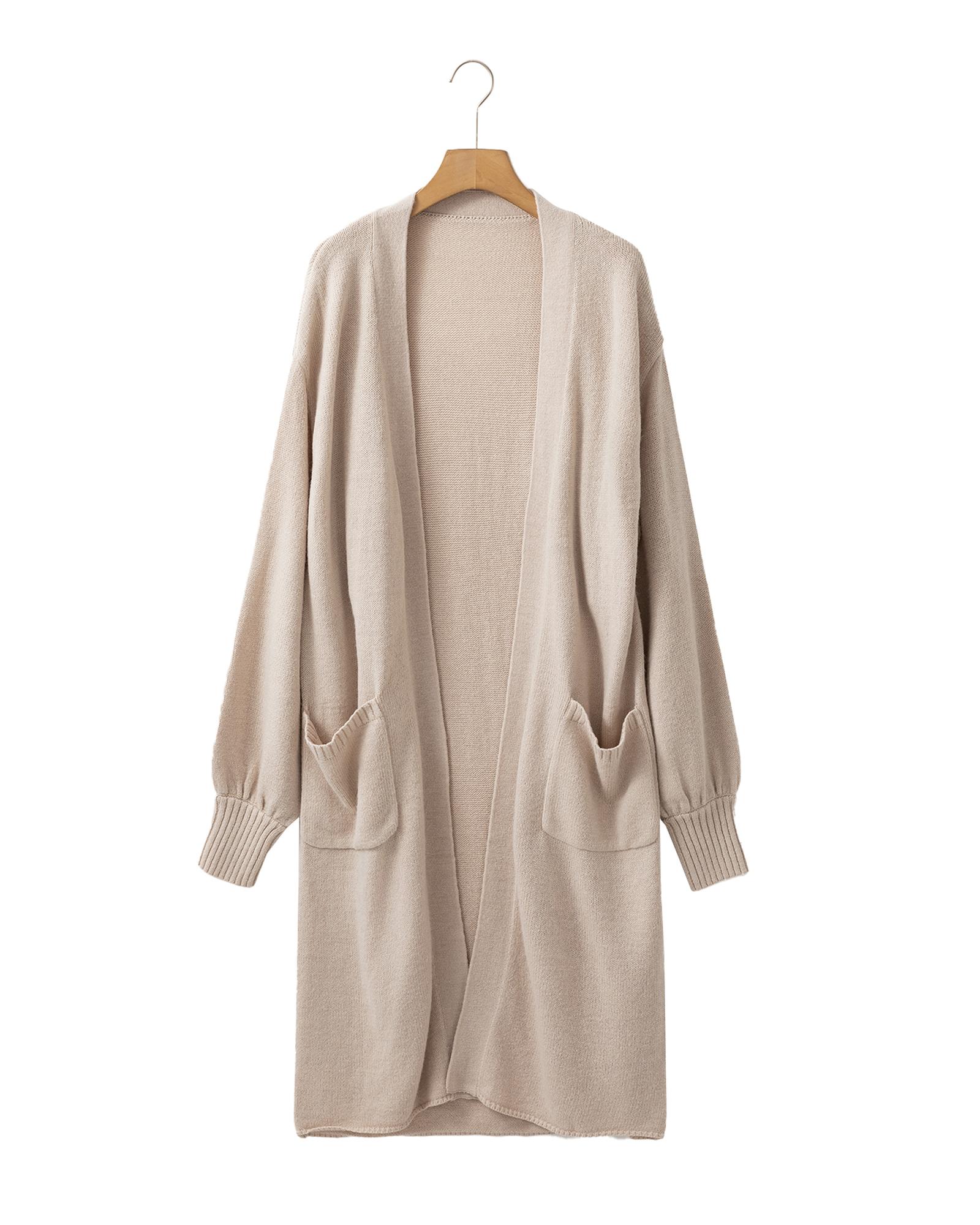 - Beige Side Pockets Open Front Long Knitted Cardigan