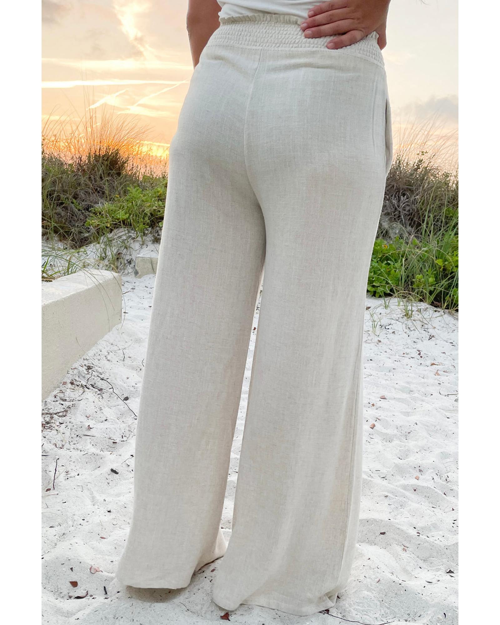 Beige Smocked High Waist Wide Leg Plus Size Pants – 4X