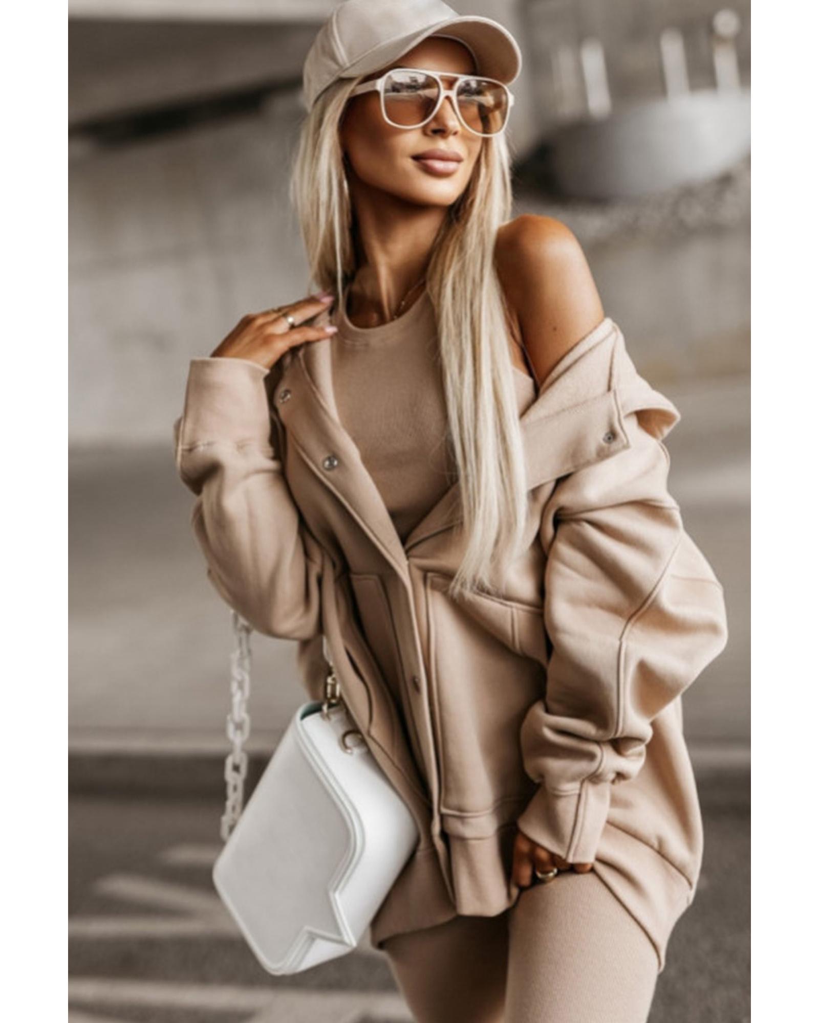 Beige Solid Color Pocketed Button Up Loose Hoodie – L