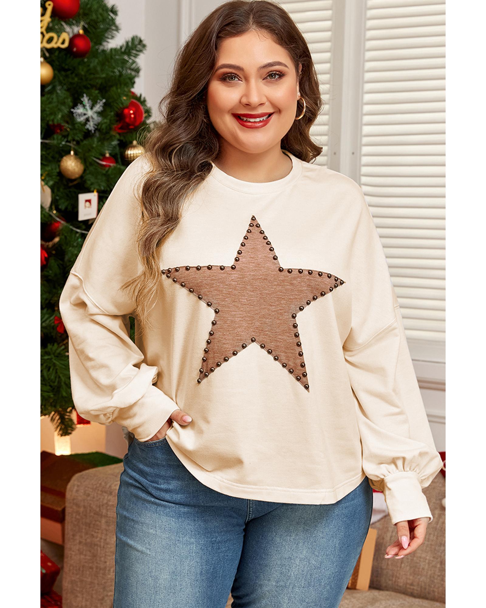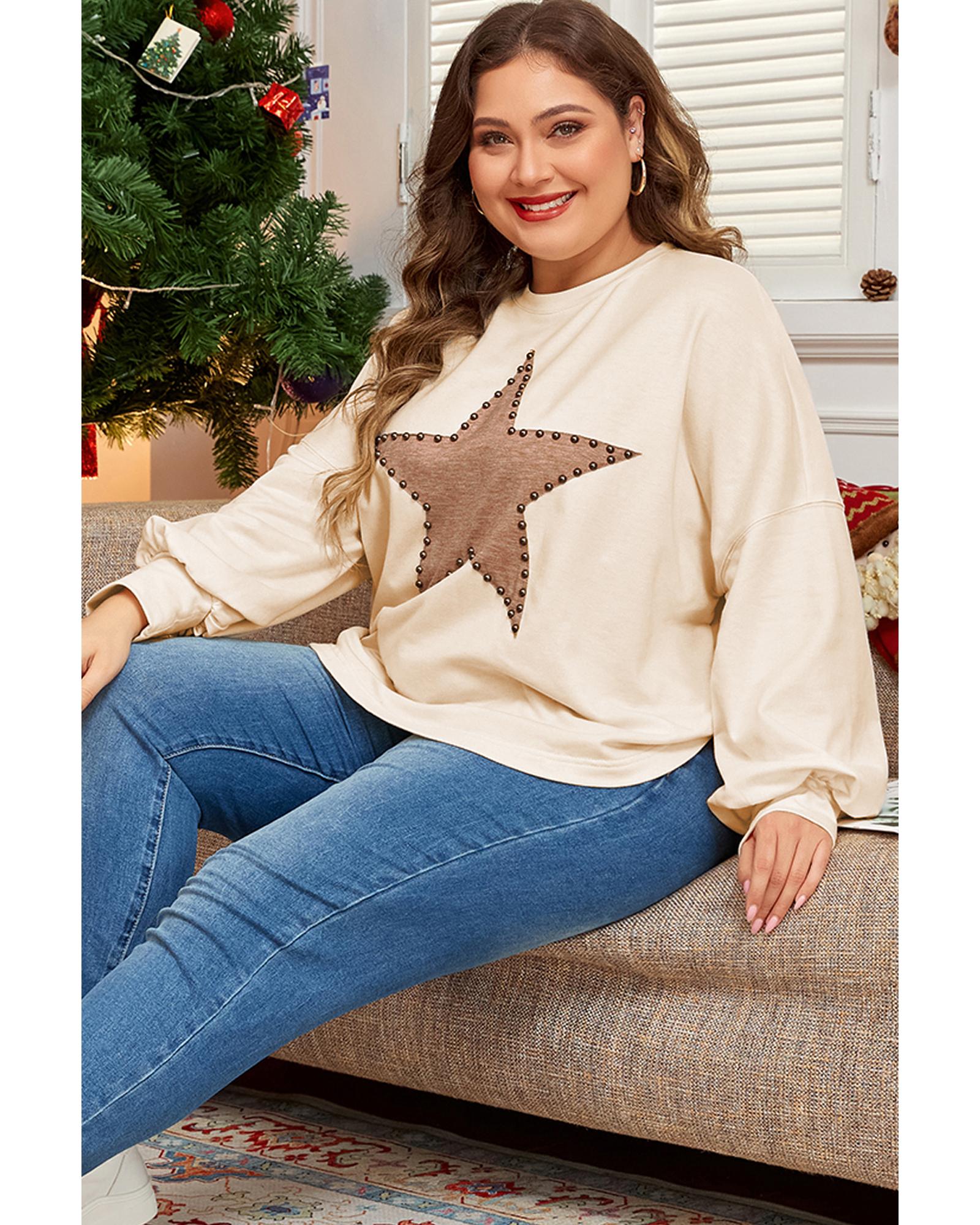Beige Star Shape Studded Crew Neck Plus Size T Shirt – 2X