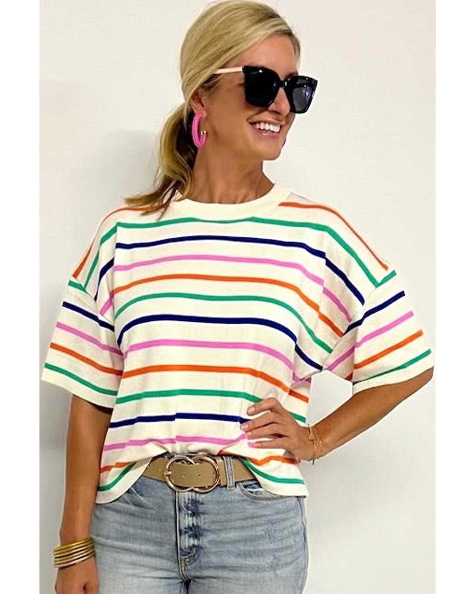 Beige Stripe Dropped Short Sleeve Boxy Fit Knitted Top – L