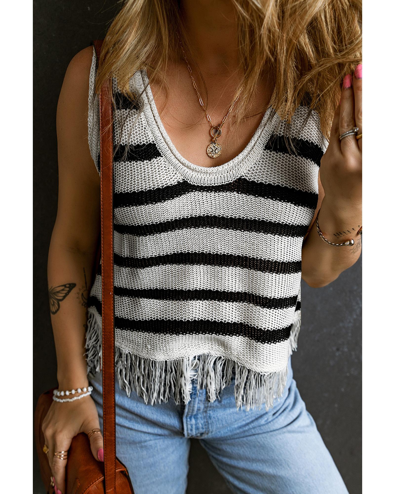 Beige Stripe Loose Knit Fringe Tank Top – XL