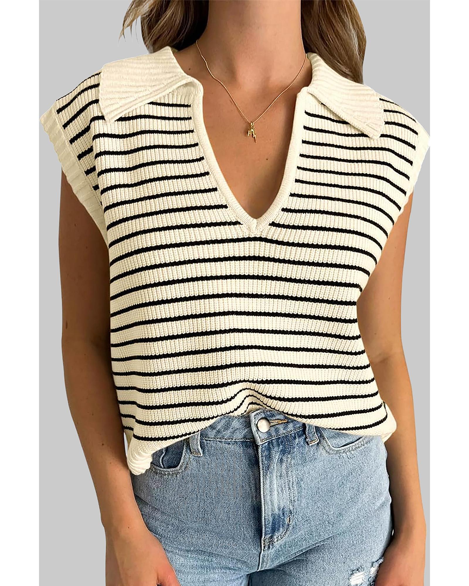 Beige Stripe Turn-down V Neck Sweater Tank Top – M