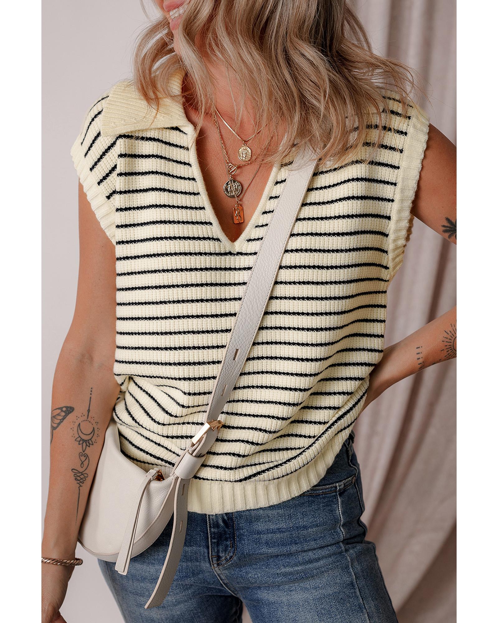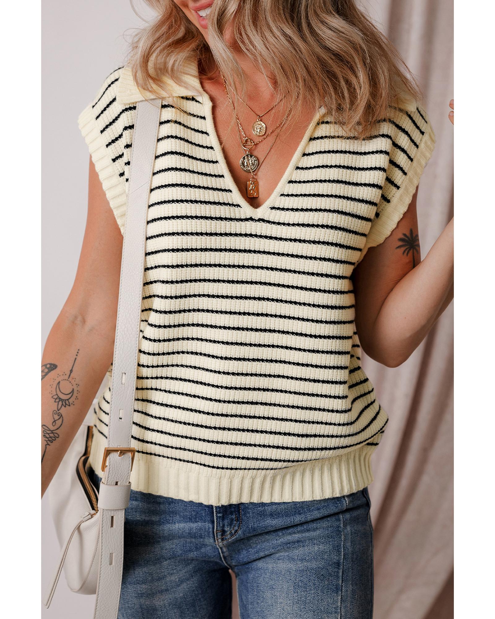 Beige Stripe Turn-down V Neck Sweater Tank Top – XL