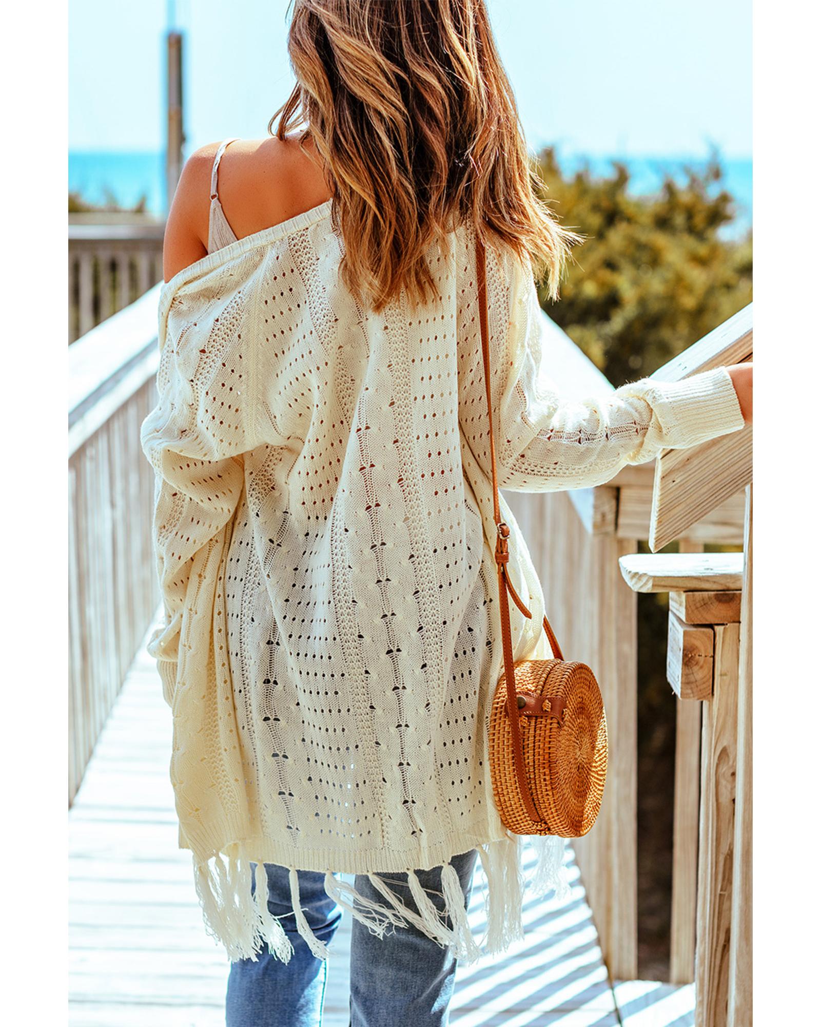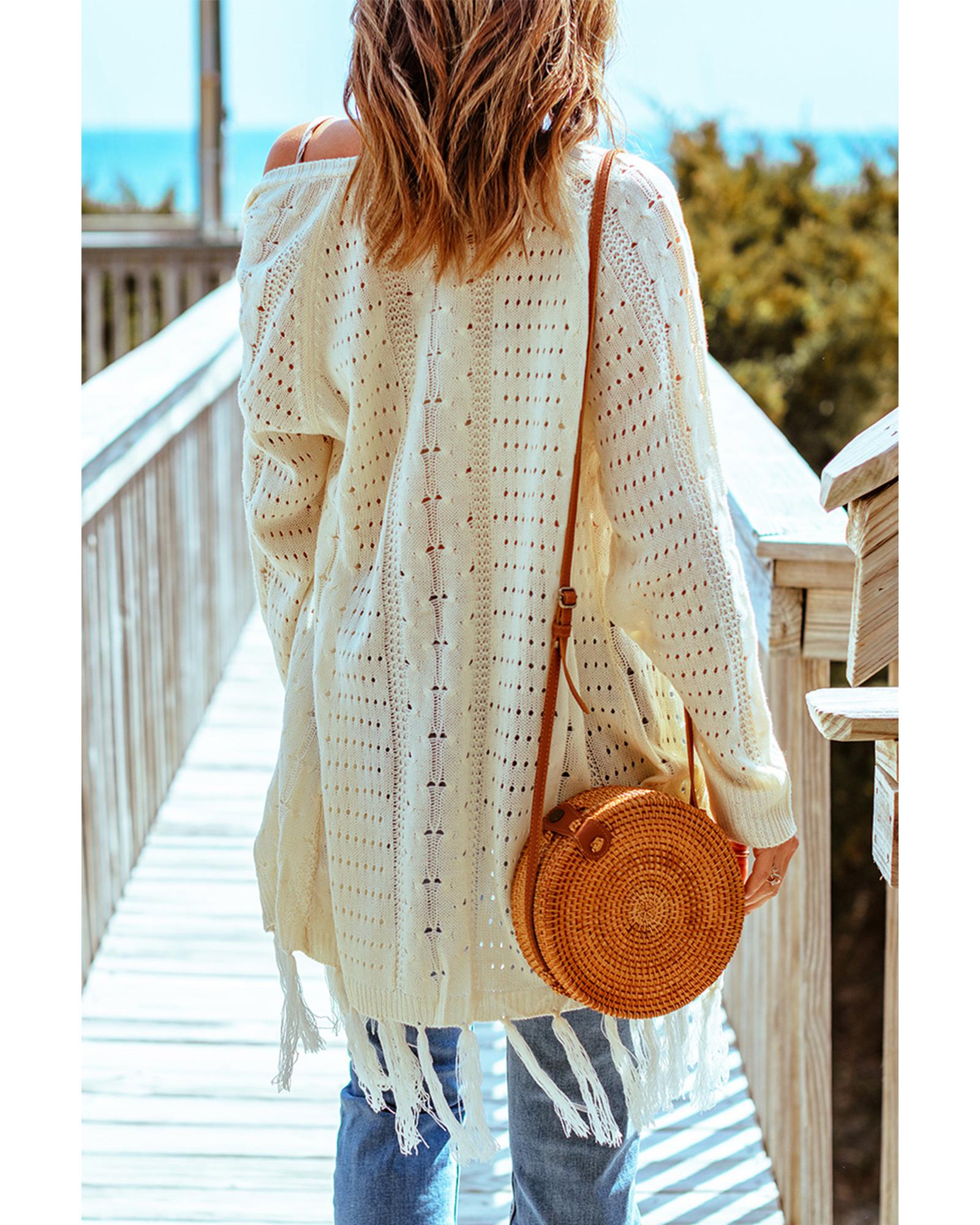 Beige Tasseled Hollow-out Cable Knit Cardigan – One Size