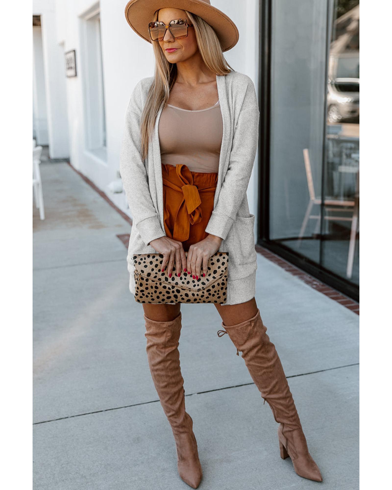 Beige Thermal Waffle Knit Pocketed Cardigan – M