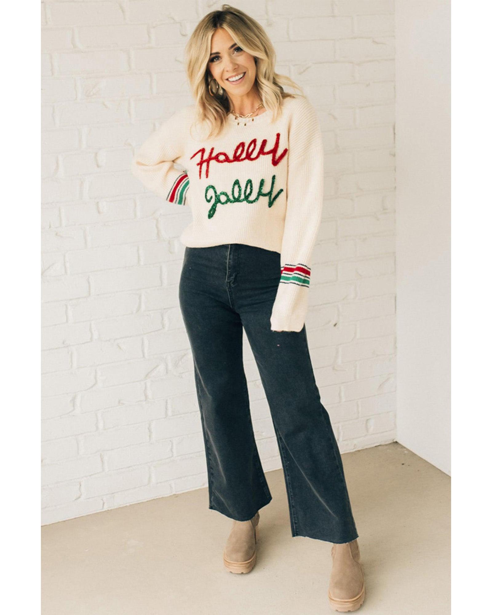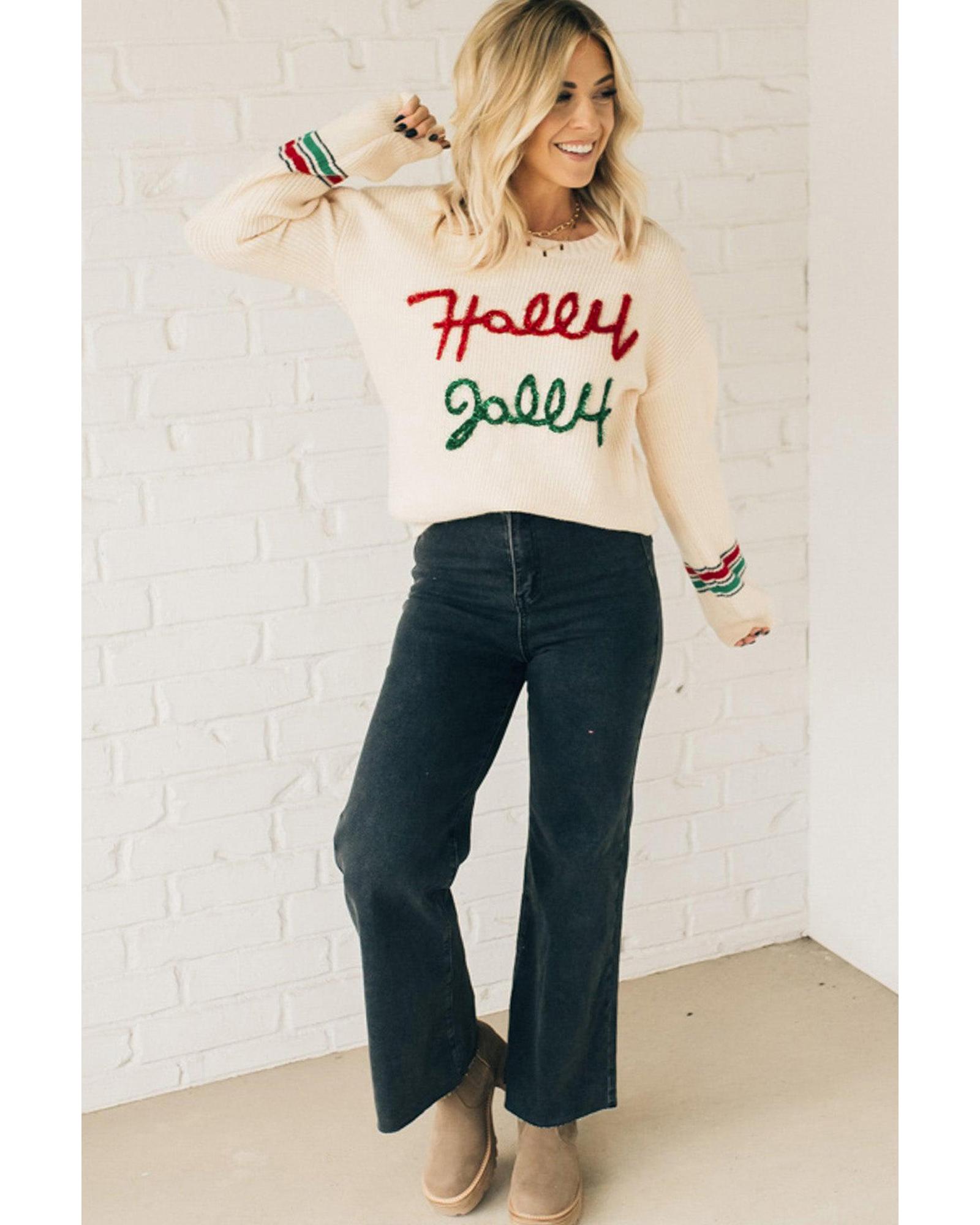 Beige Tinsel Holly Jolly Graphic Classic Sweater – S