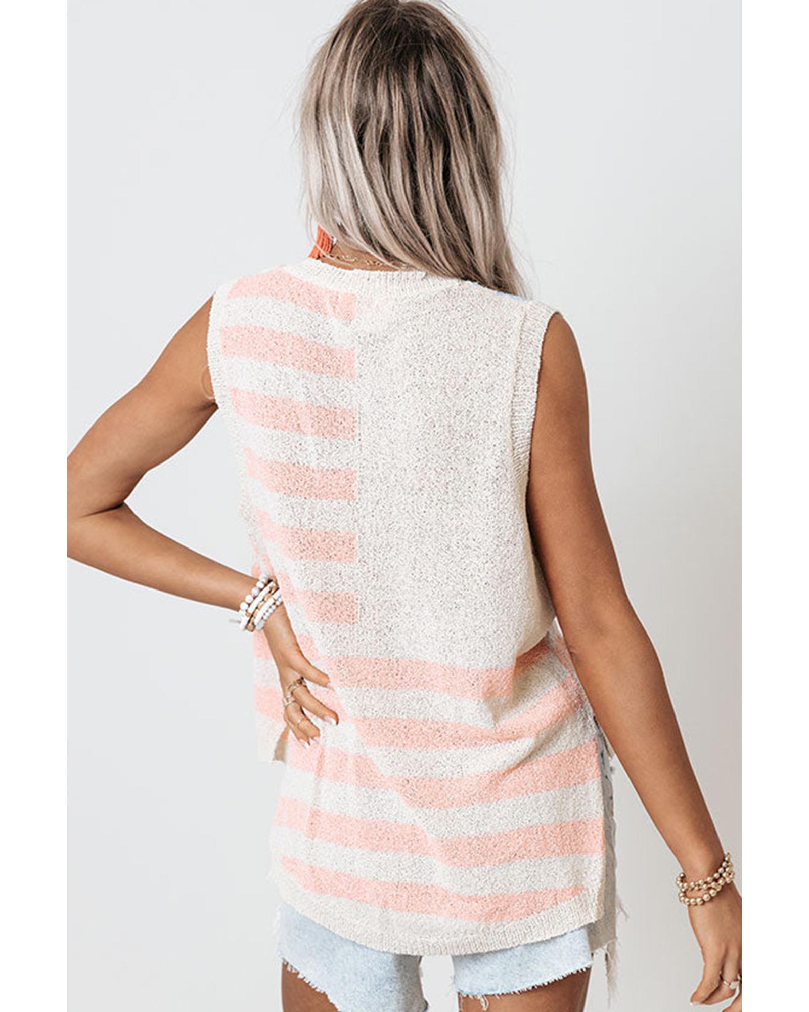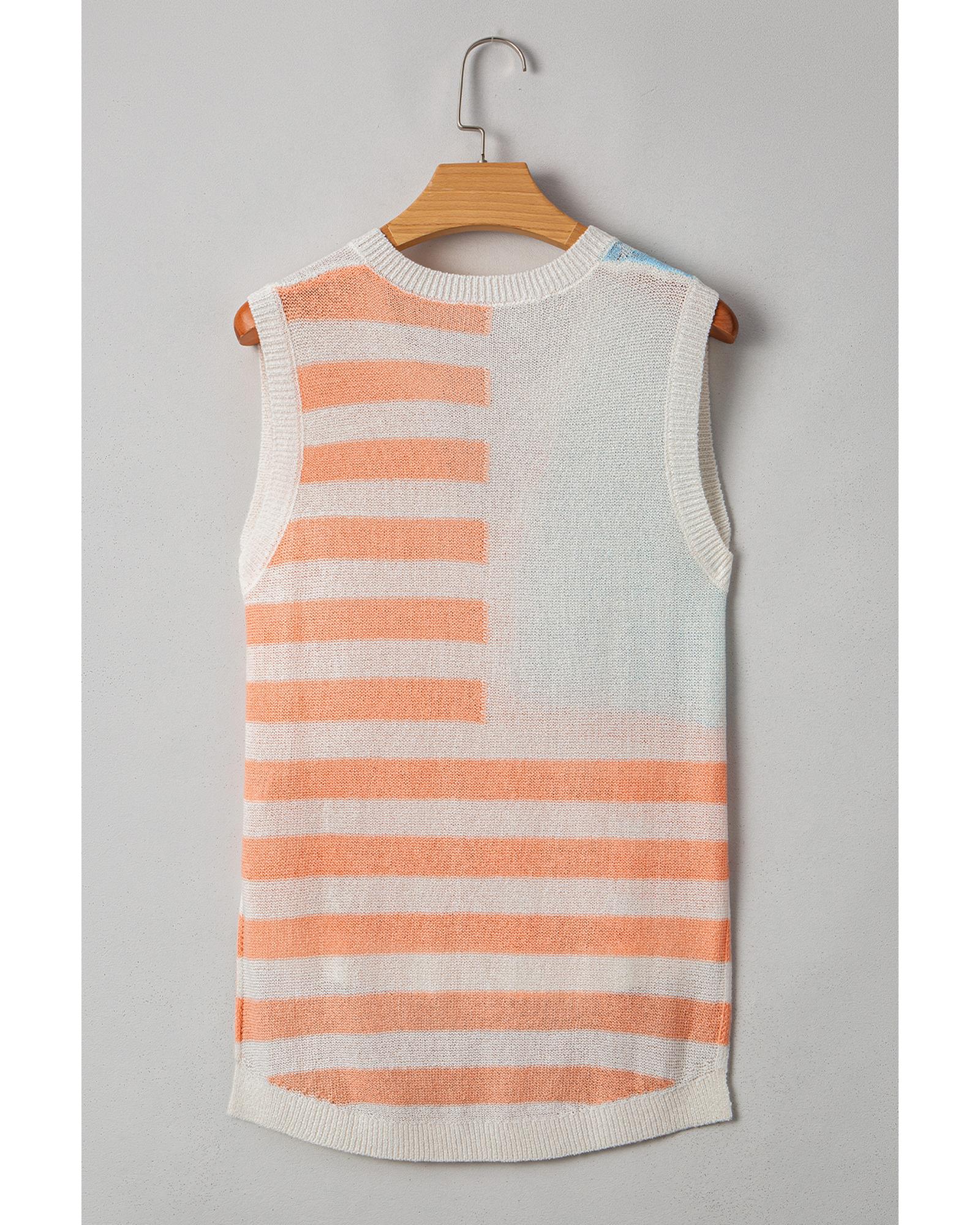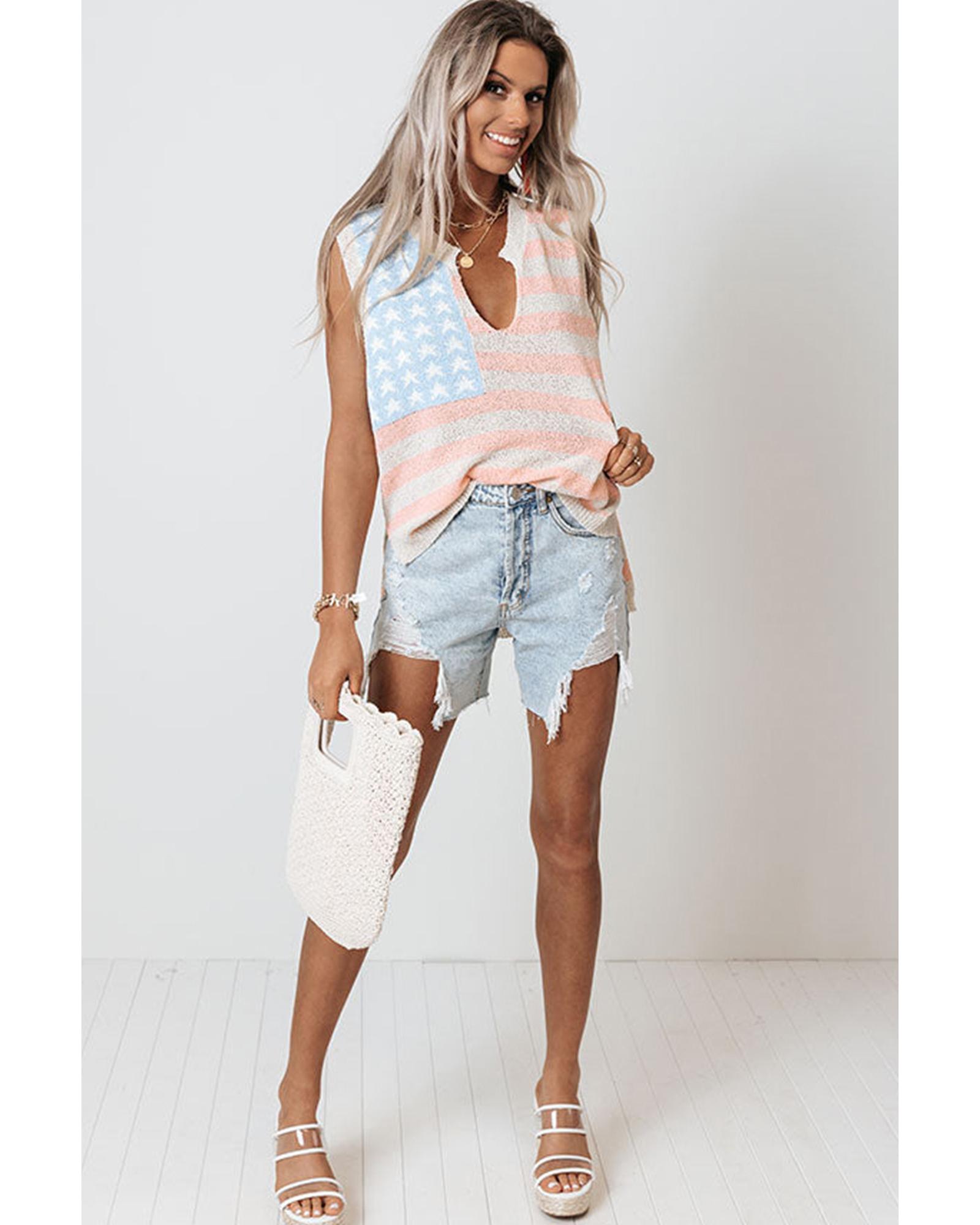 - Beige USA Flag Notched Neckline Loose Sweater Vest
