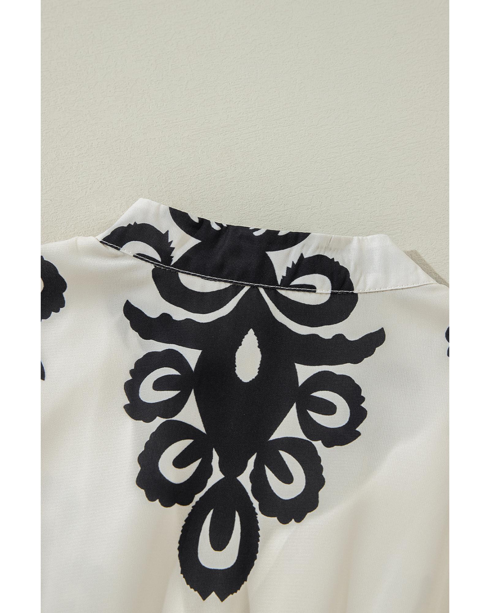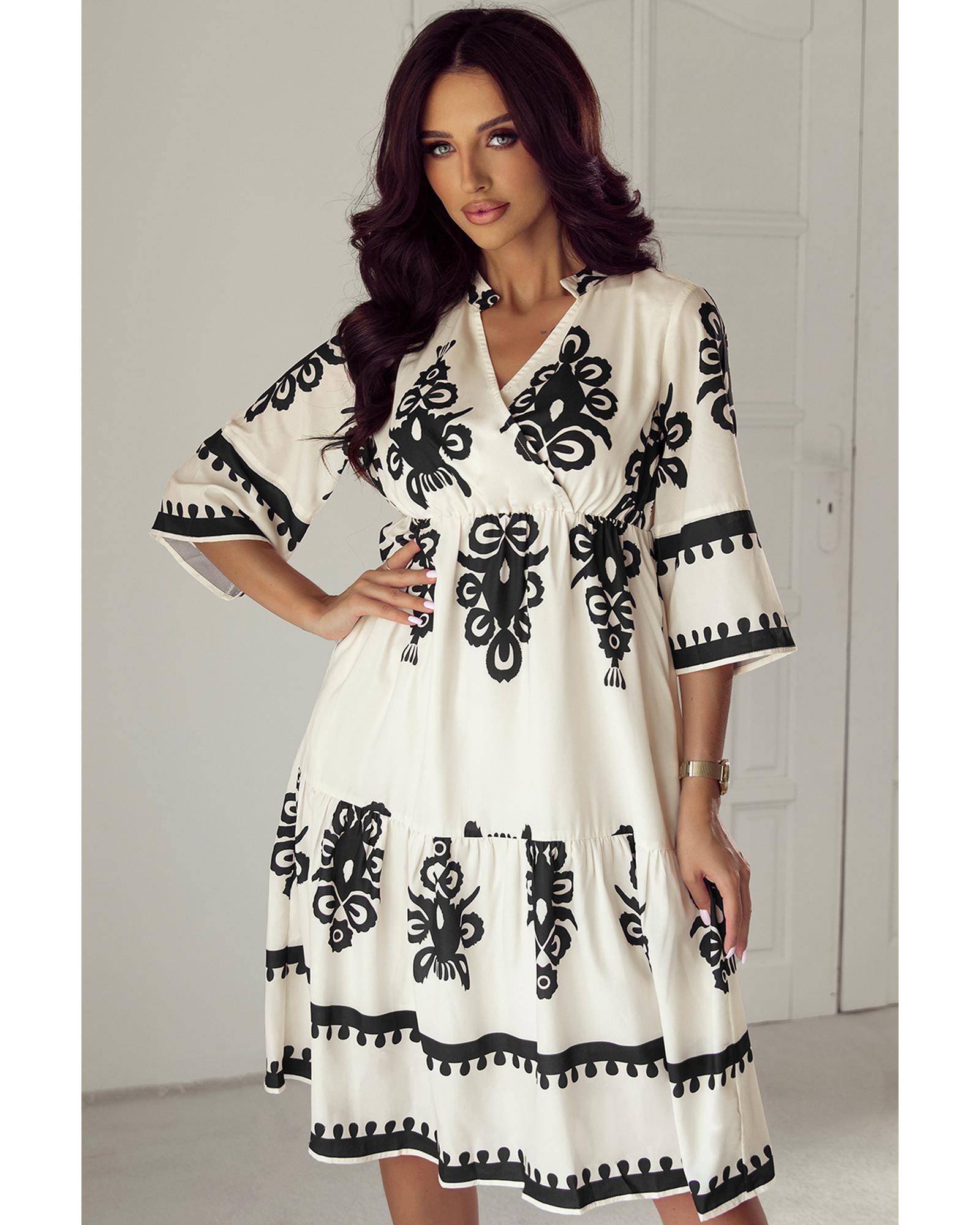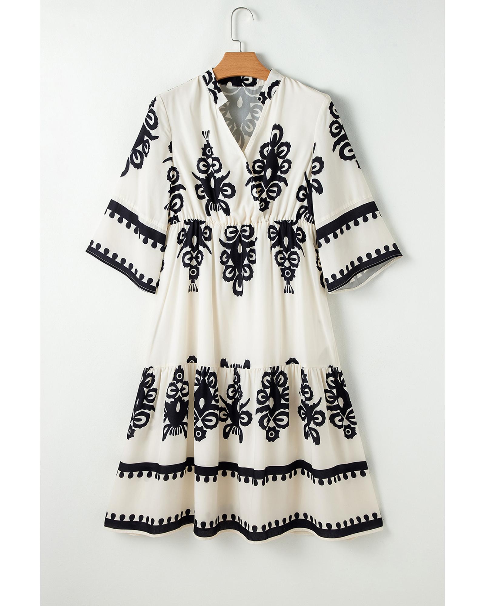 Beige Western Geometric Print 3/4 Sleeve Loose Midi Dress – M