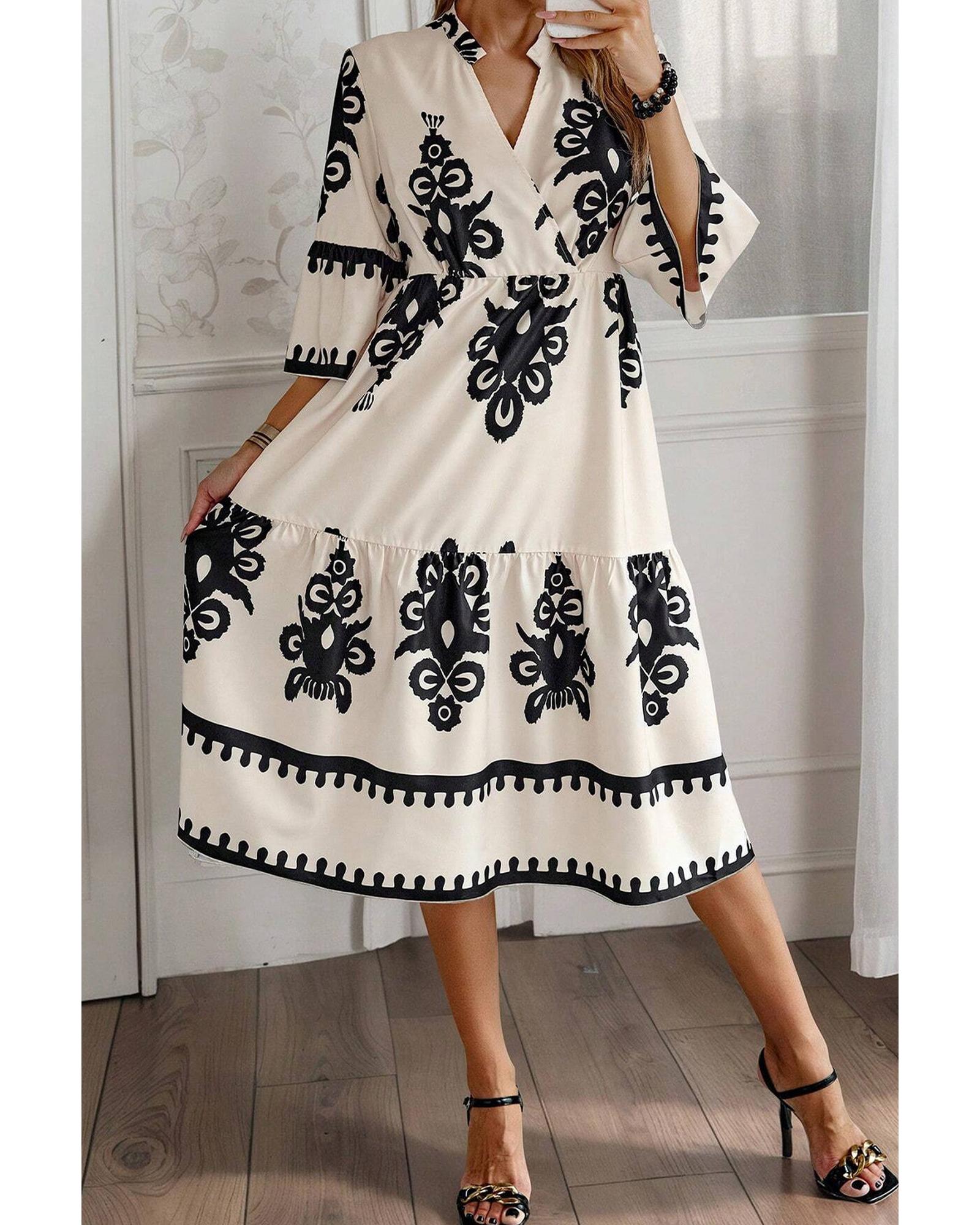 Beige Western Geometric Print 3/4 Sleeve Loose Midi Dress – XL