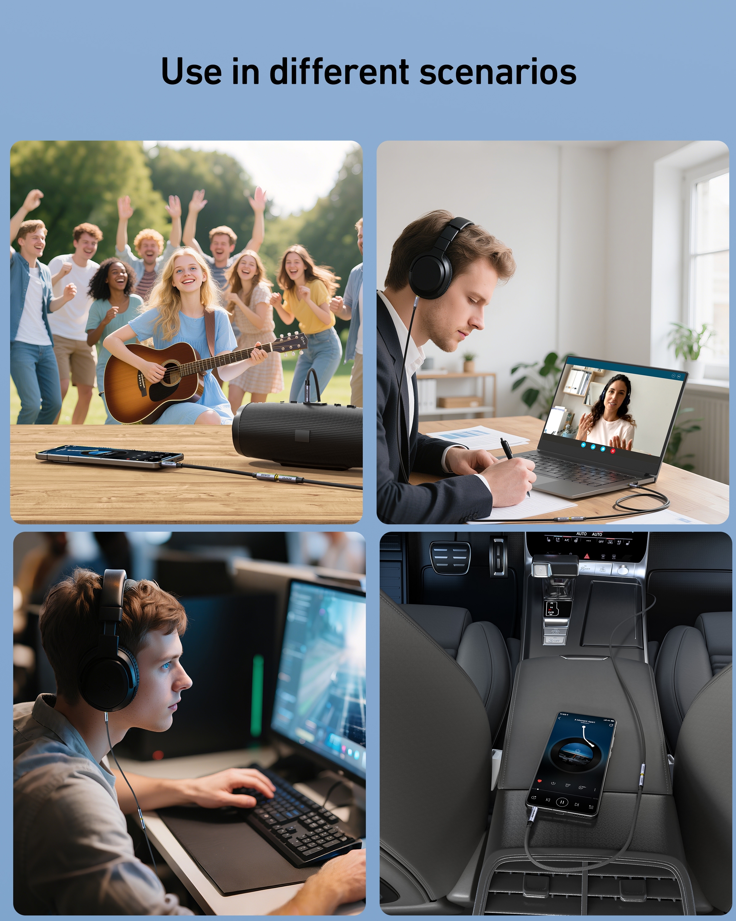 Compatible with all devices featuring a 3.5mm port, including headphones, smartphones, tablets, PCs, laptops, speakers, car stereos, and more.