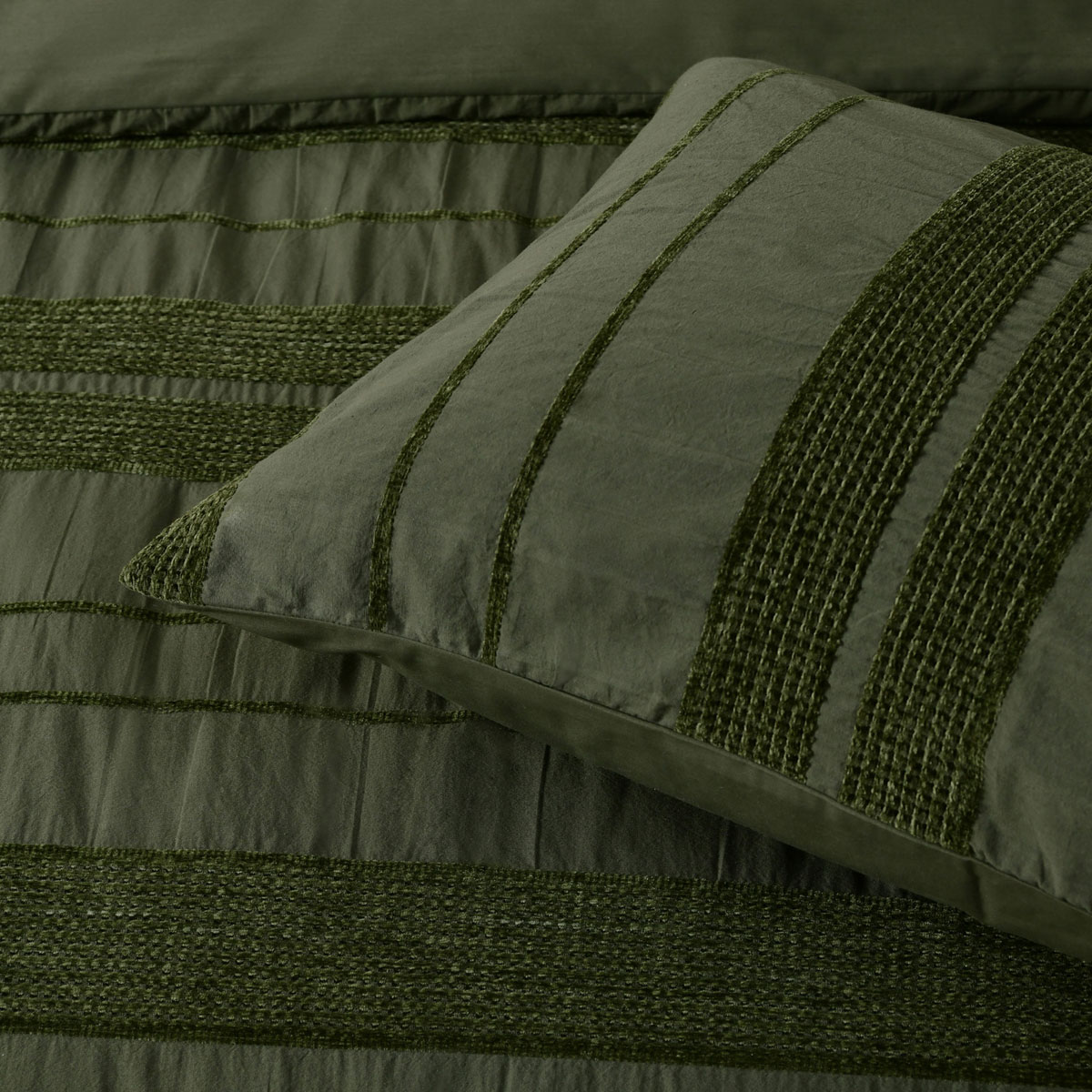 Avery is made from a beautiful easy-care polyester/cotton fabric. The popular forest green colourway is further complimented by horizontal polyester chenille stripes, which are super soft to touch. Add the matching european pillowcases and cushion to complete the look at an extra cost.