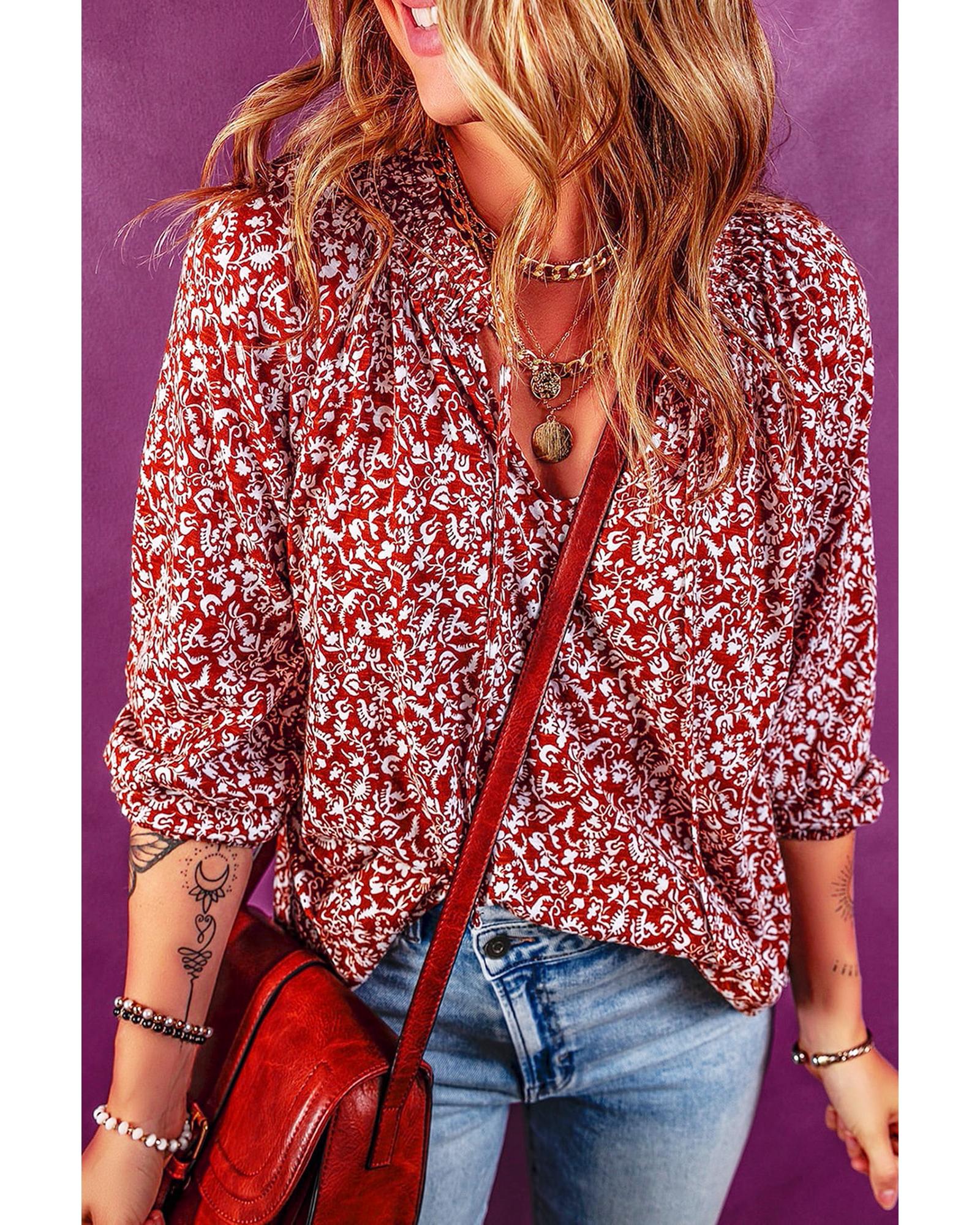 Charming floral blouse in Biking Red Notched V - neck and bracelet sleeves Shift fit for a comfortable wear Smocked details and tied neck for added chicness Versatile piece that can be paired with pants jeans or shorts Available in various sizes for both men and women