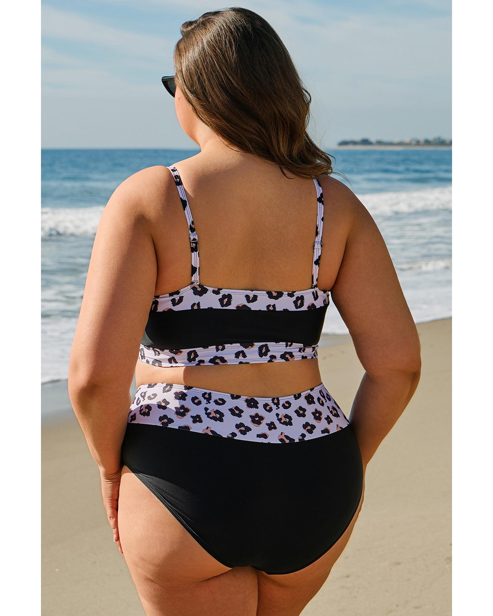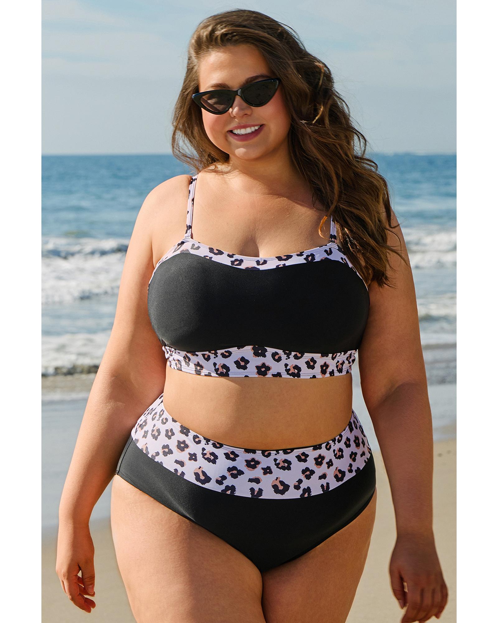 Black 2pcs Leopard Patchwork Plus Size High Waisted Swimsuit – 1X