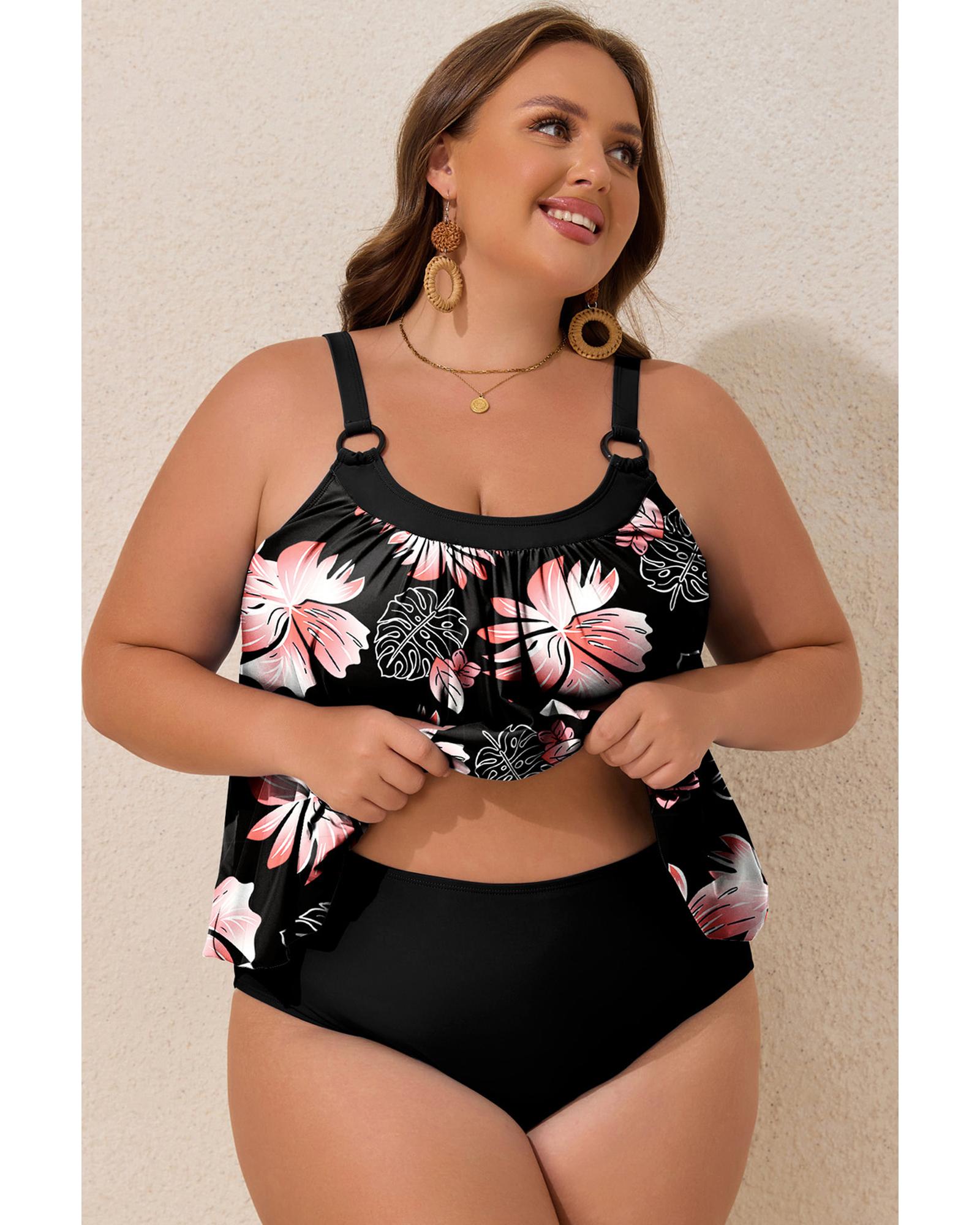 Black 2pcs Plus Size Wide Strap Floral Top Tankini Set – 4X