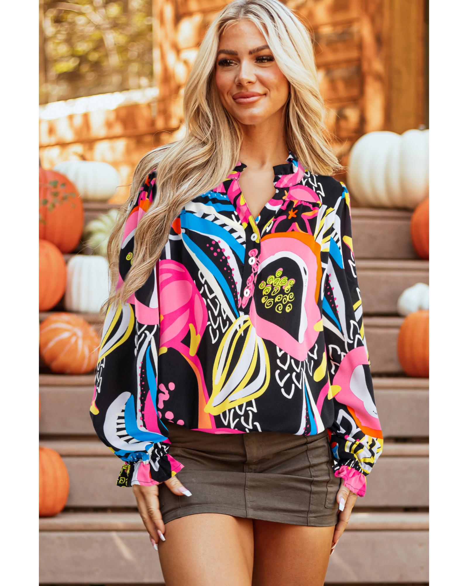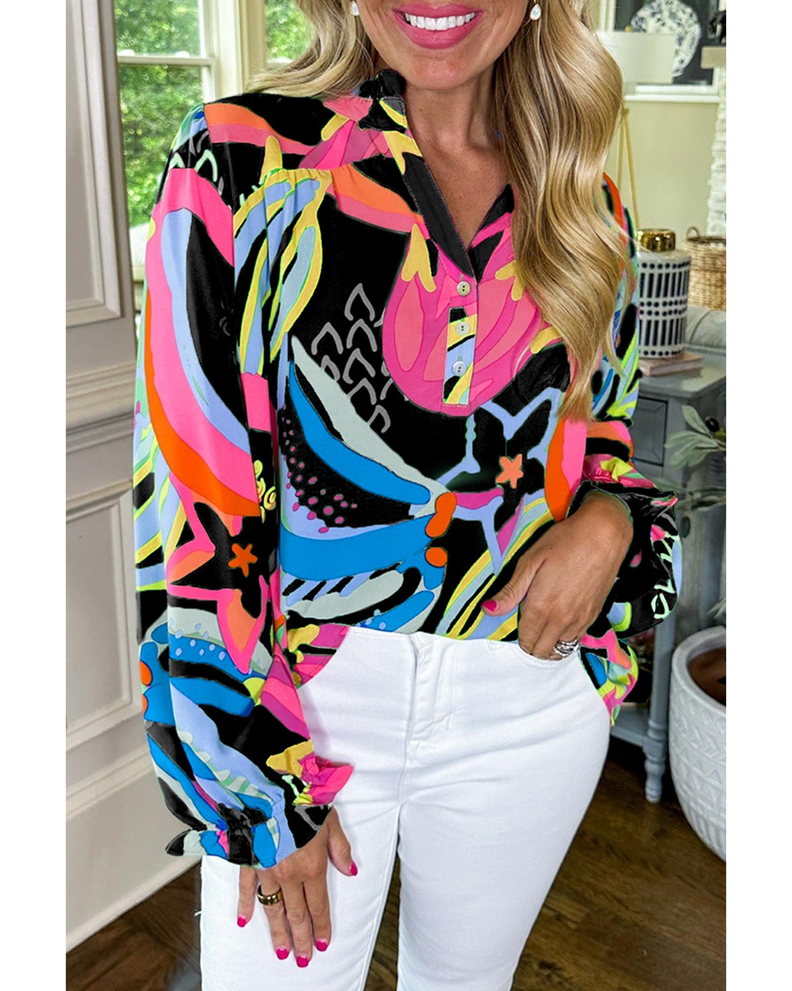 Black Abstract Print Ruffled Sleeve Buttoned V Neck Blouse – S