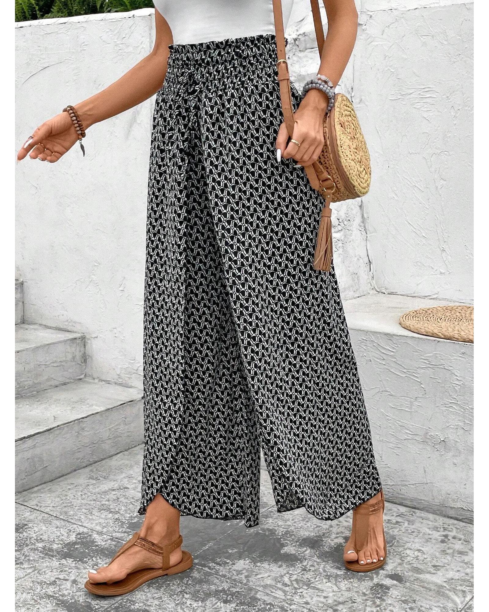 Black Bohemian Print Slit Wide Leg Smocked High Waist Pants – XL