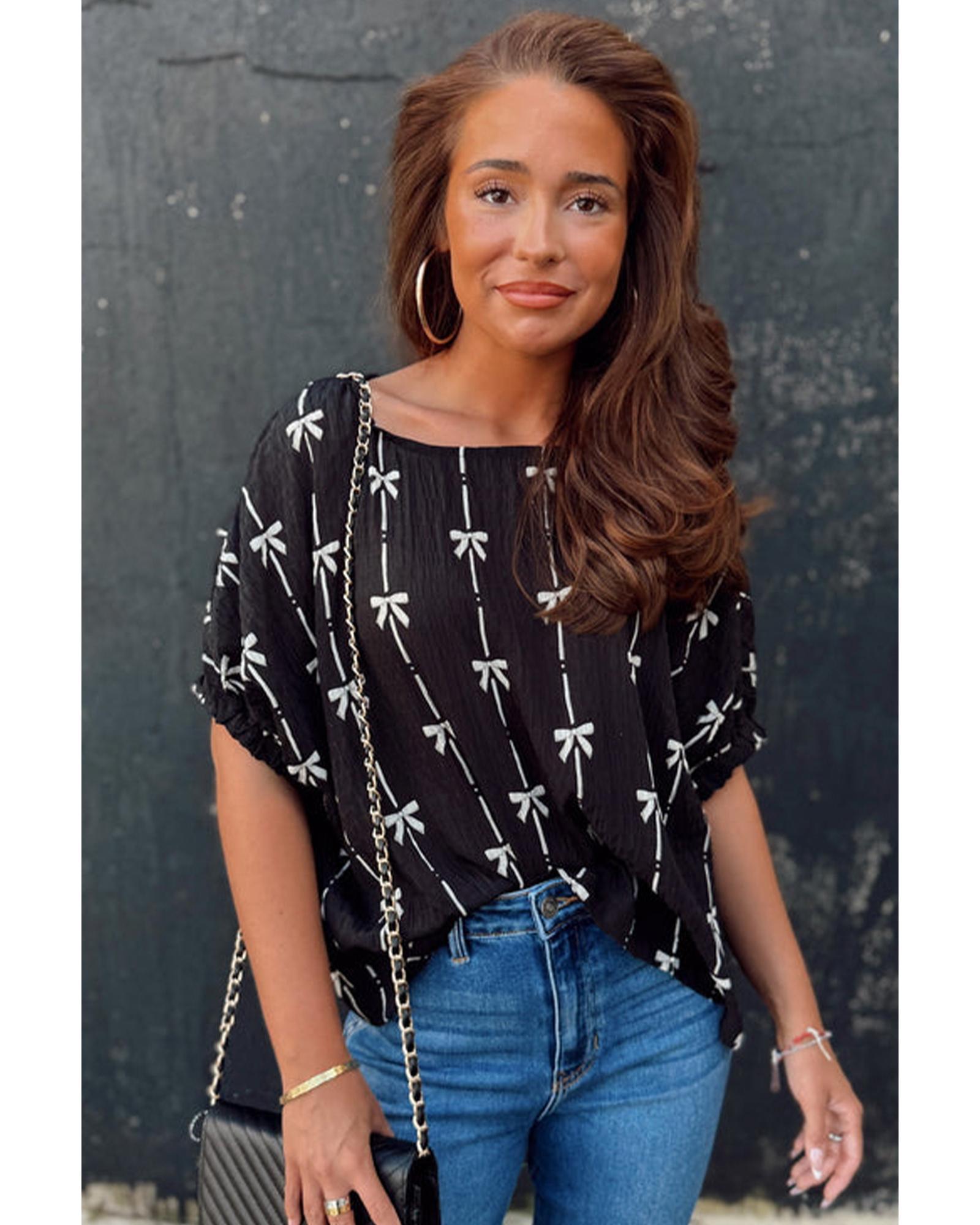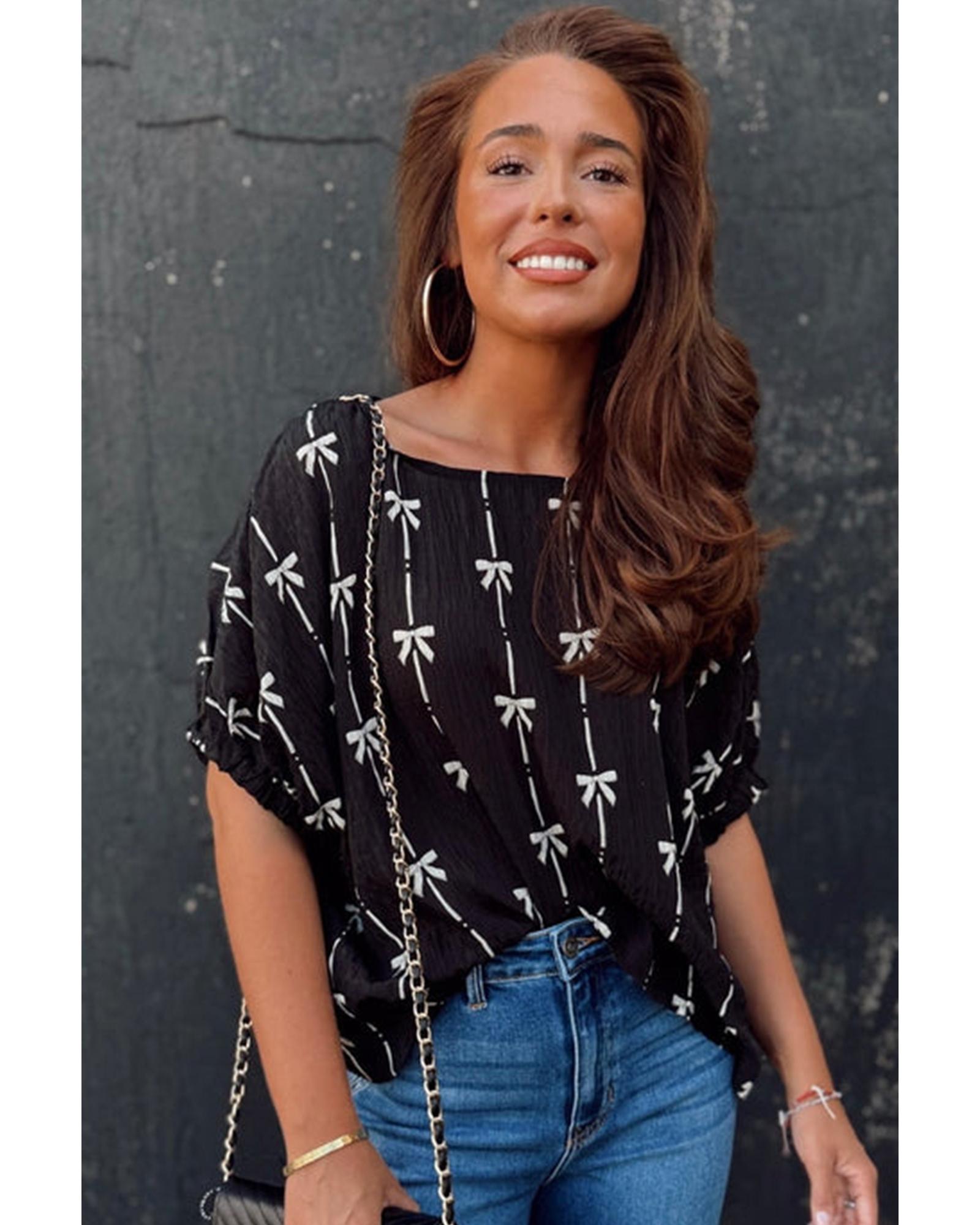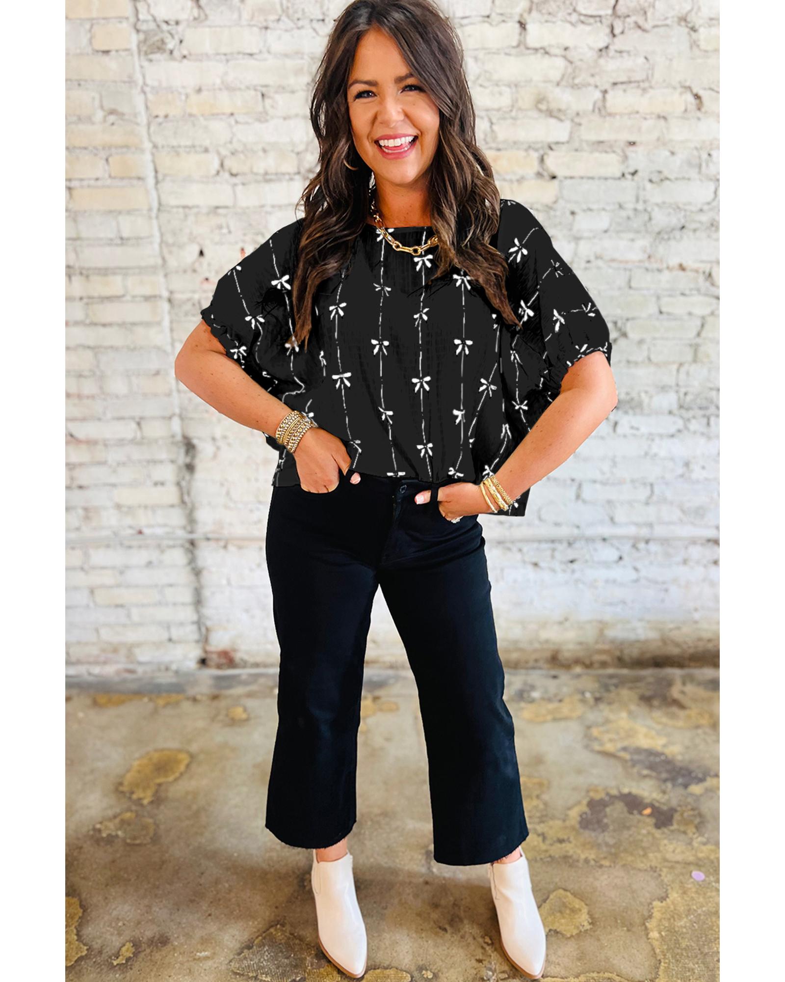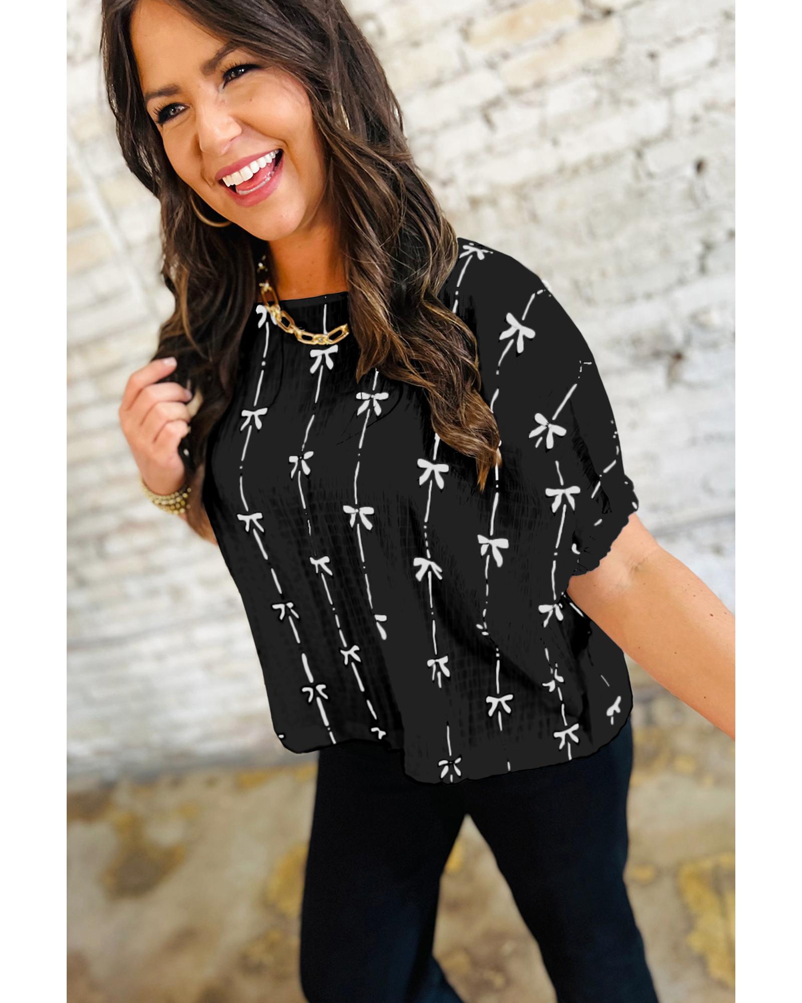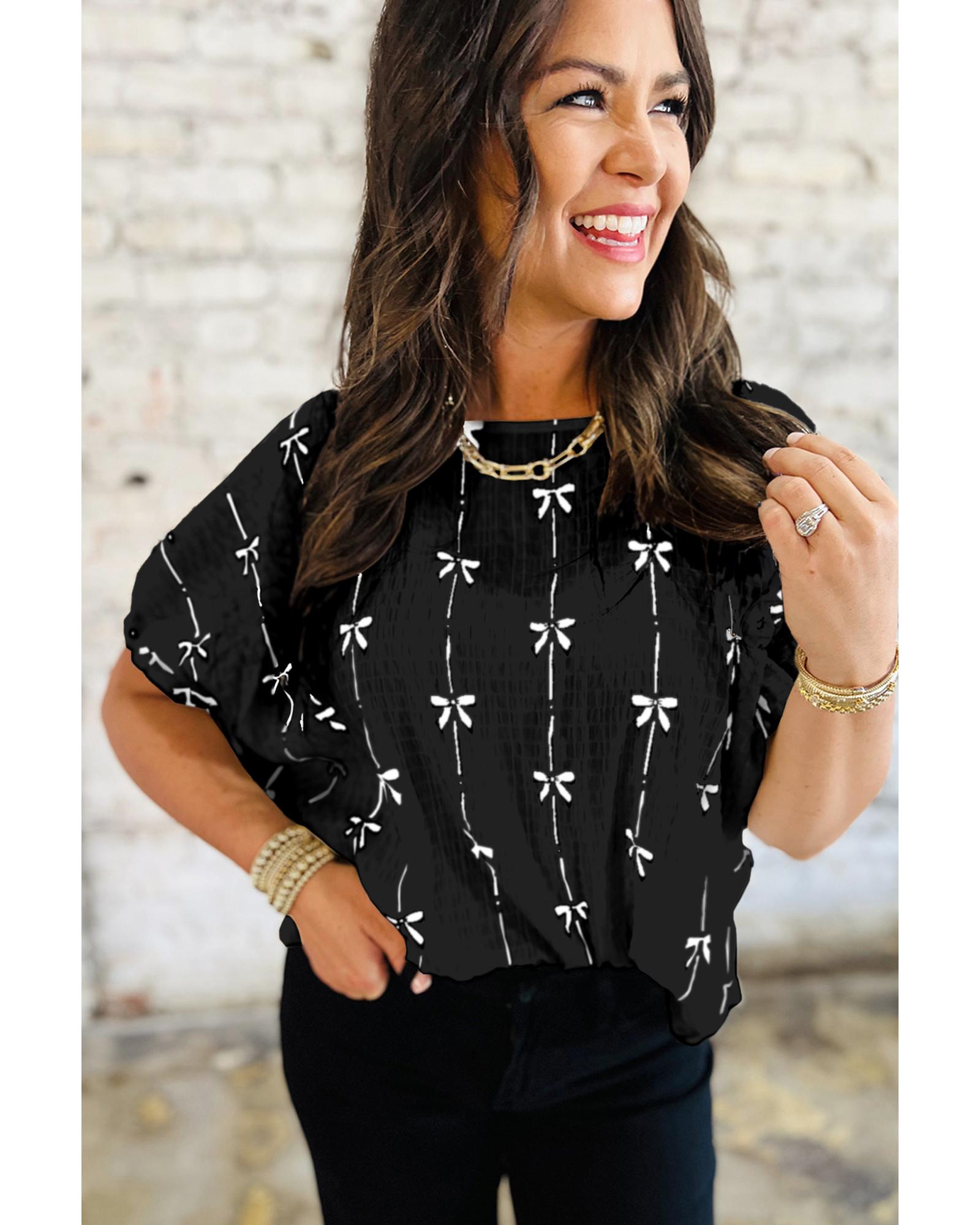 Black Bow Print Puff Short Sleeve Top – M