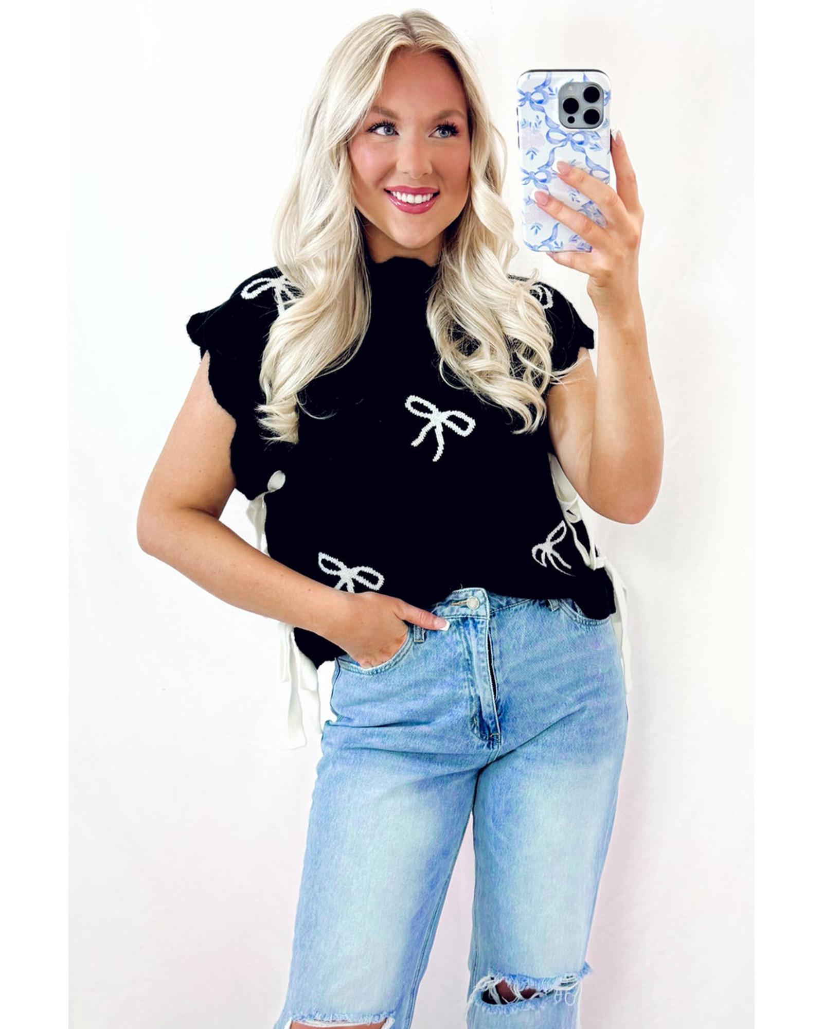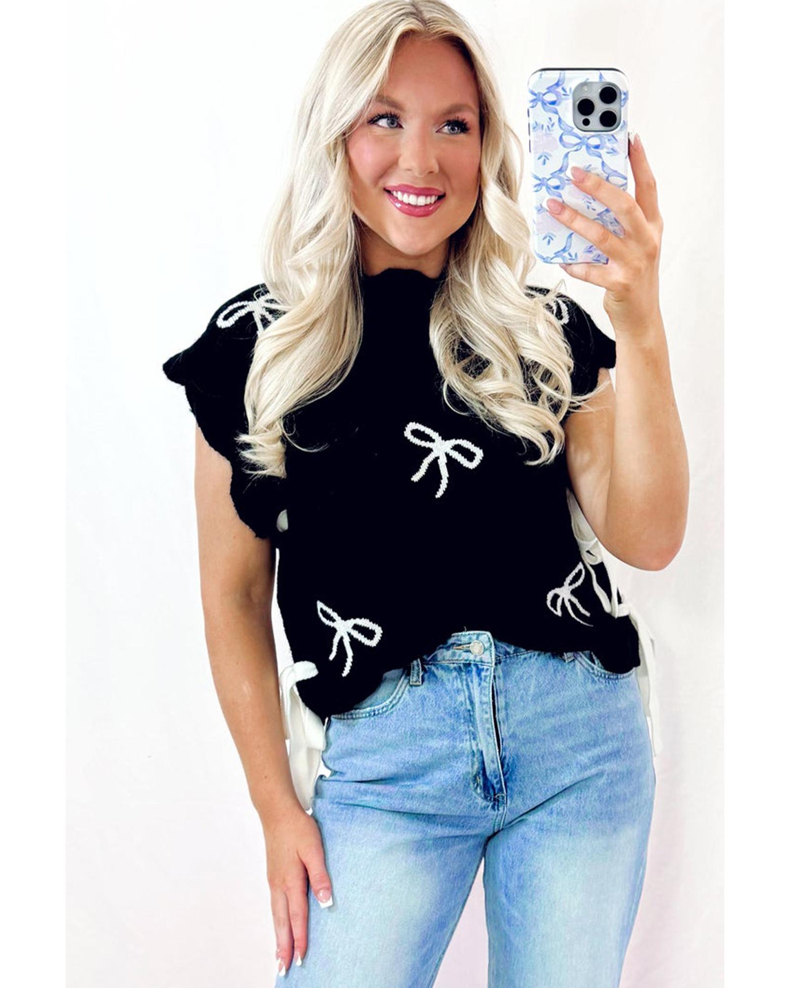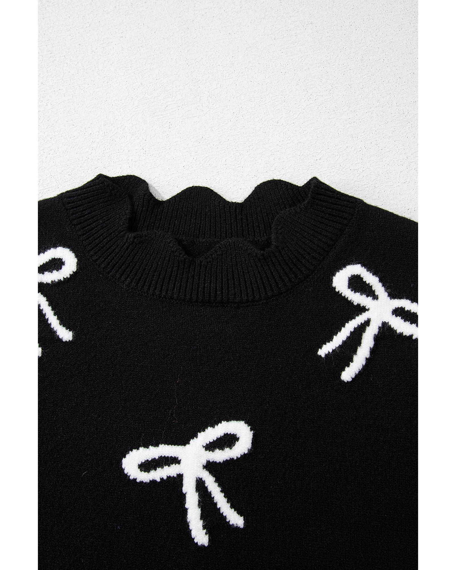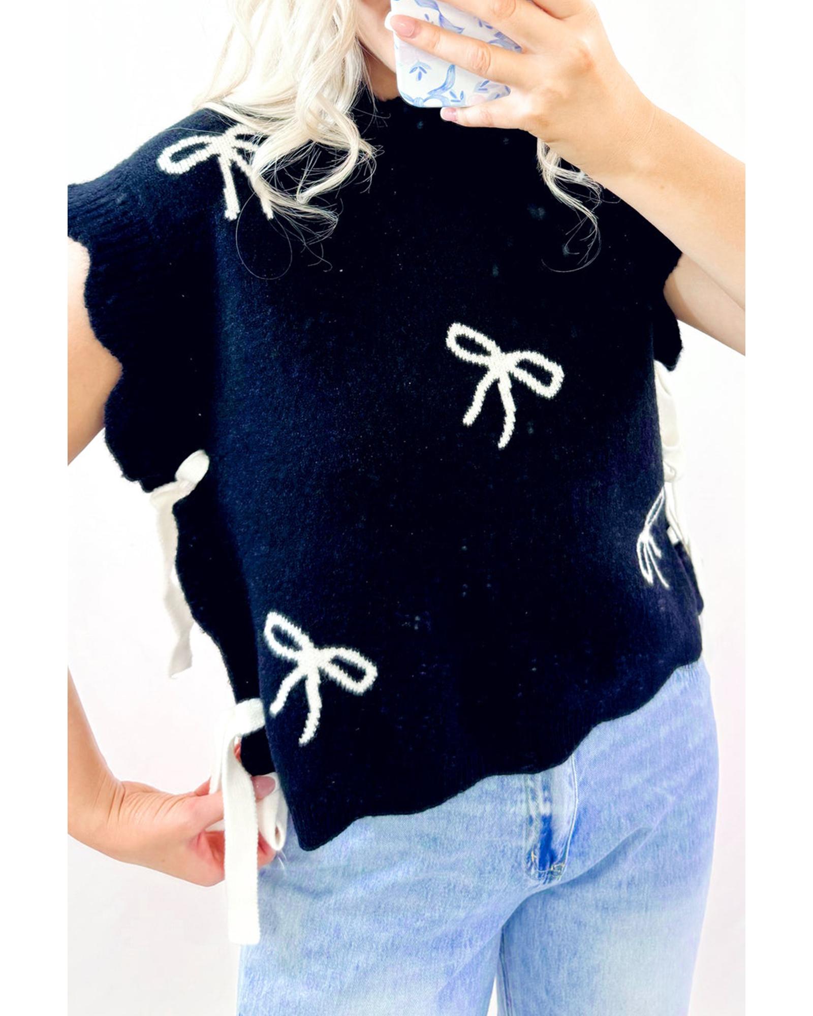Black Bow Print Side Ties Scalloped Hem Sweater T Shirt – S