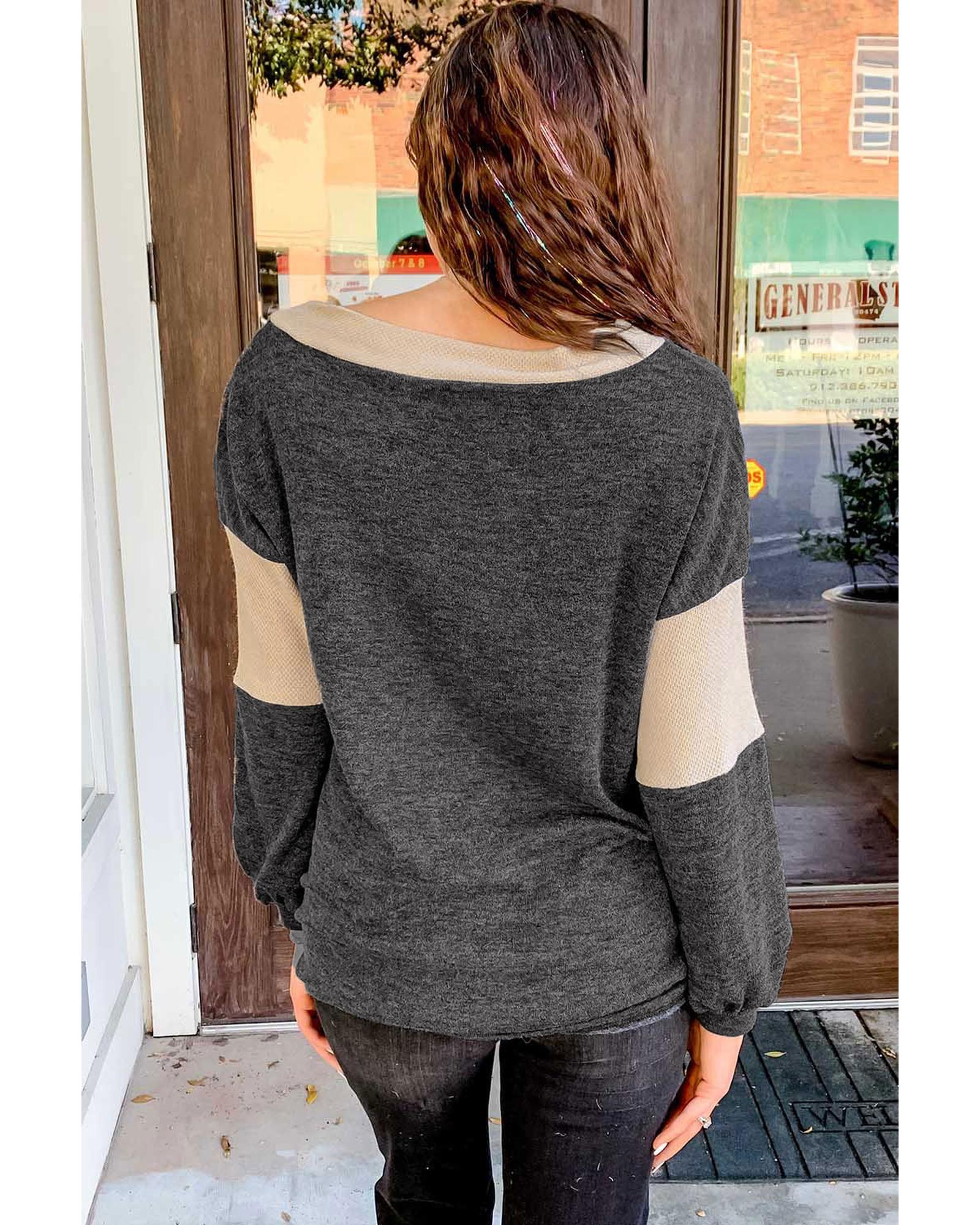 Black Brushed Contrast Knit V Neck Colorblock Long Sleeve Top – L