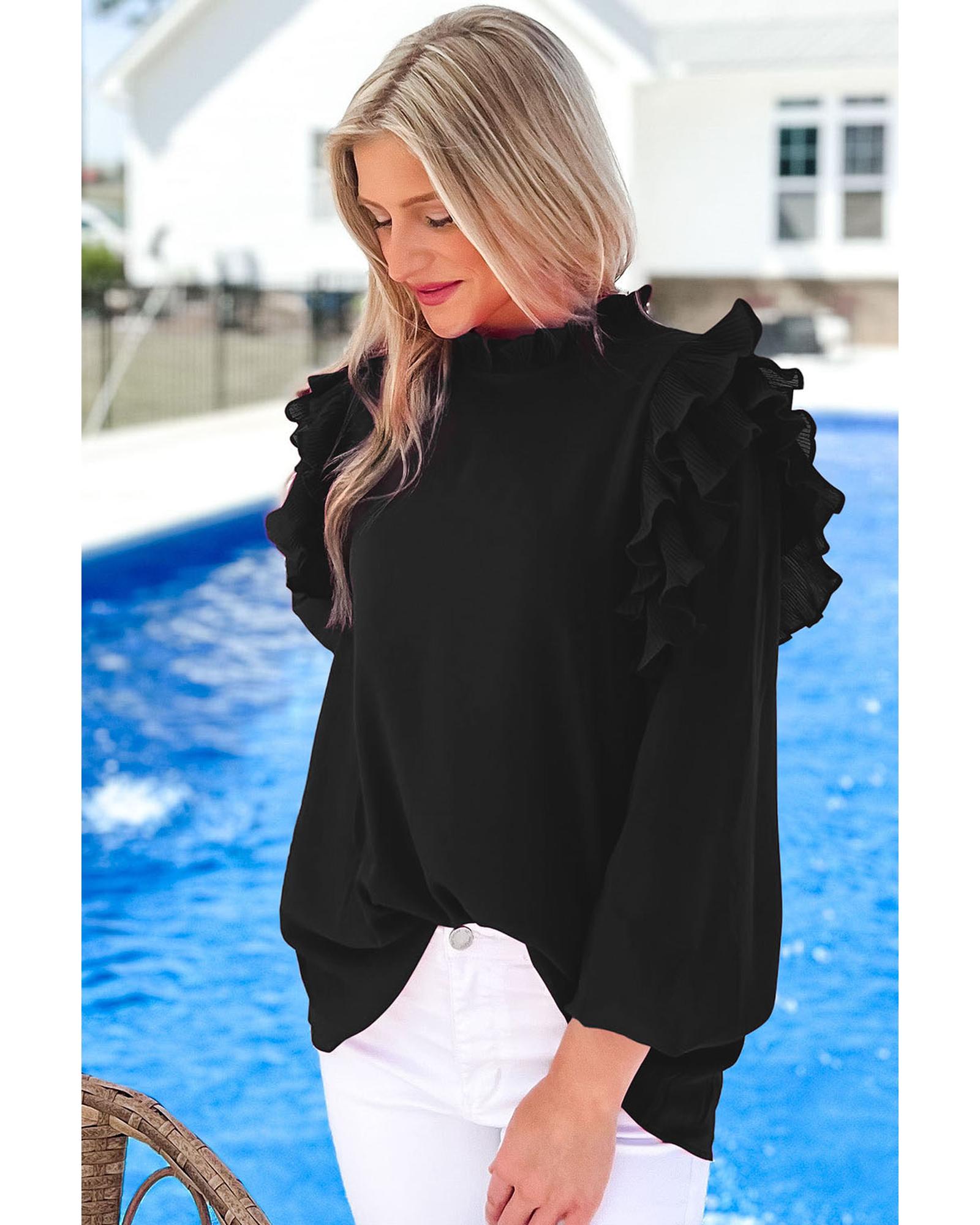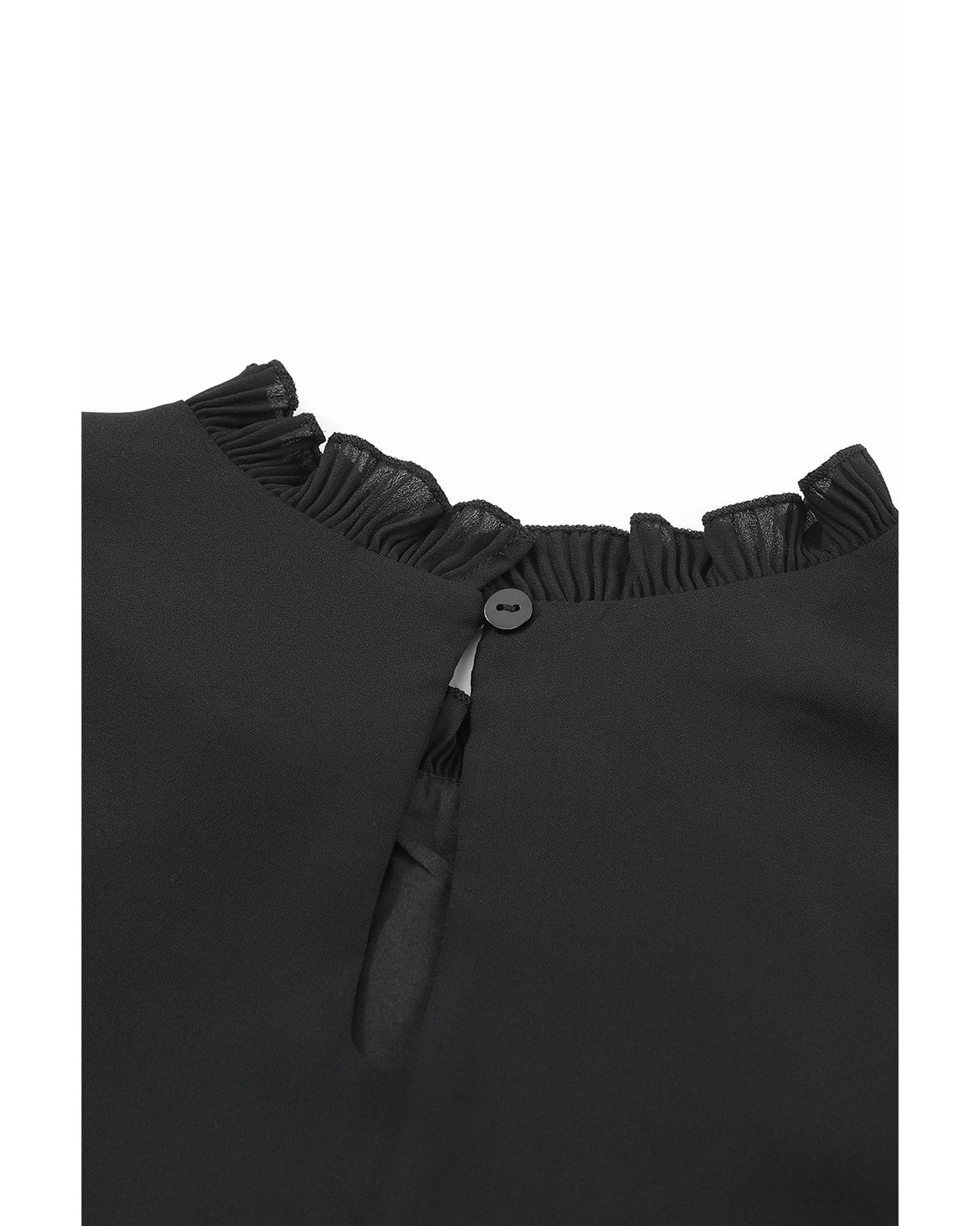 Black Button Keyhole Back Pleated Ruffle Trim Blouse – L
