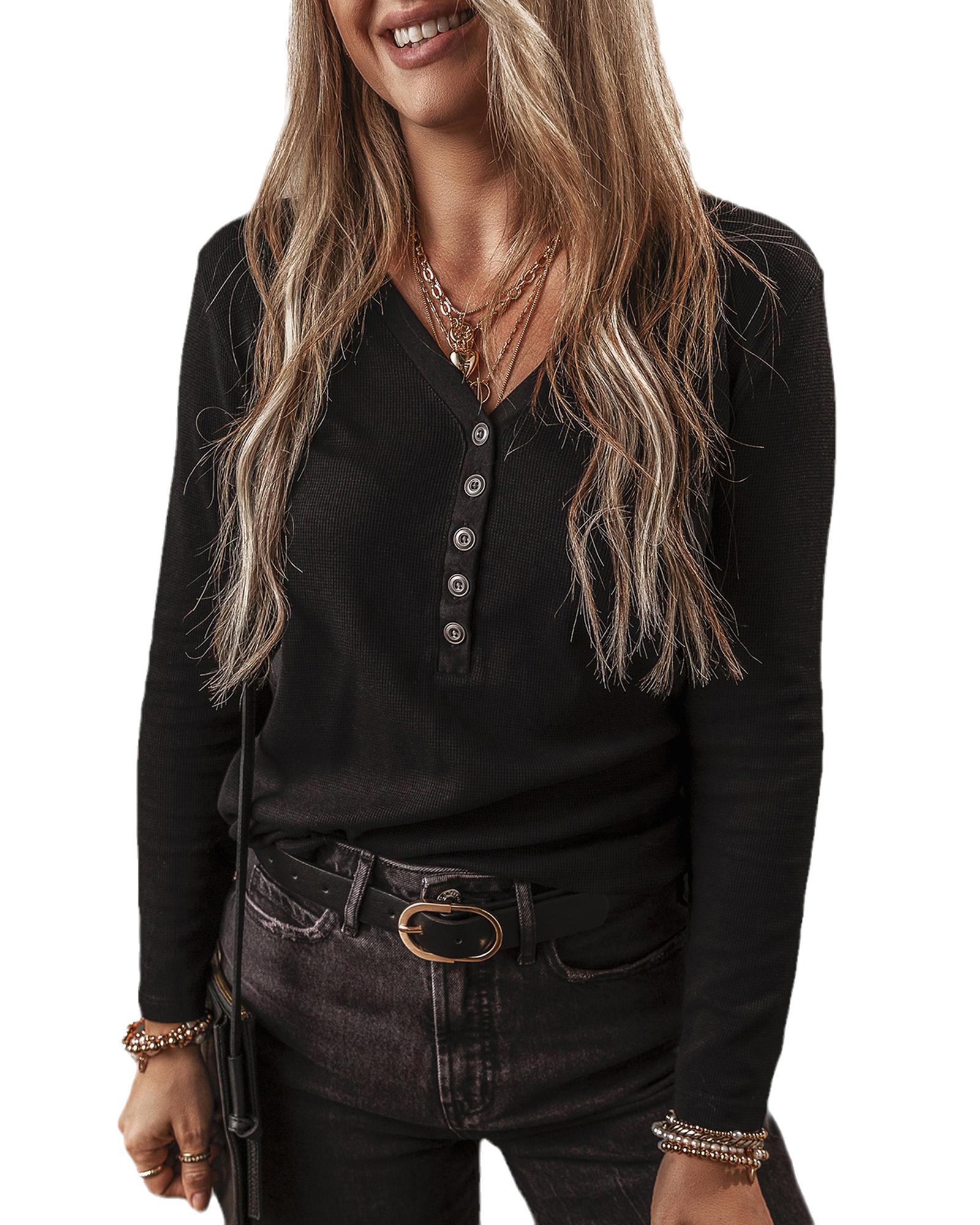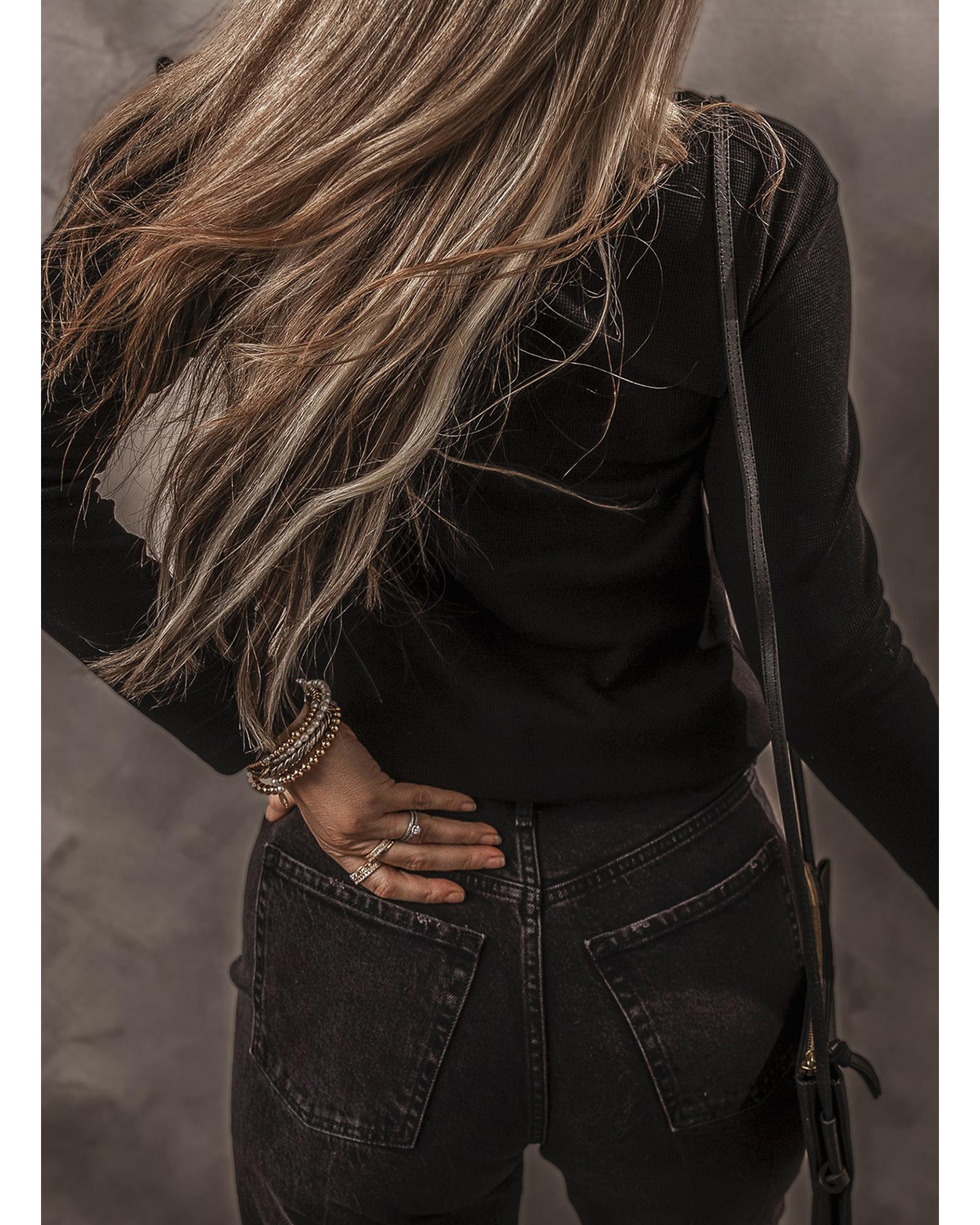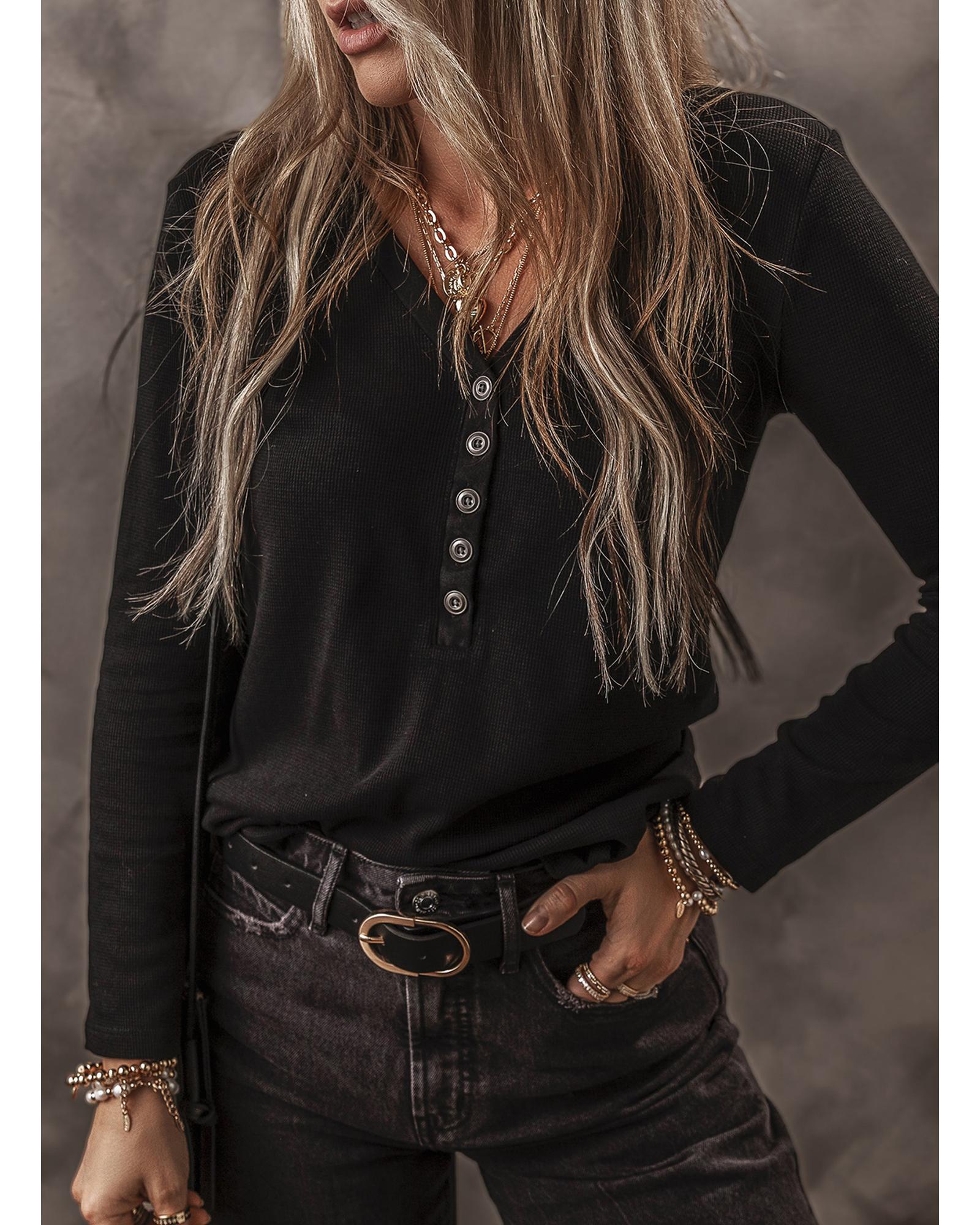 Black Buttoned V Neck Long Sleeve Ribbed Top – S