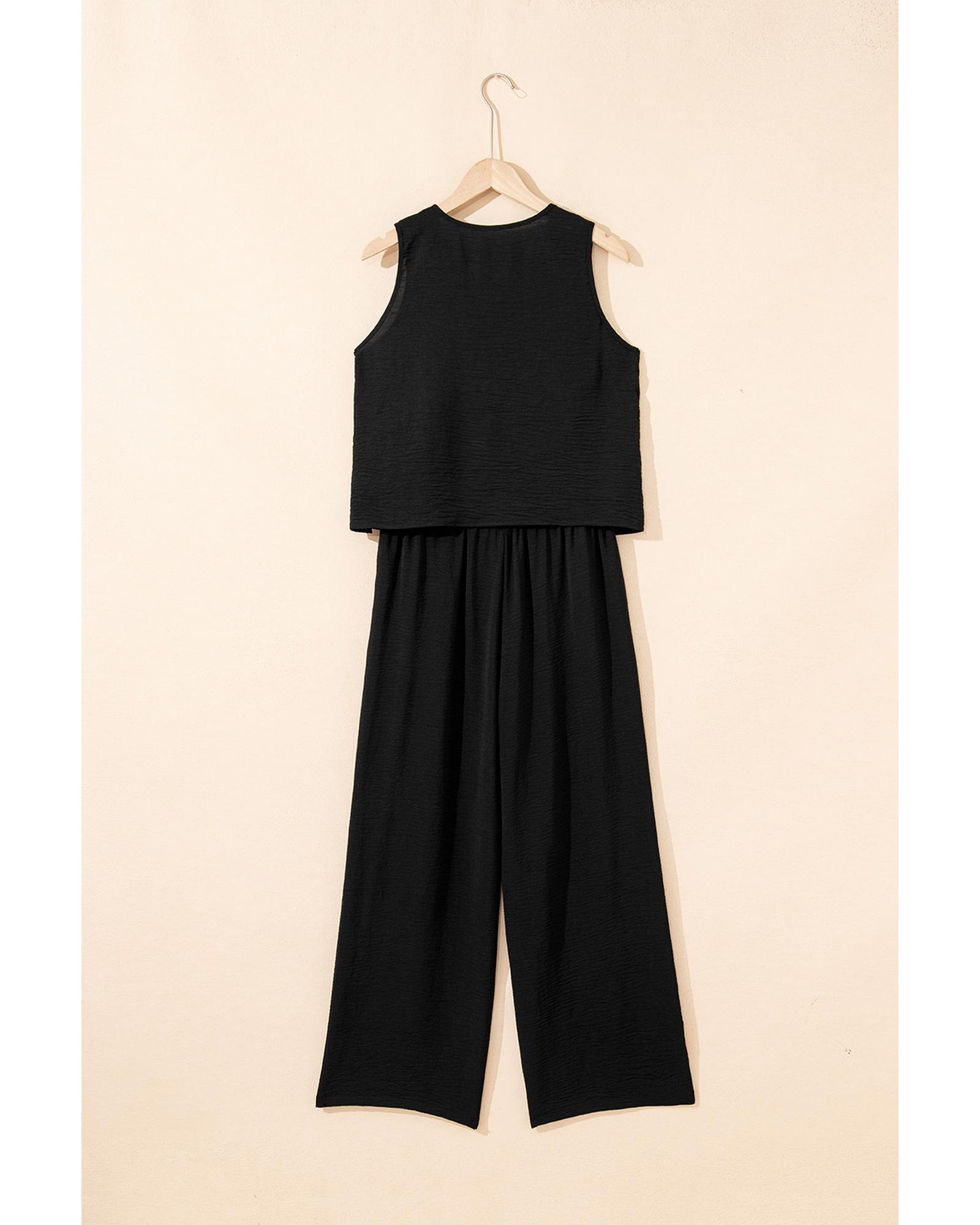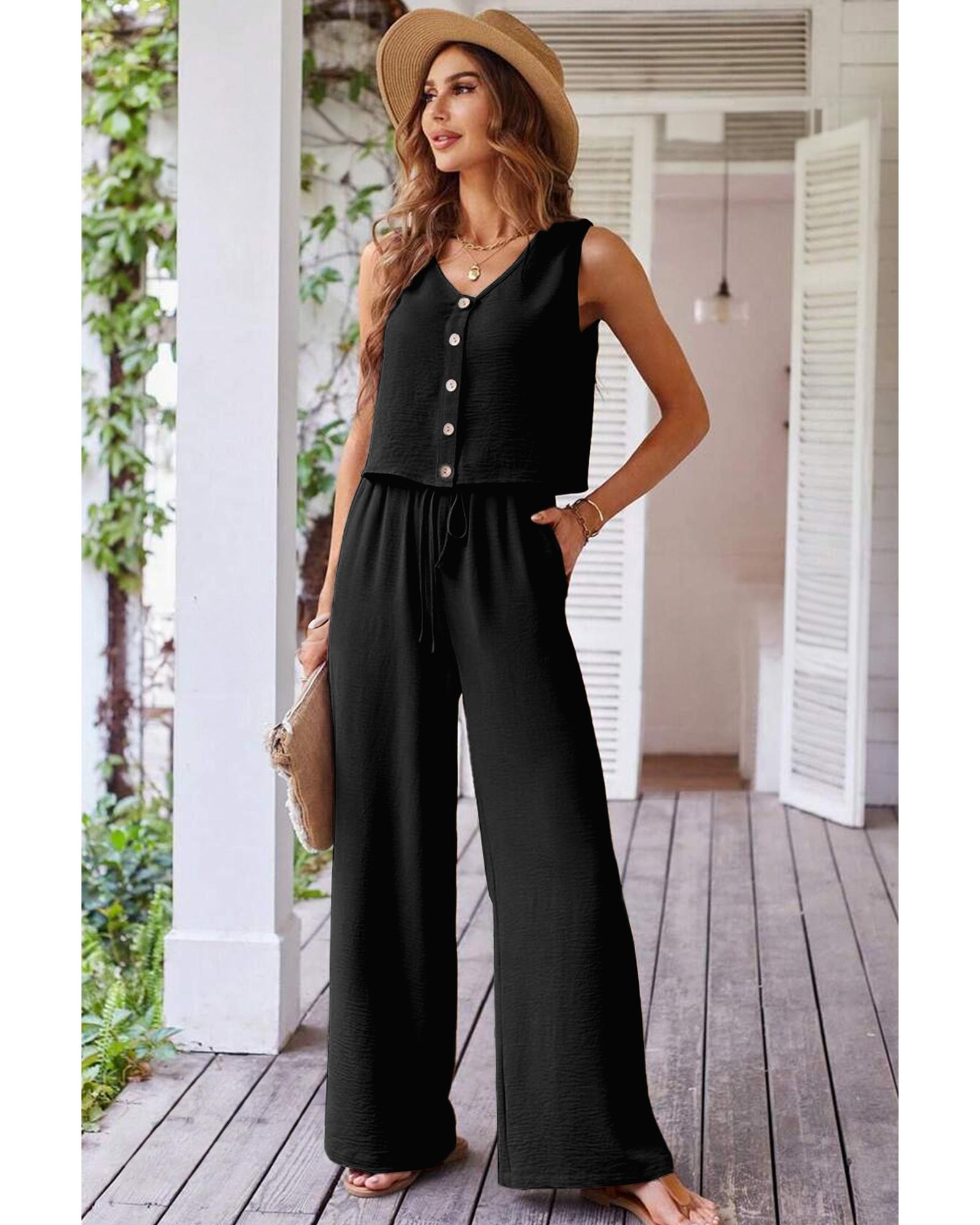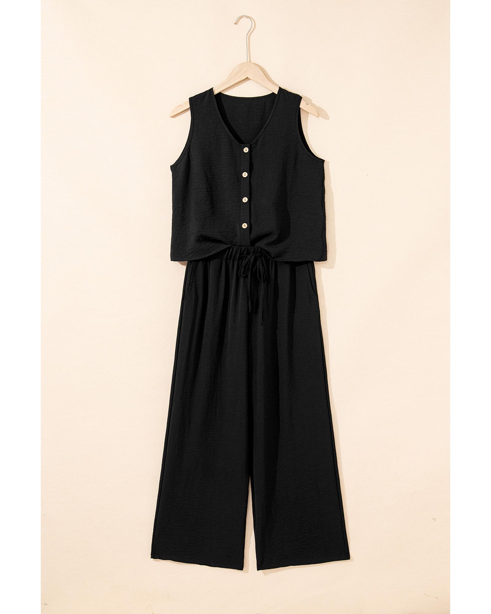 Black Buttoned Vest Drawstring Wide Leg Pants 2pcs Set – XL