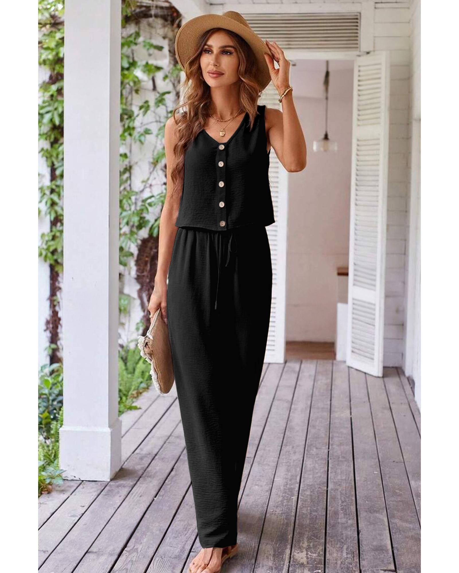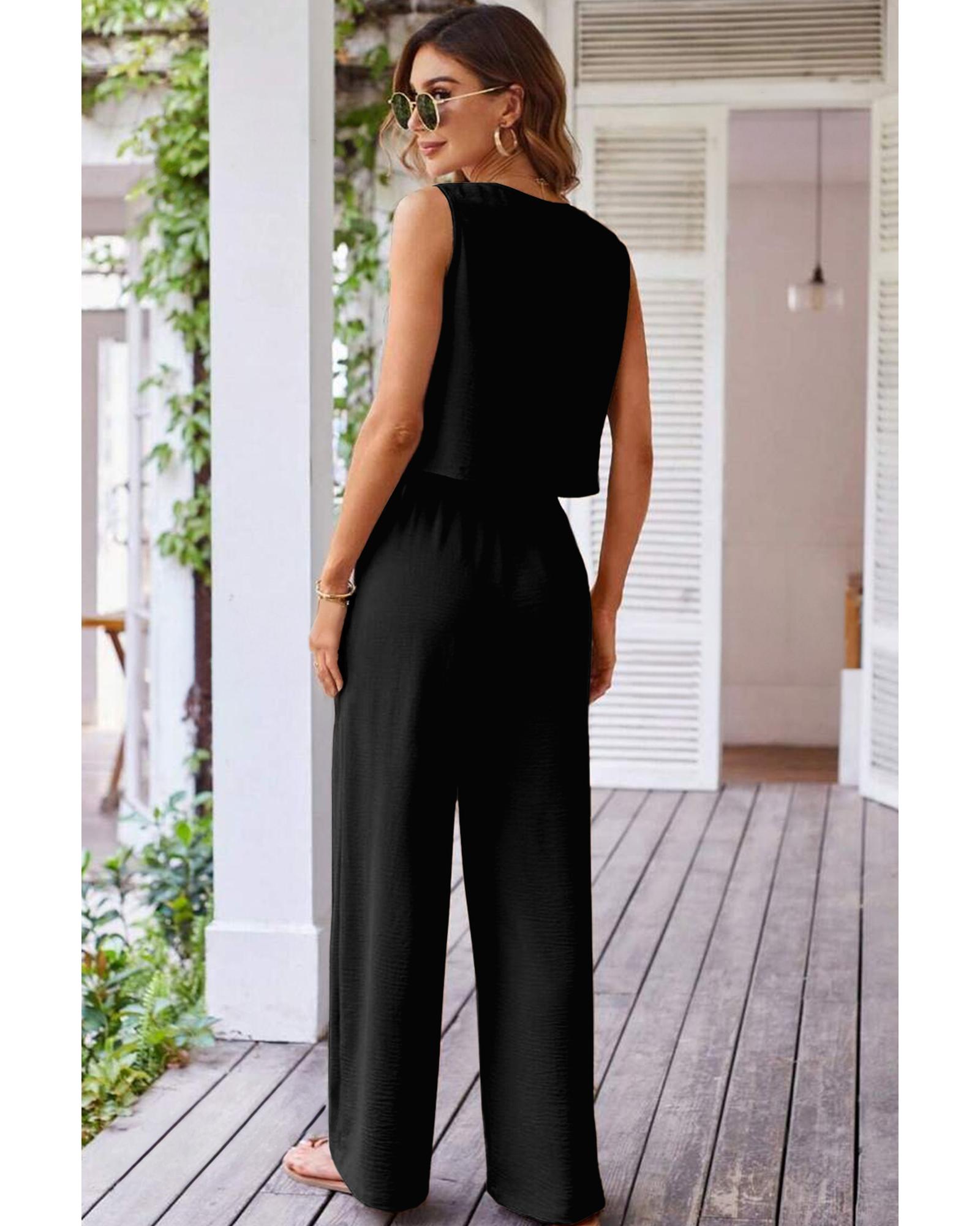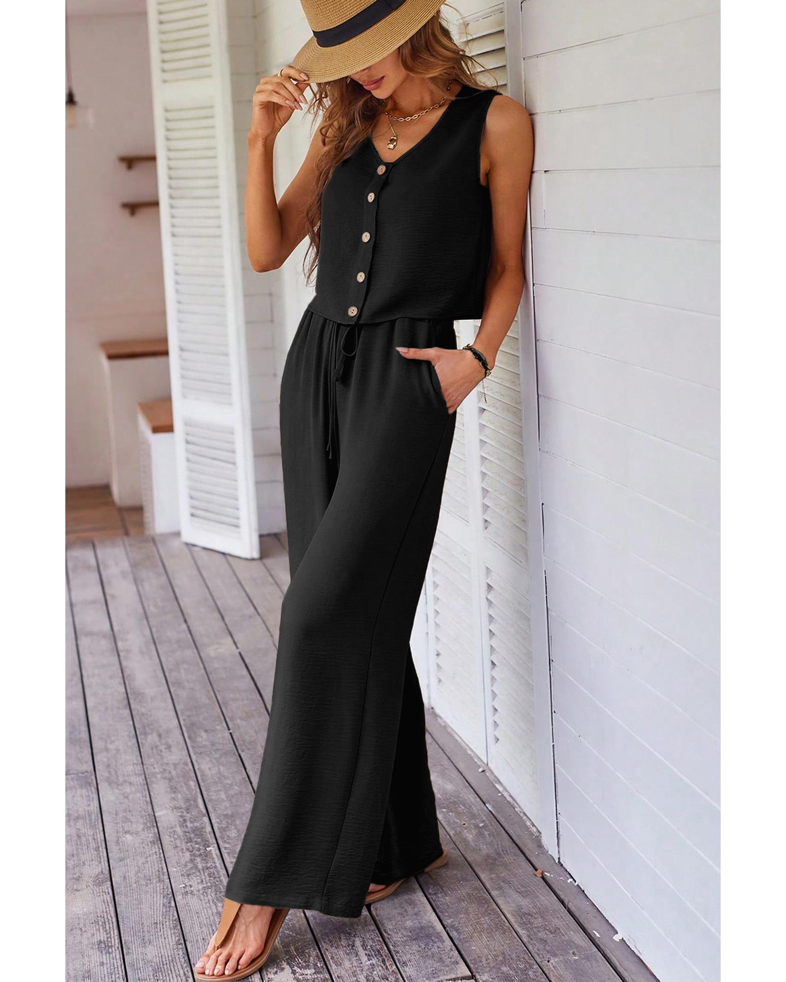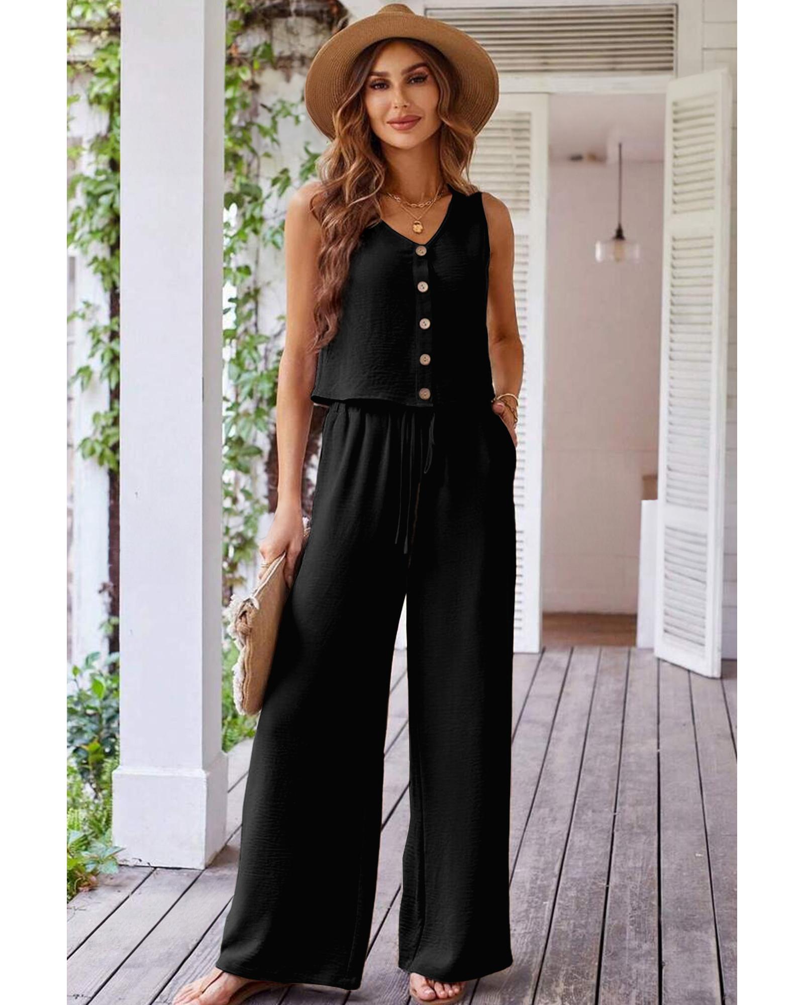 Black Buttoned Vest Drawstring Wide Leg Pants 2pcs Set – XL