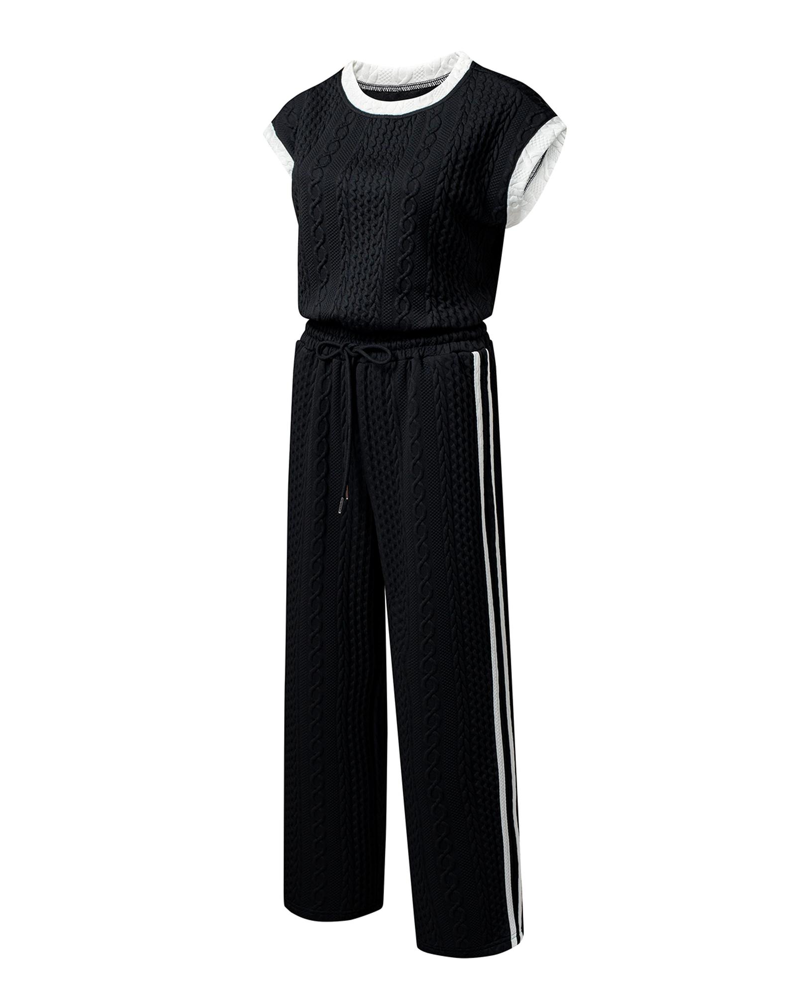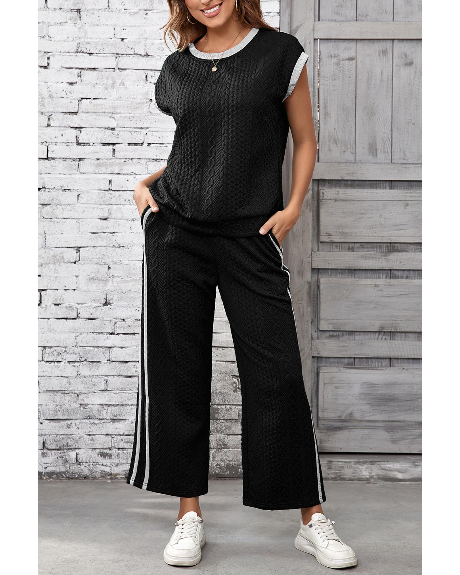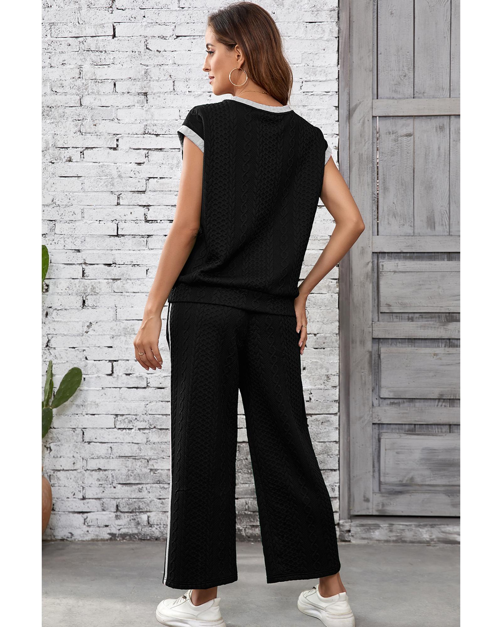 Black Cable Knit Contrast Trim Short Sleeve Top and Pants Set – L
