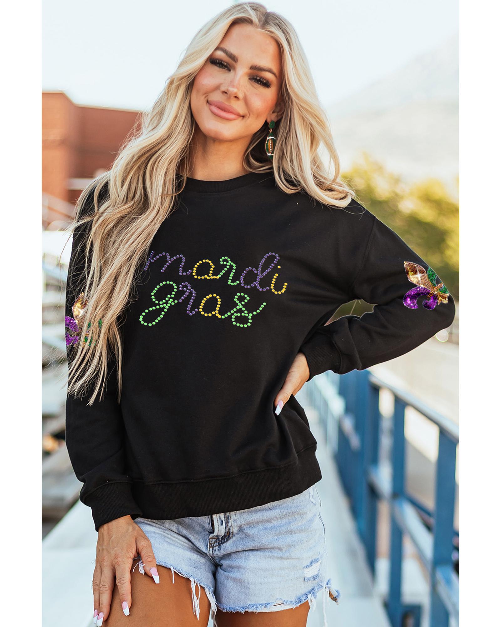 Black Ceramic Rhinestone mardi gras Letter Graphic Sweatshirt – S