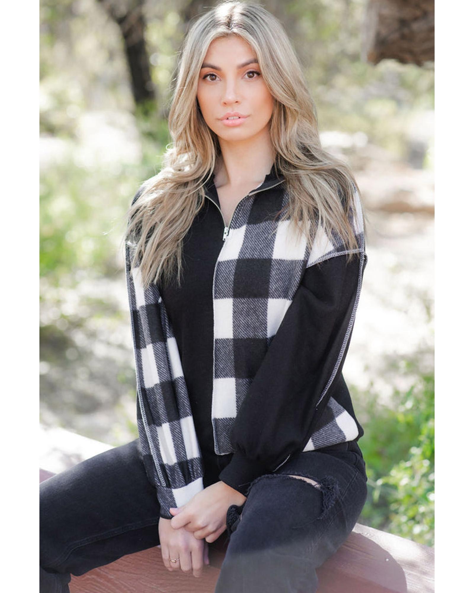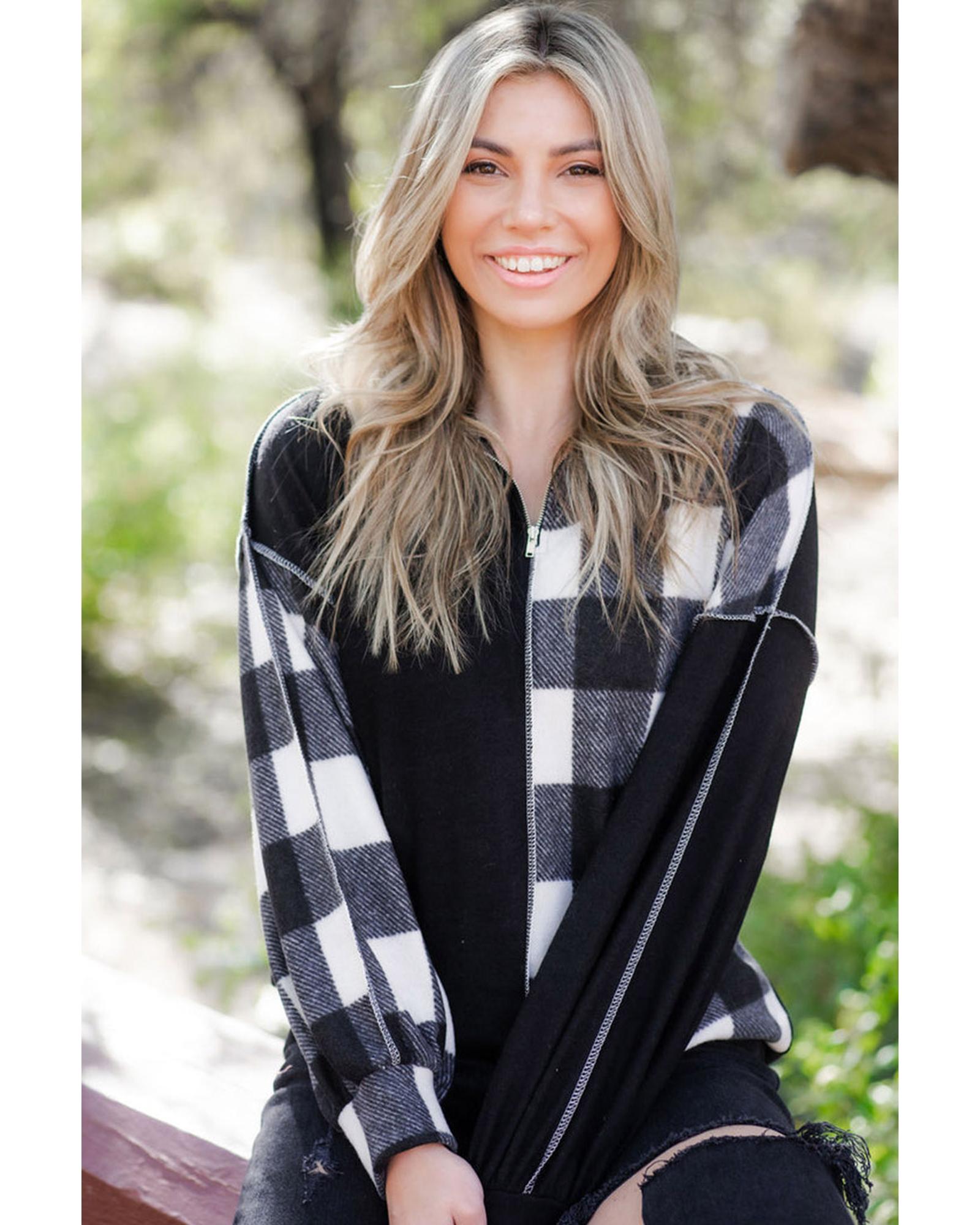 - Unisex Black Checkboard Patchwork Exposed Stitching Collared Top