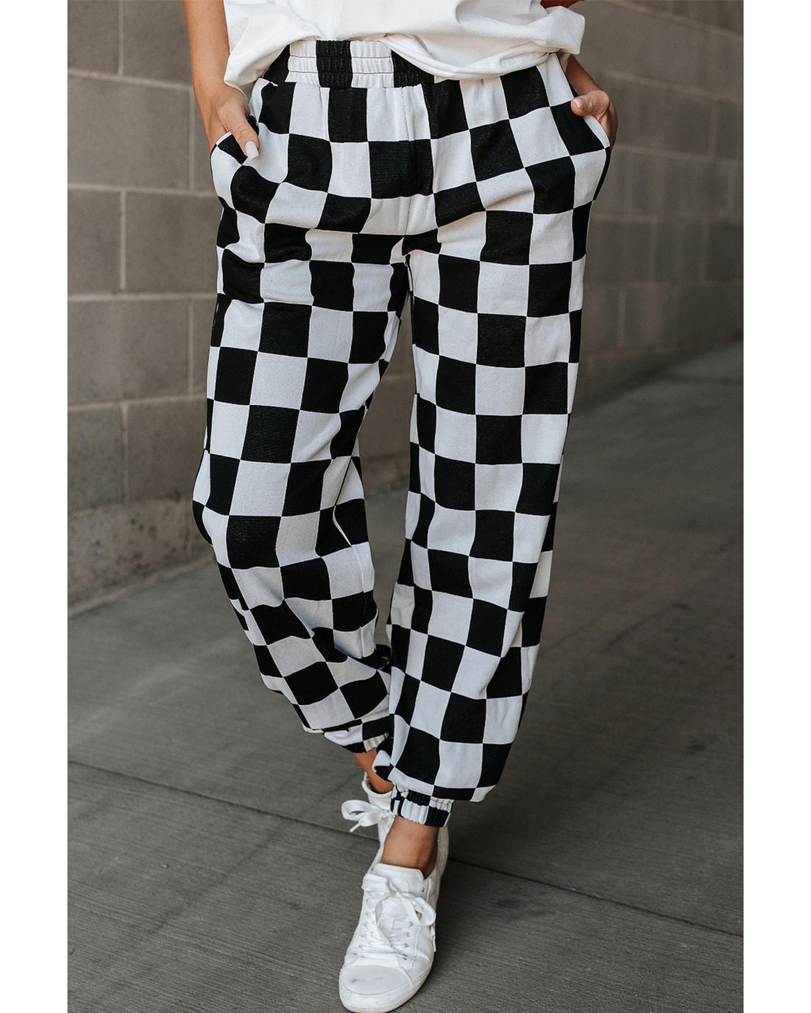 - Black Checkerboard Elastic Waist Pocketed Joggers