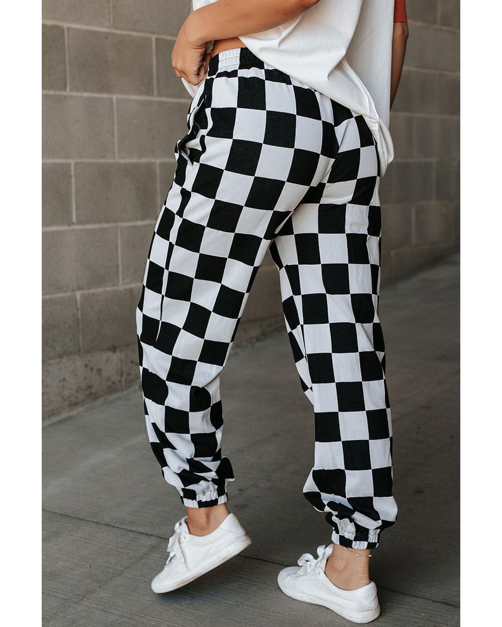 - Black Checkerboard Elastic Waist Pocketed Joggers