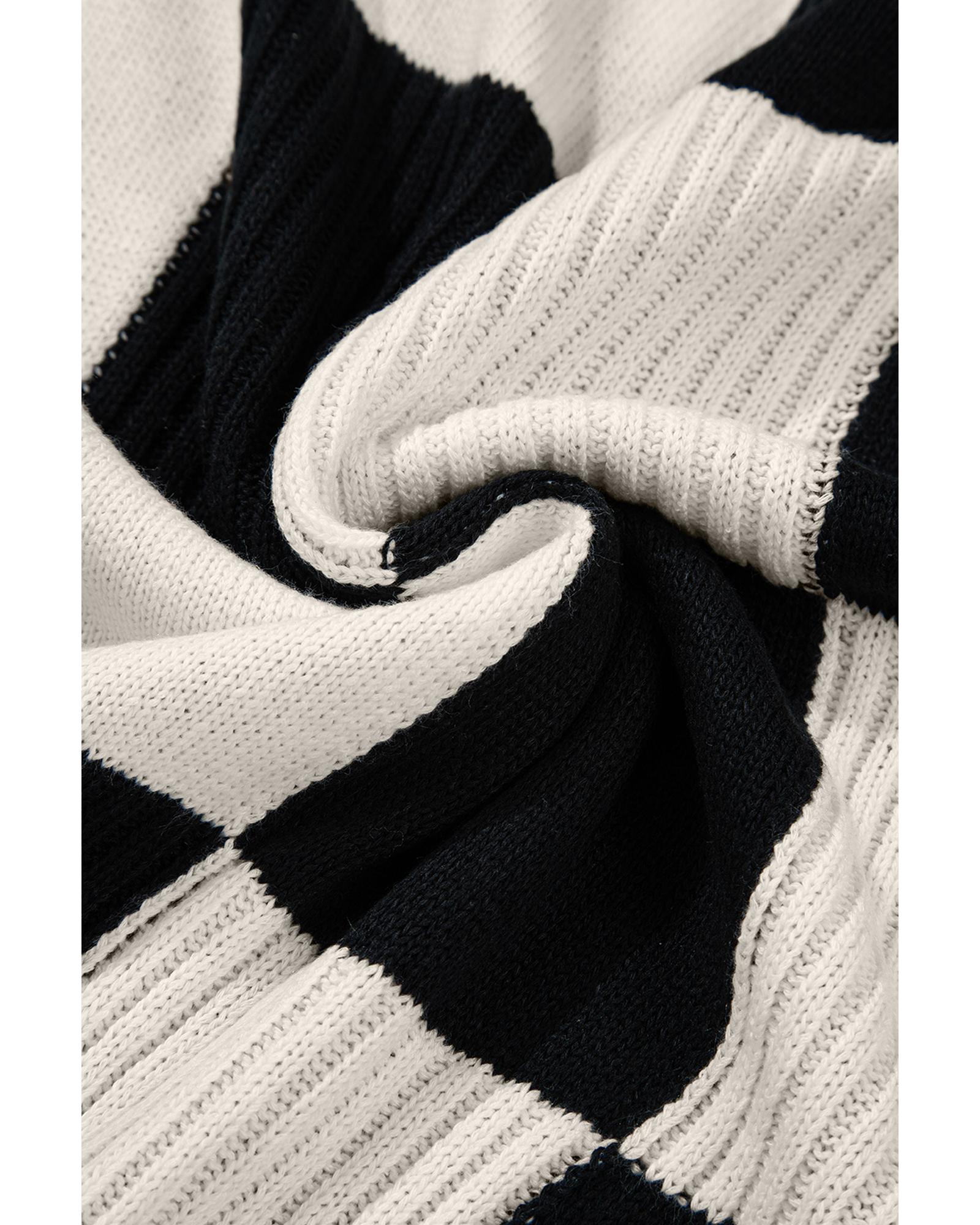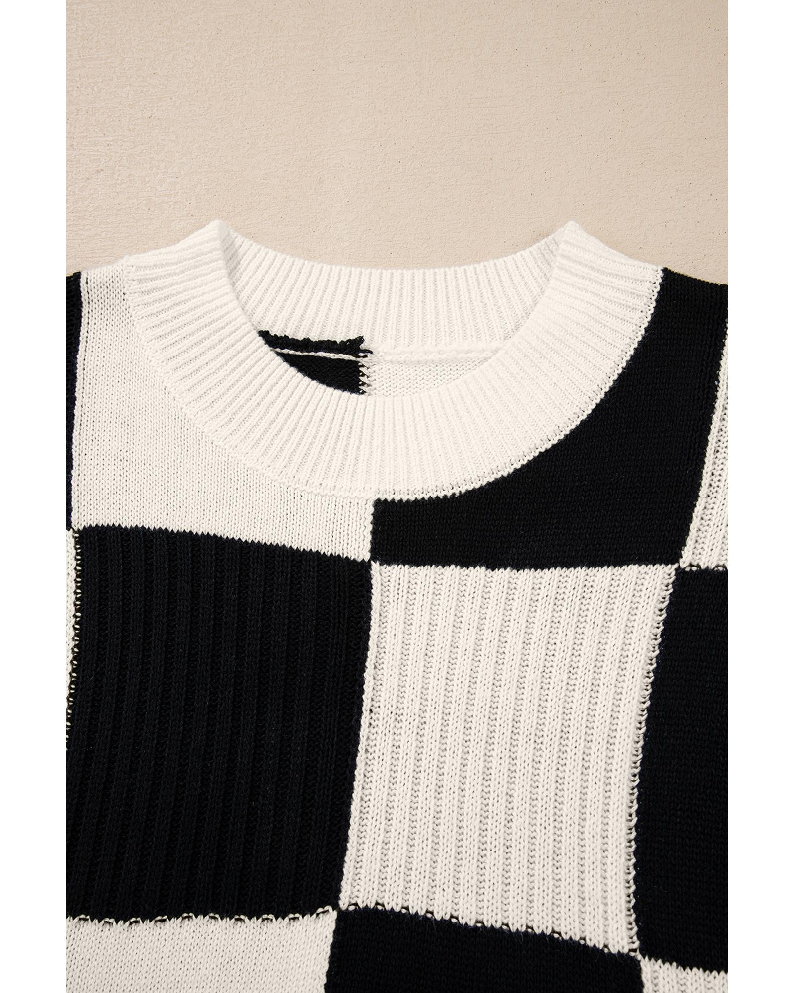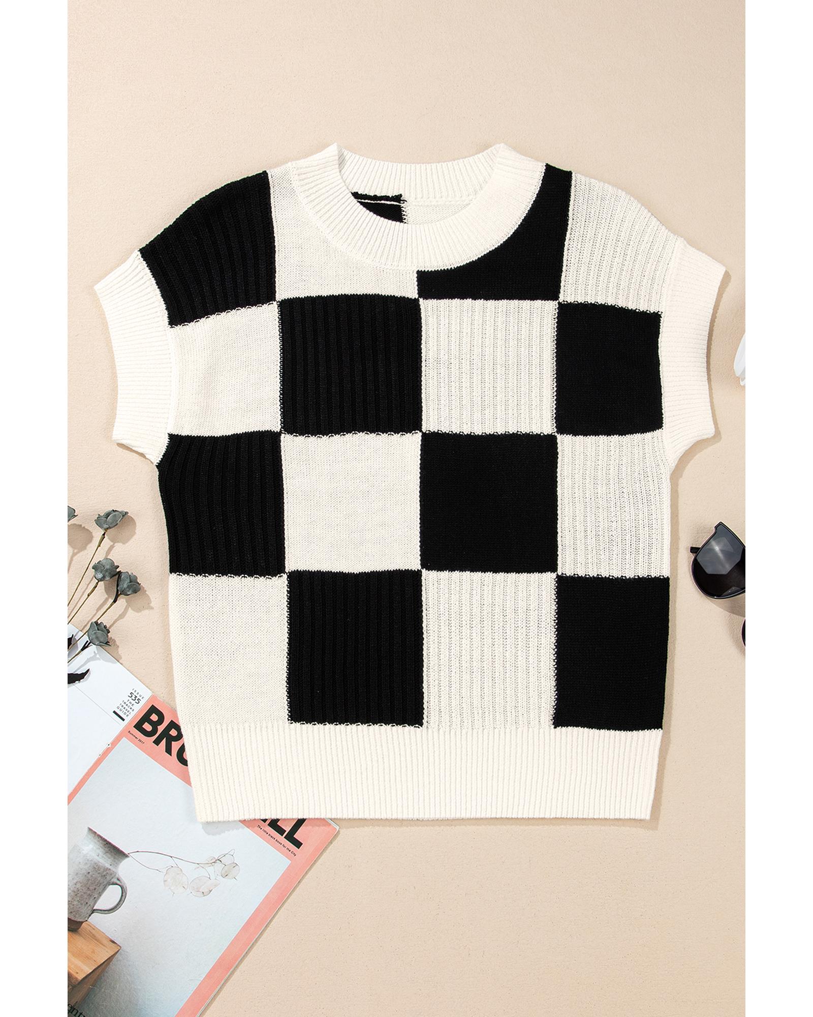 Black Checkered Color Block Crew Neck Short Sleeve Sweater – M