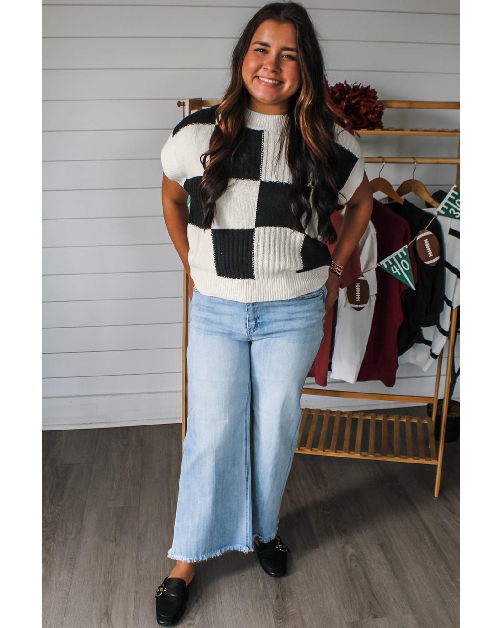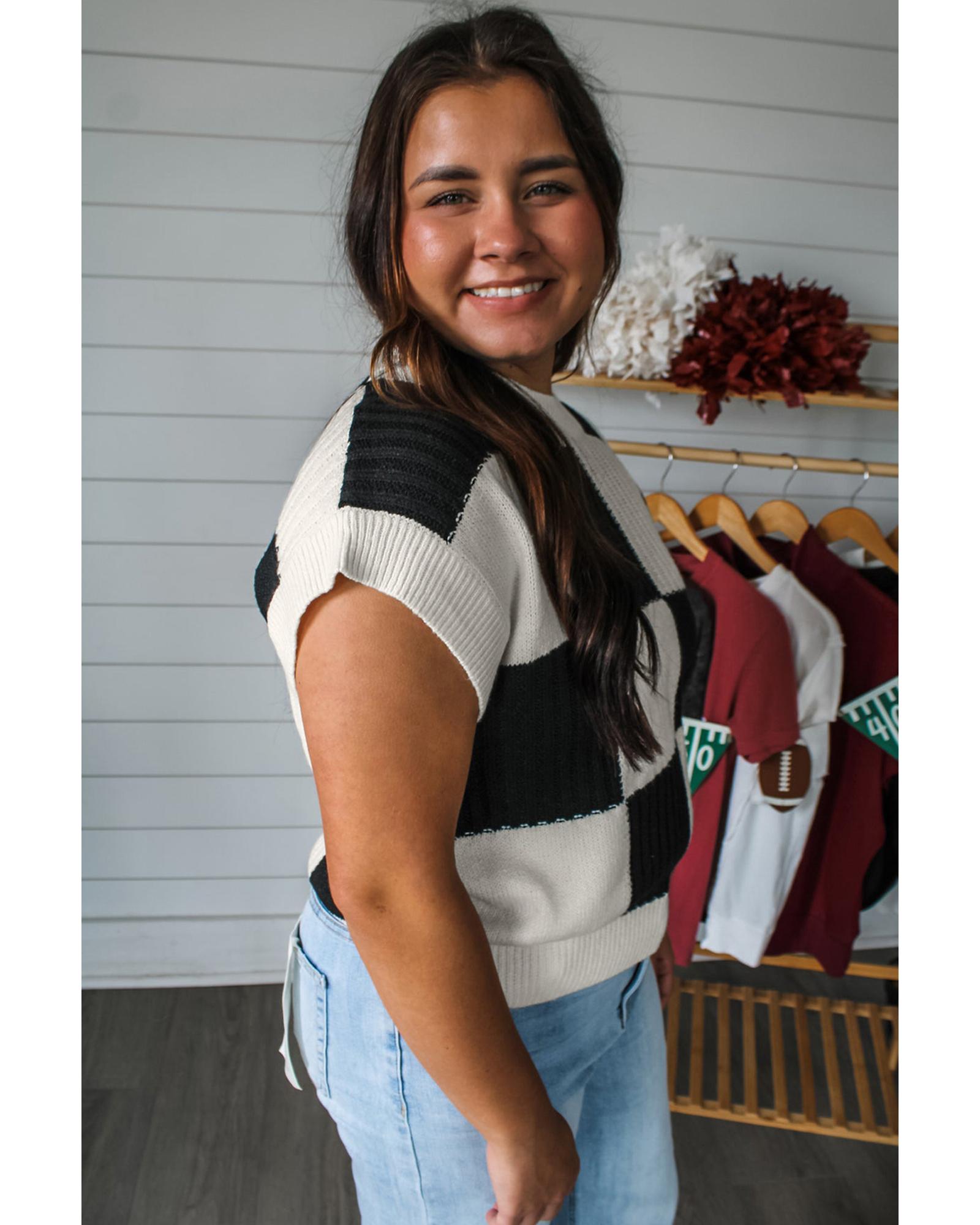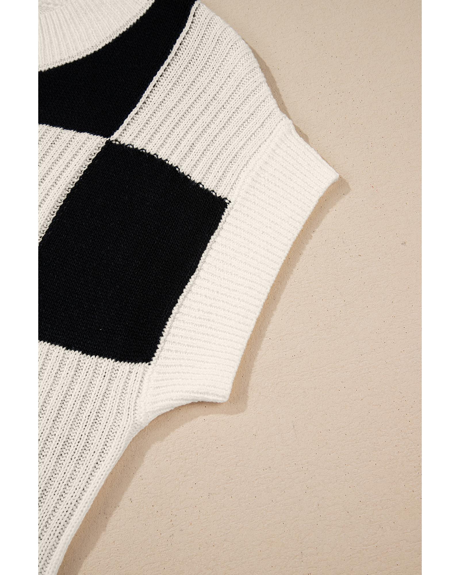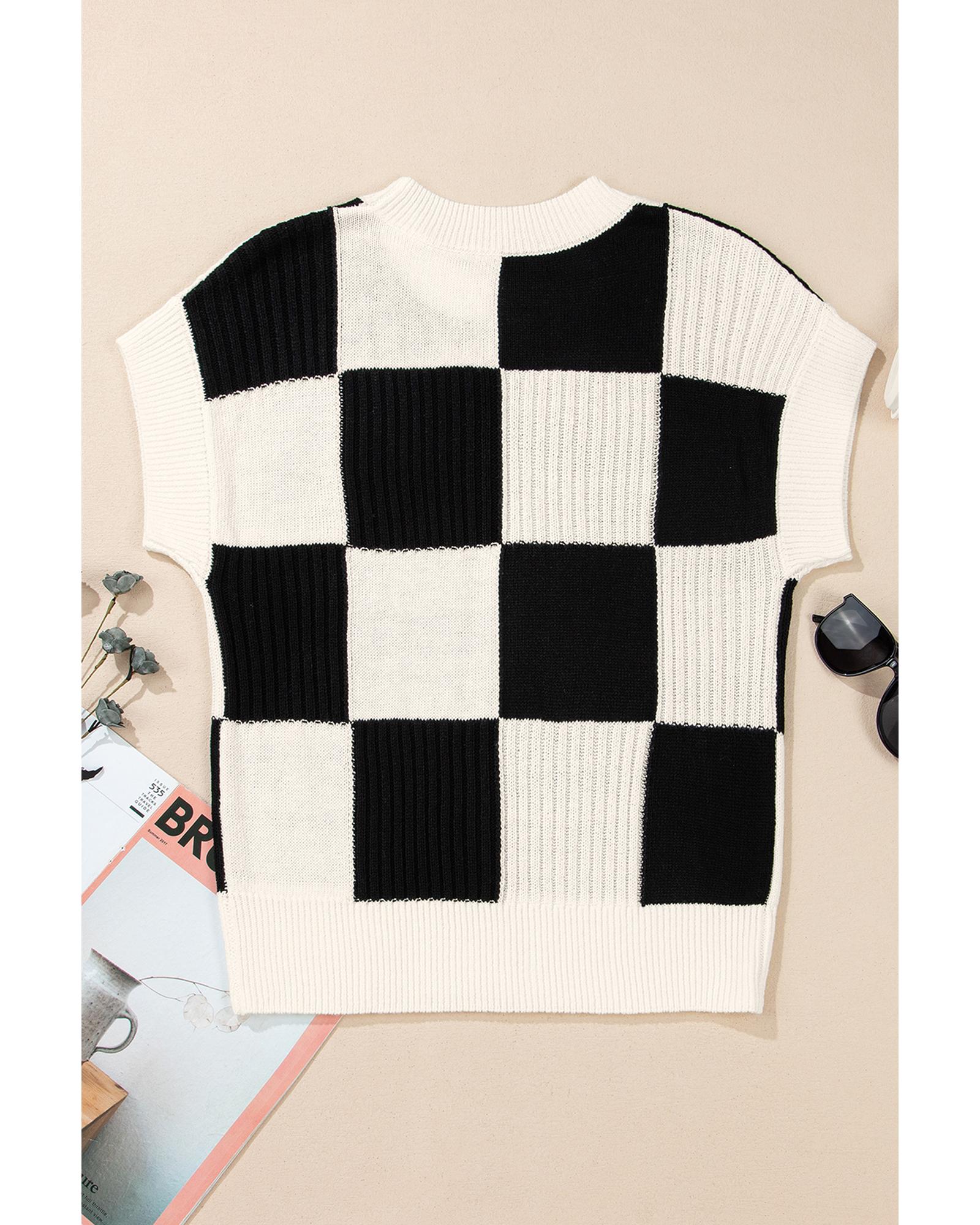 Black Checkered Color Block Crew Neck Short Sleeve Sweater – XL