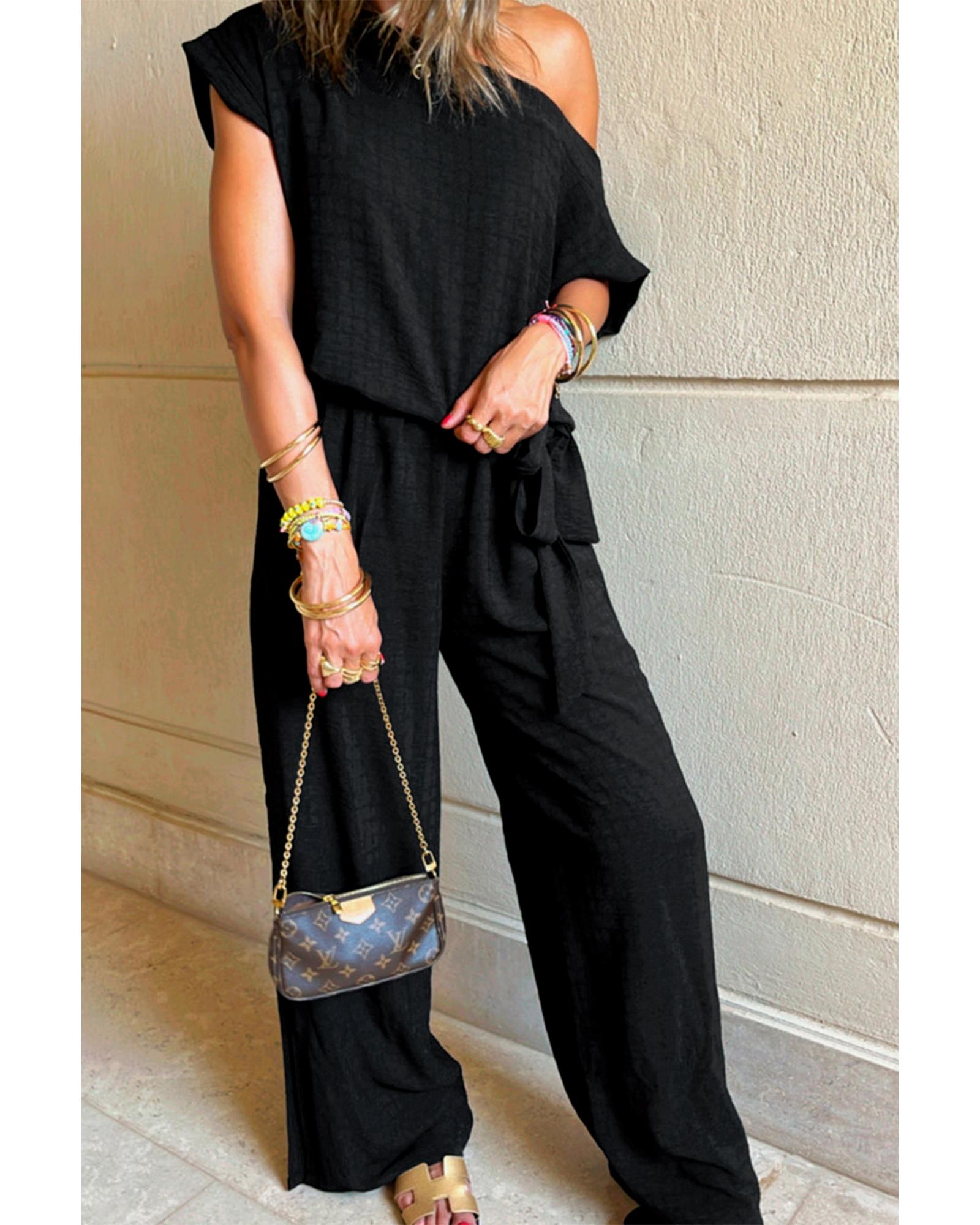 Black Checkered Mesh One Shoulder Short Sleeve Knotted Waist Jumpsuit - S