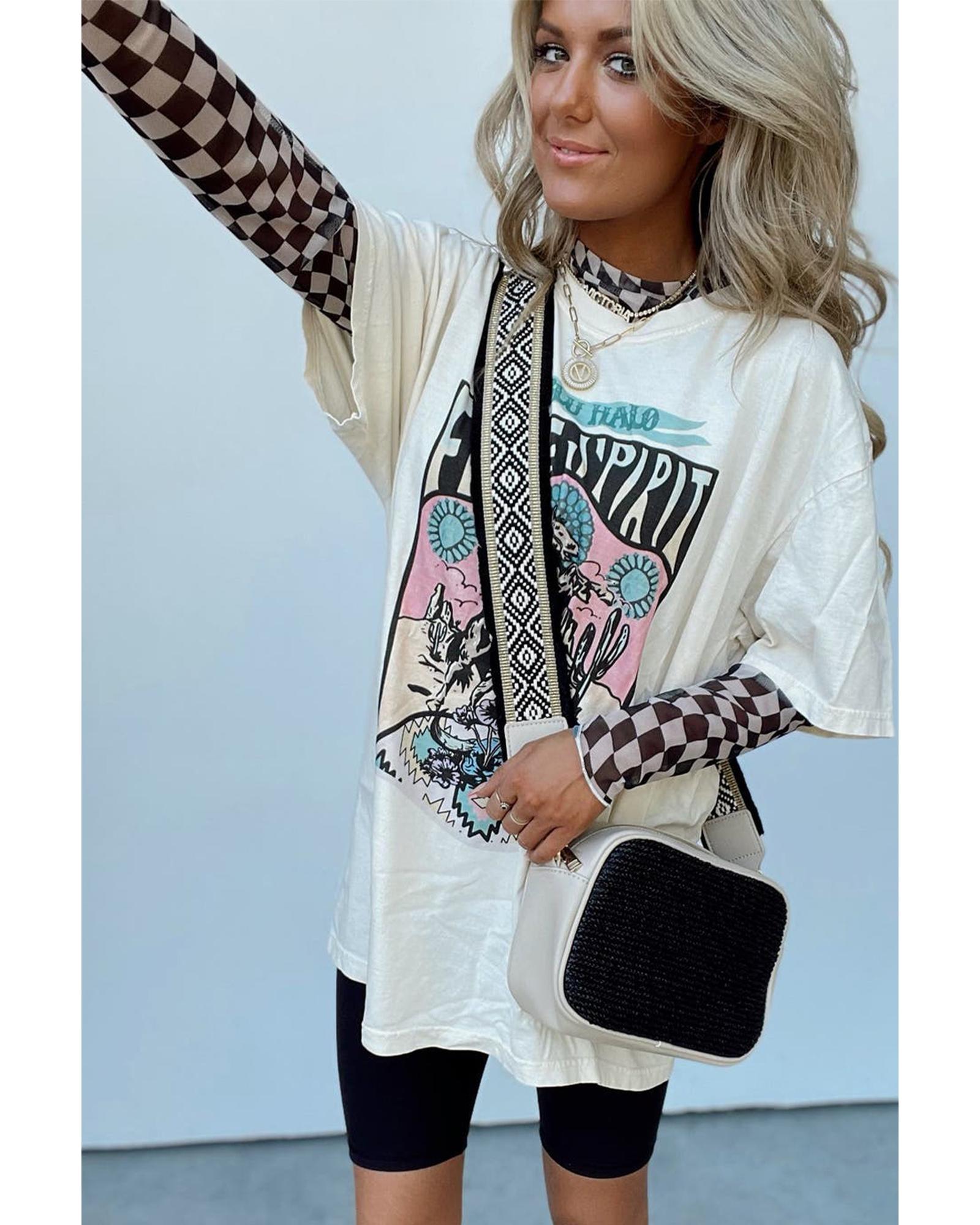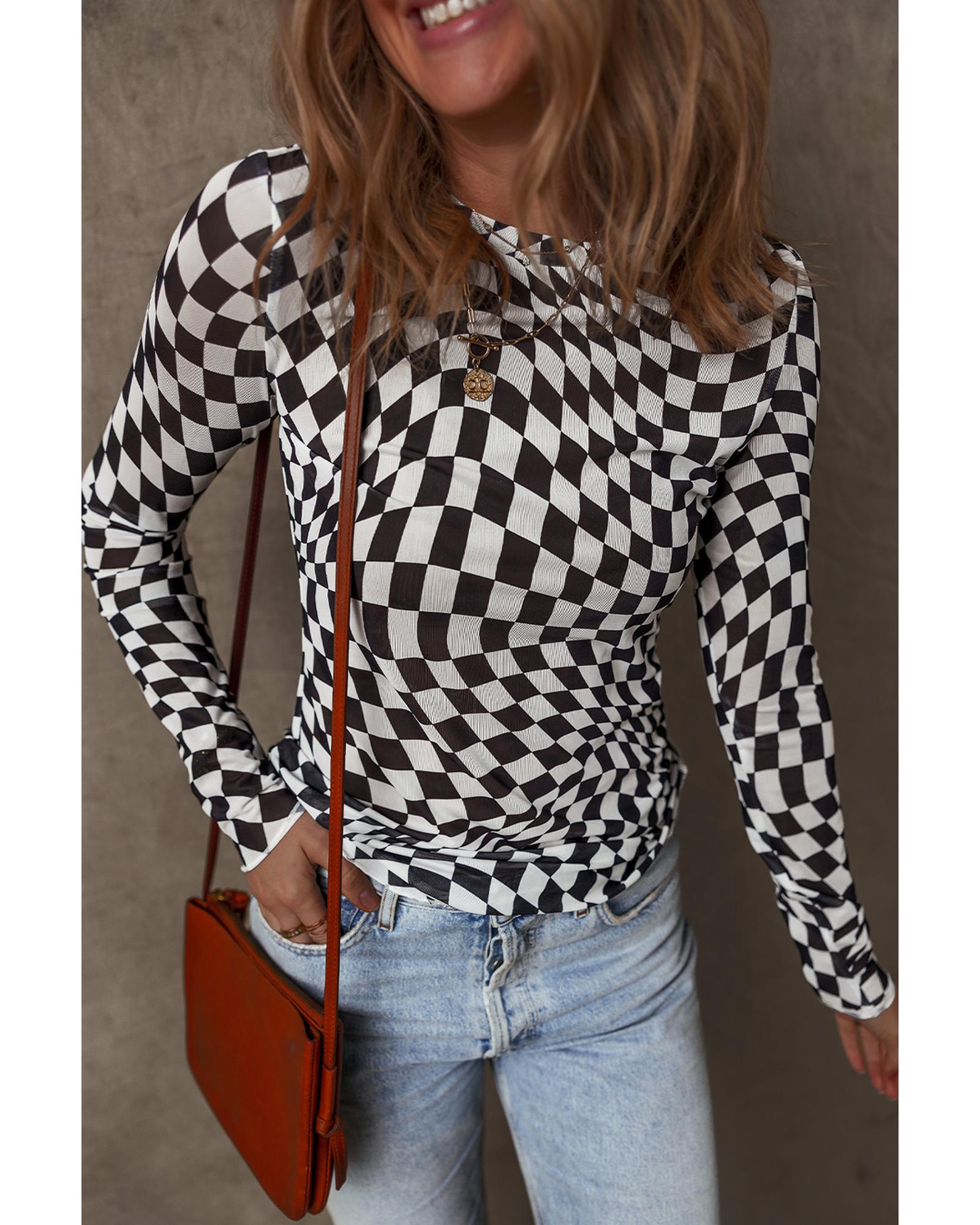 Black Checkered Pattern Mesh Mock Neck Long Sleeve Top – S