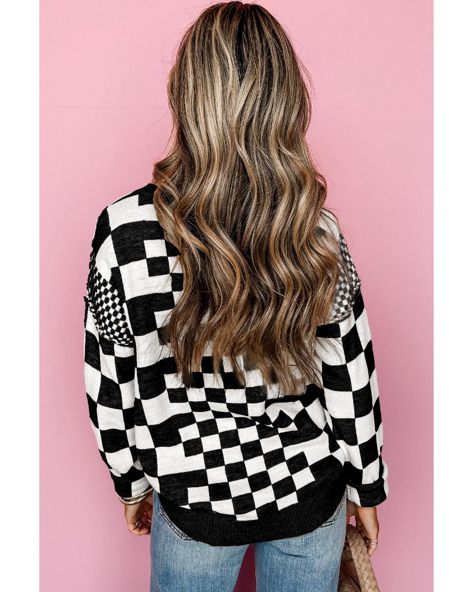 • Black Checkered Print Drop Shoulder Round Neck Sweater