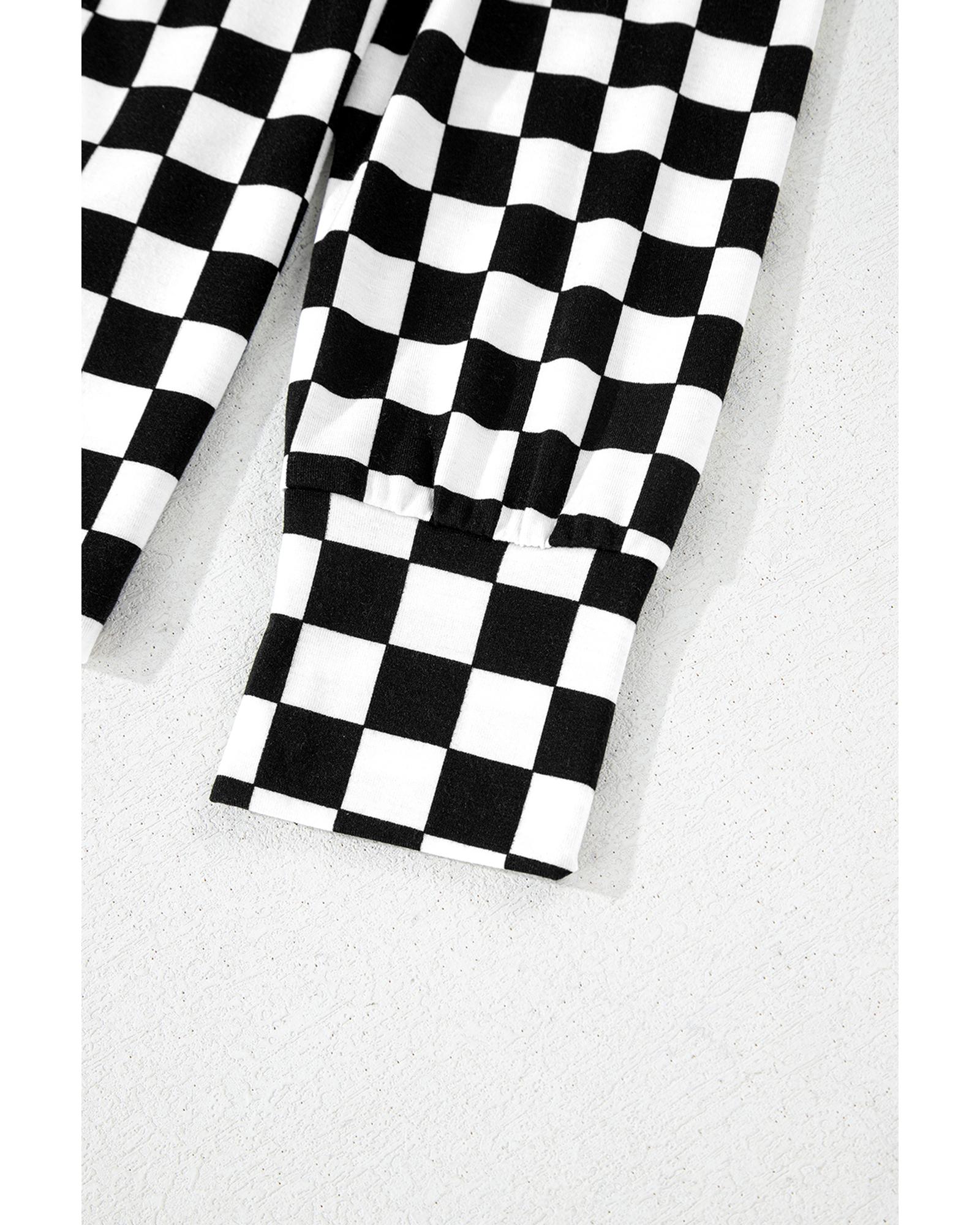 Black Checkered Print Long Sleeve Top and Pants Lounge Set – L