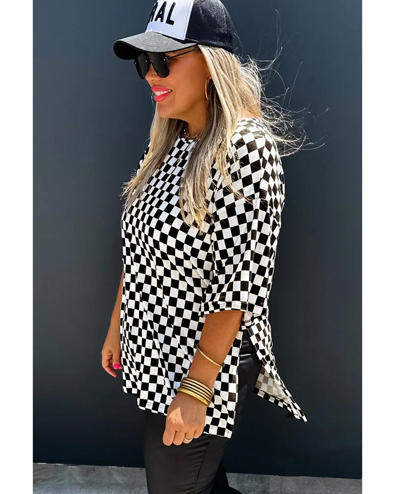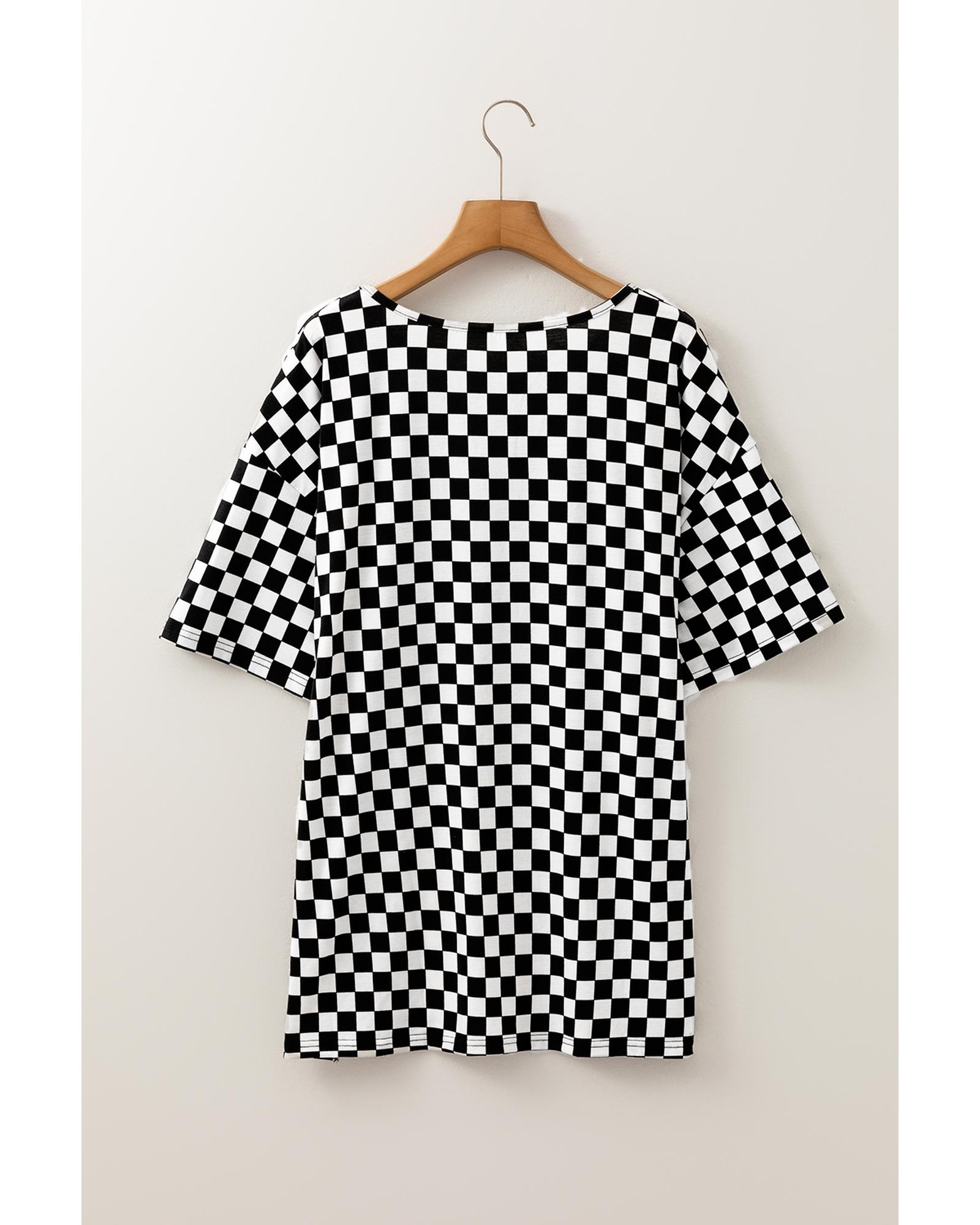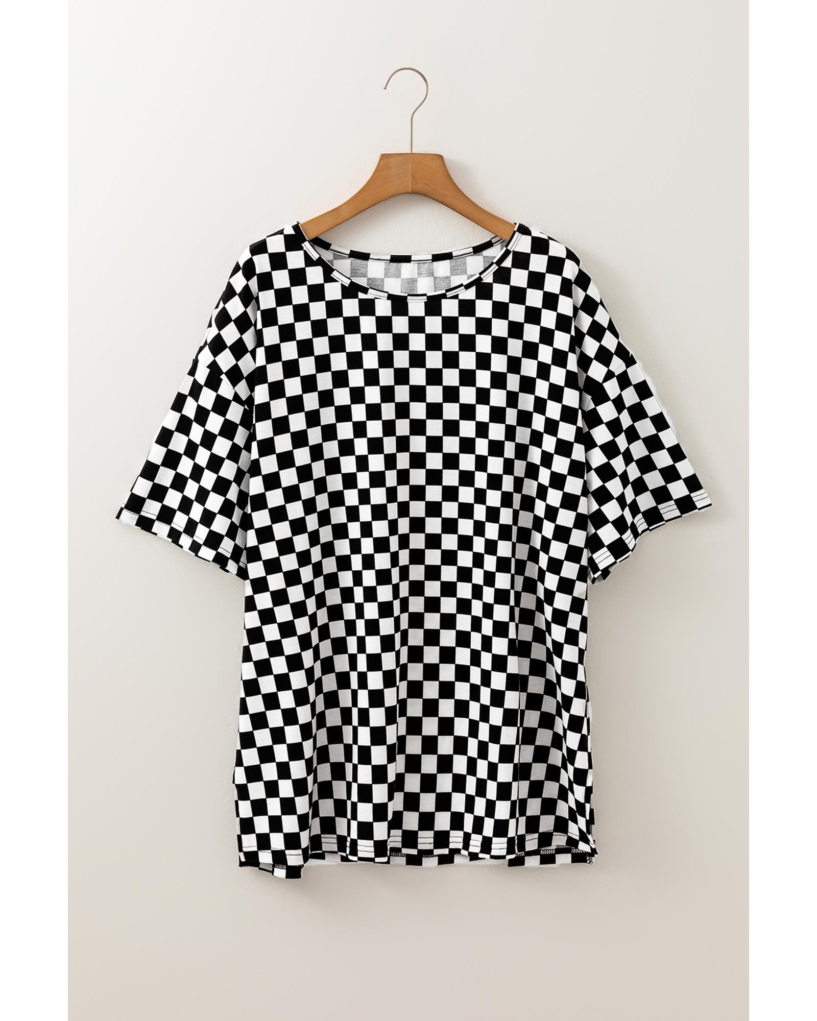 Black Checkered Print Side Slits O Neck Plus Size T Shirt – 1X