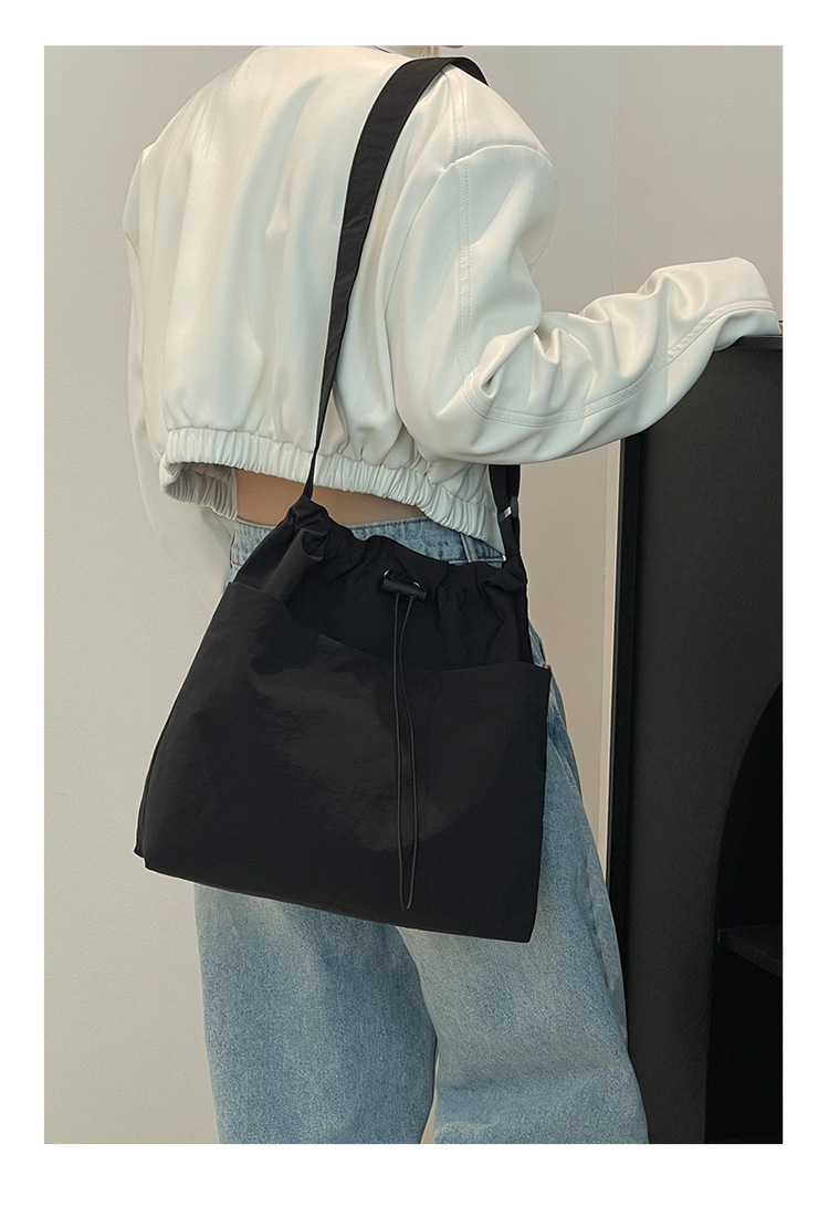 Black Chic Lightweight Nylon Drawstring Tote Bag – Multi-Pocket Casual Shoulder & Crossbody