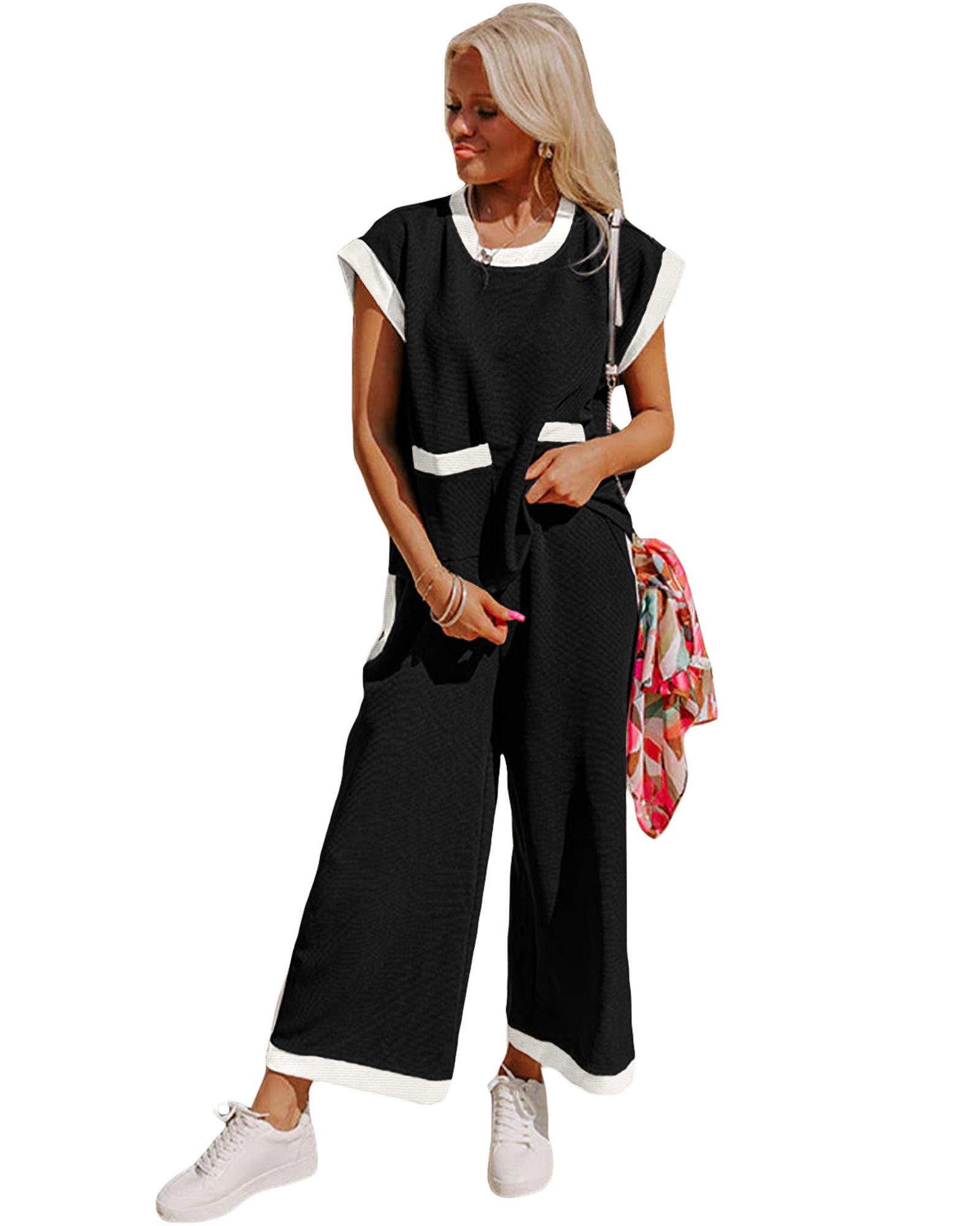 Black Color Block Pocketed T Shirt and Wide Leg Pants Set – 2XL