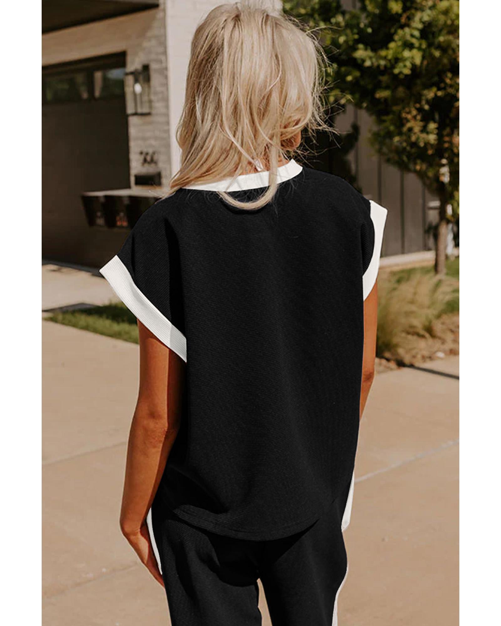 Black Color Block Pocketed T Shirt and Wide Leg Pants Set – M