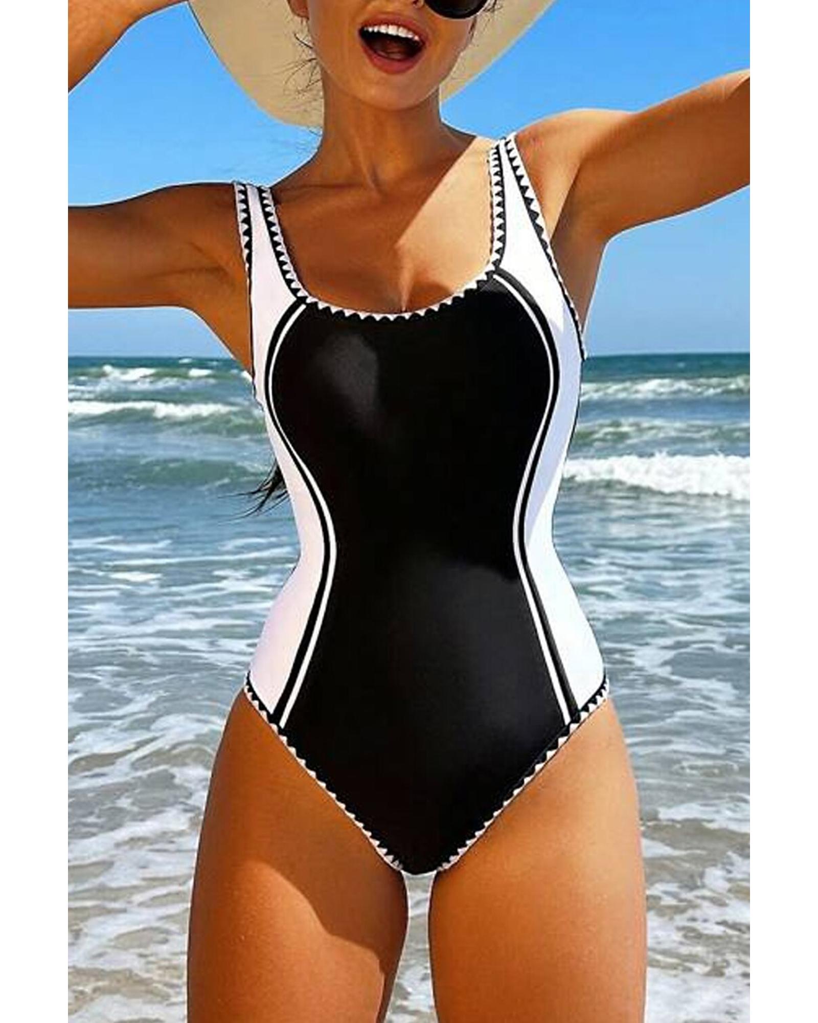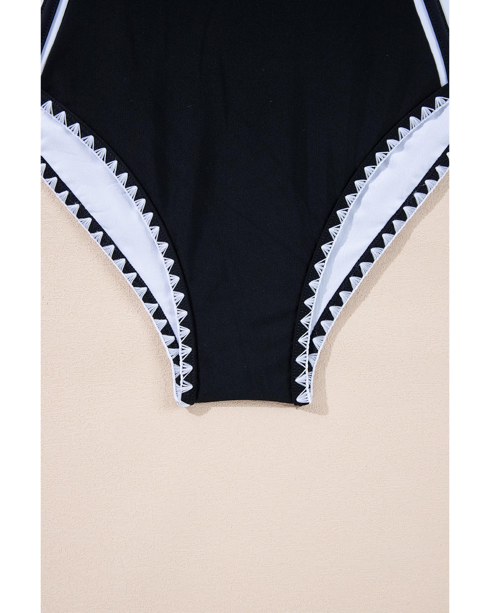 Black Color Block Ric Rac Trim U Neck One Piece Swimsuit – XL