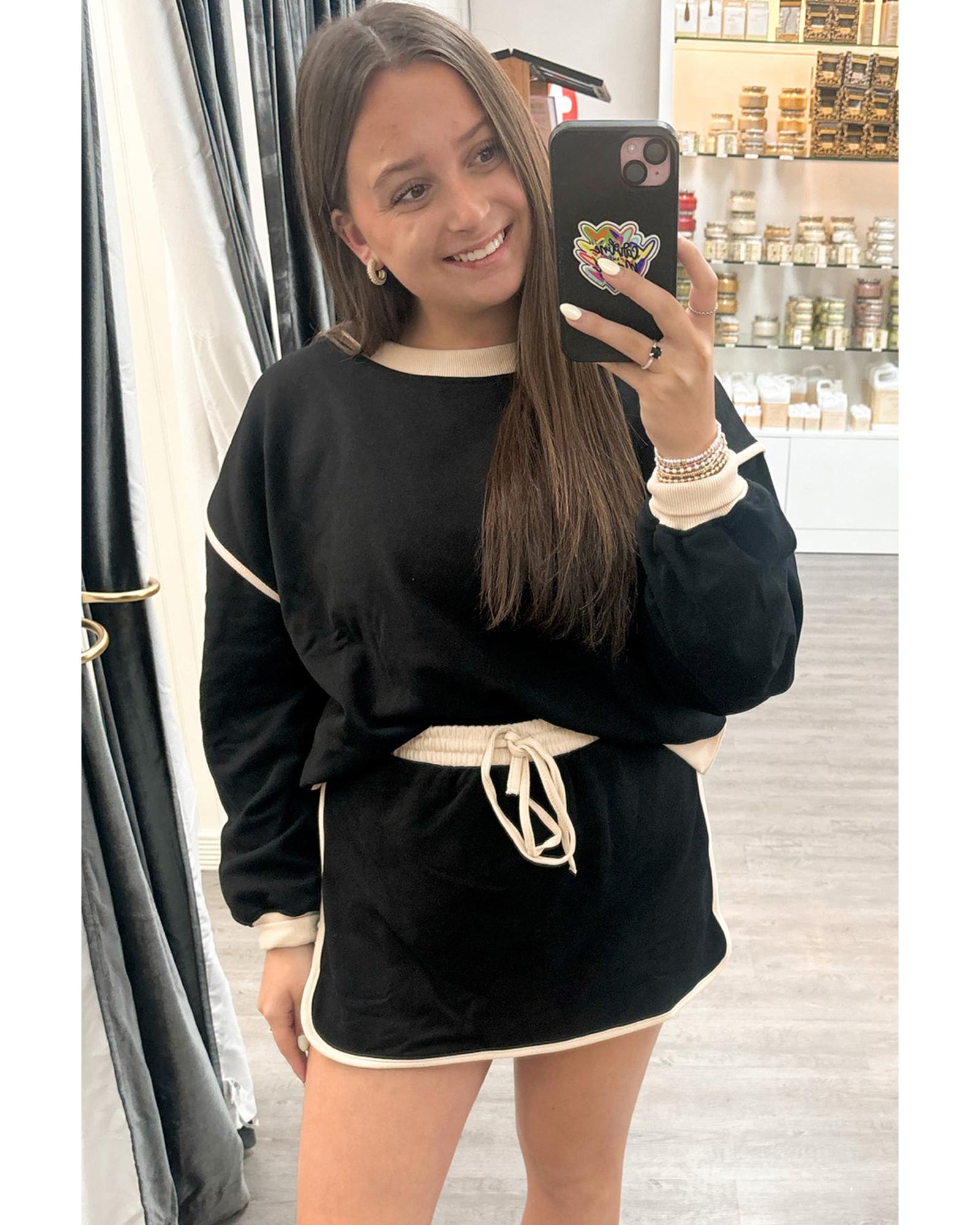 Black Color Contrast Loose Pullover and Lace-up Waist Skort Set – L