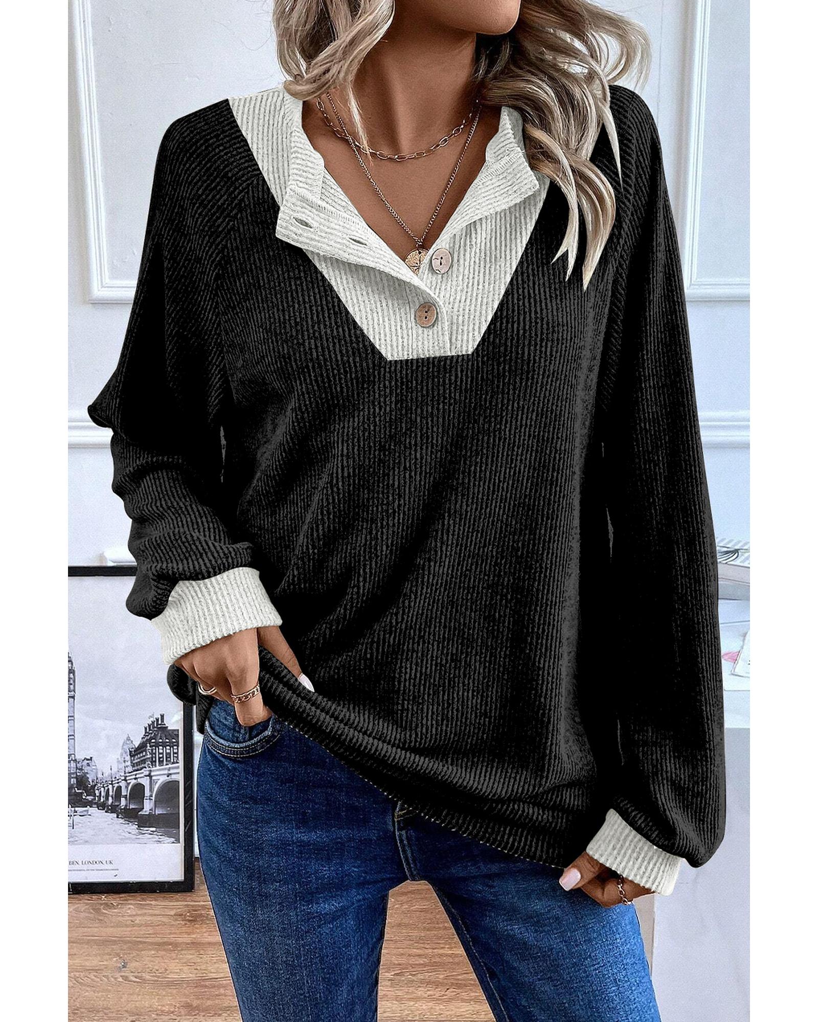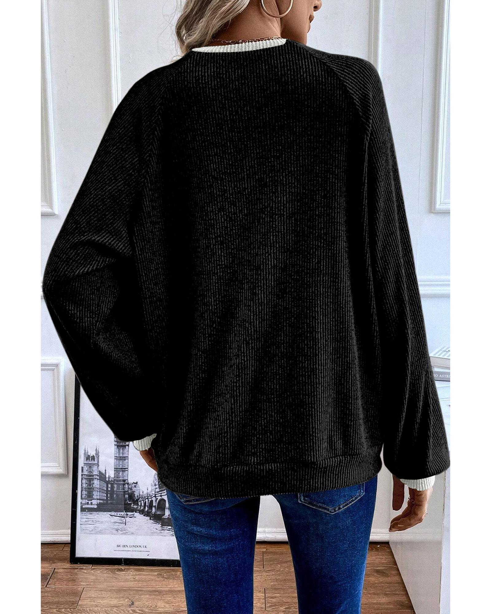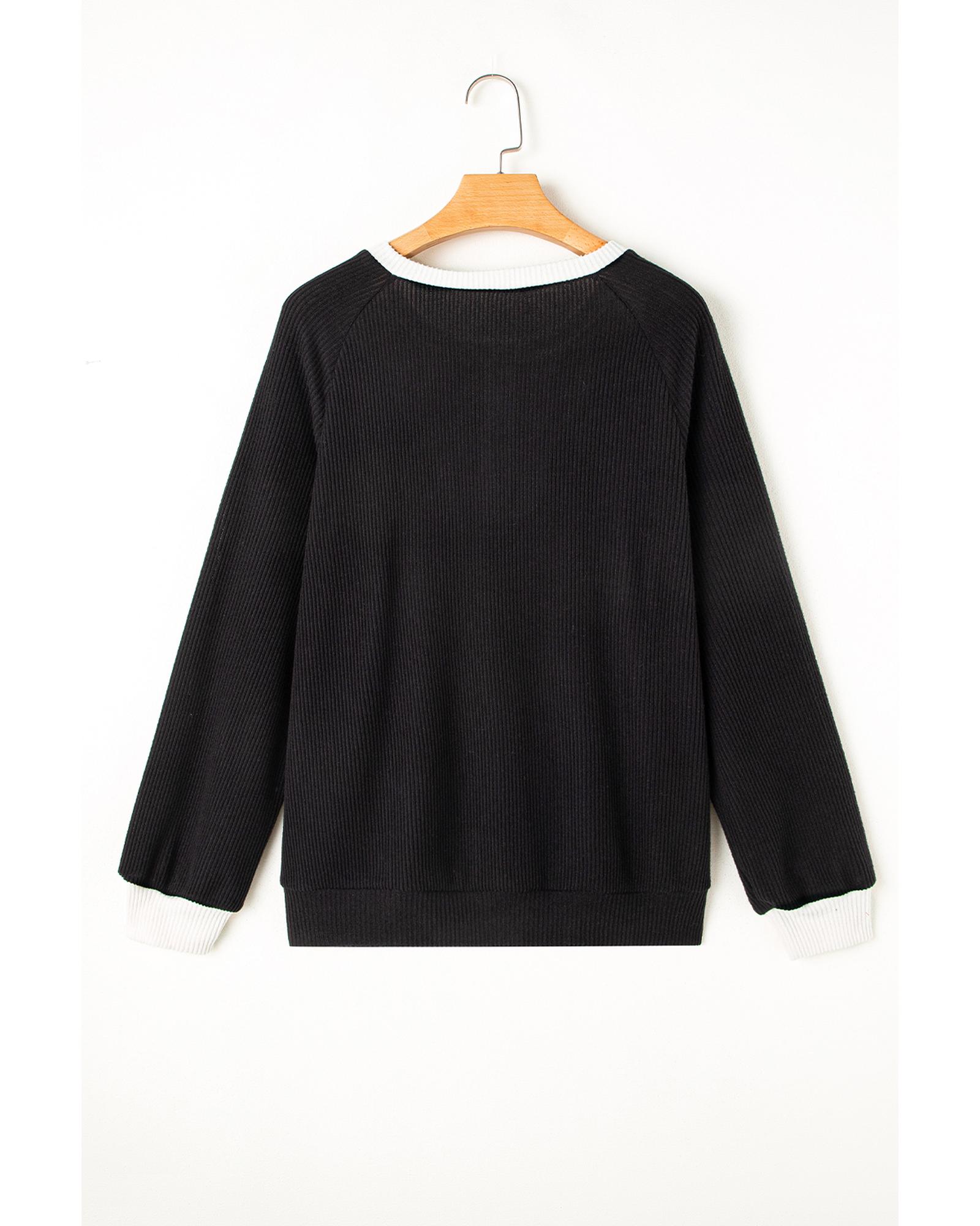 Black Color Contrast Ribbed Loose Fit Long Sleeve Top – S