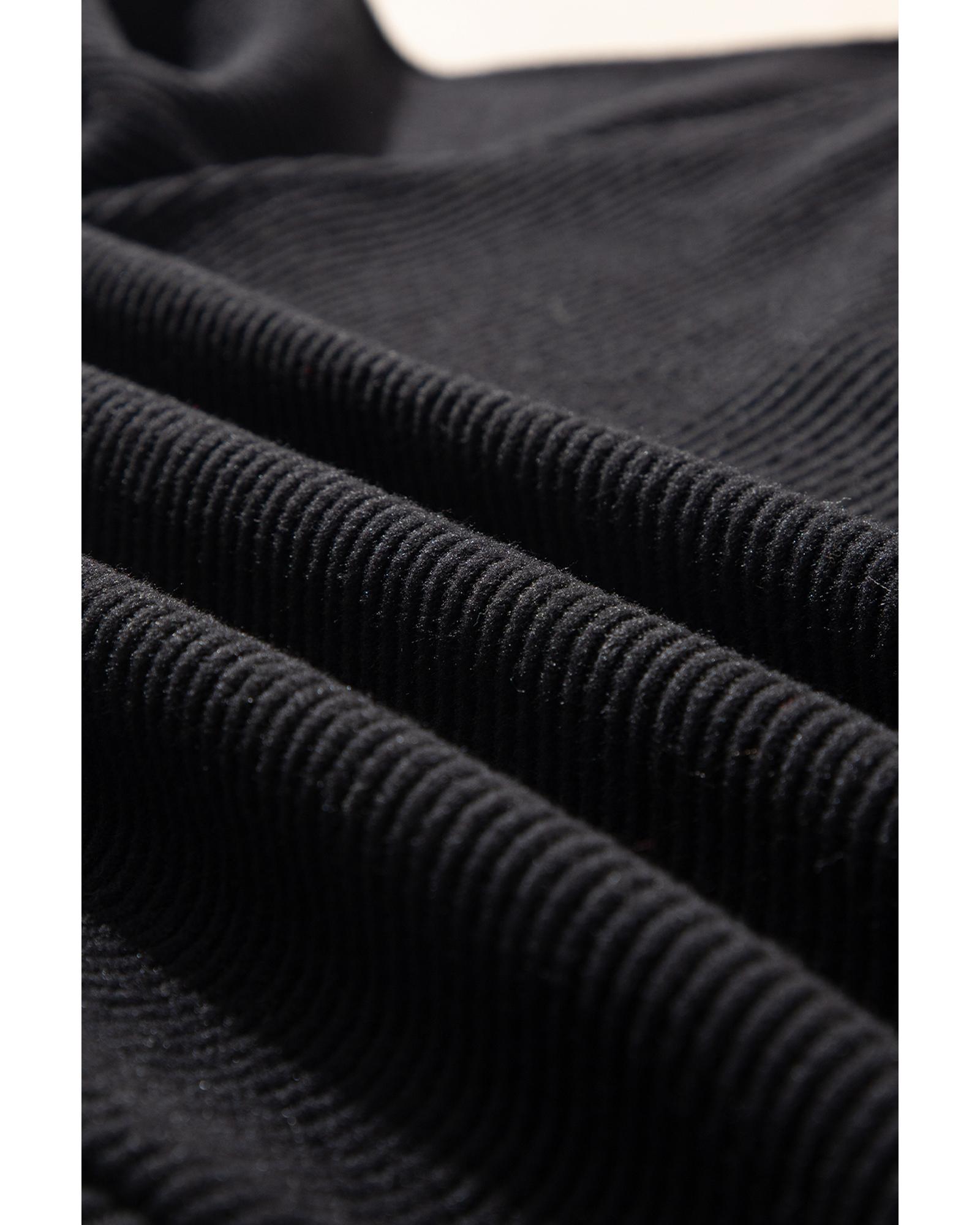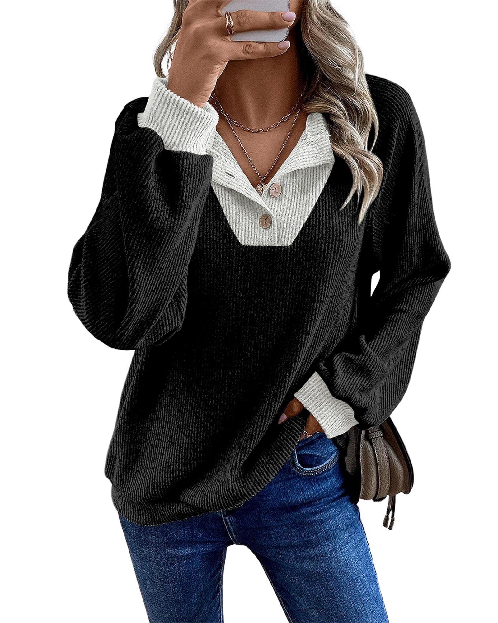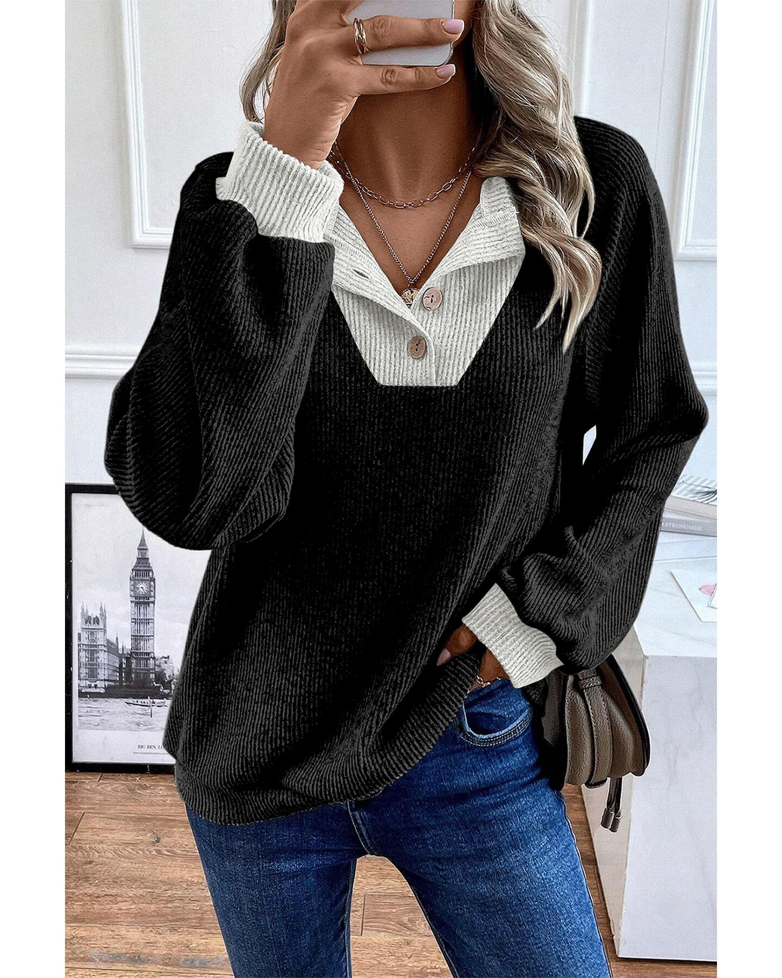 Black Color Contrast Ribbed Loose Fit Long Sleeve Top – S